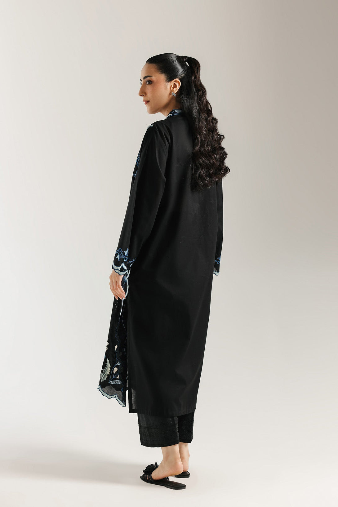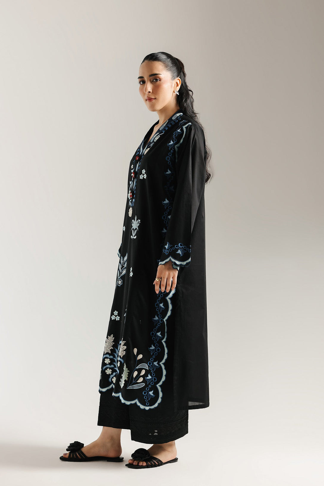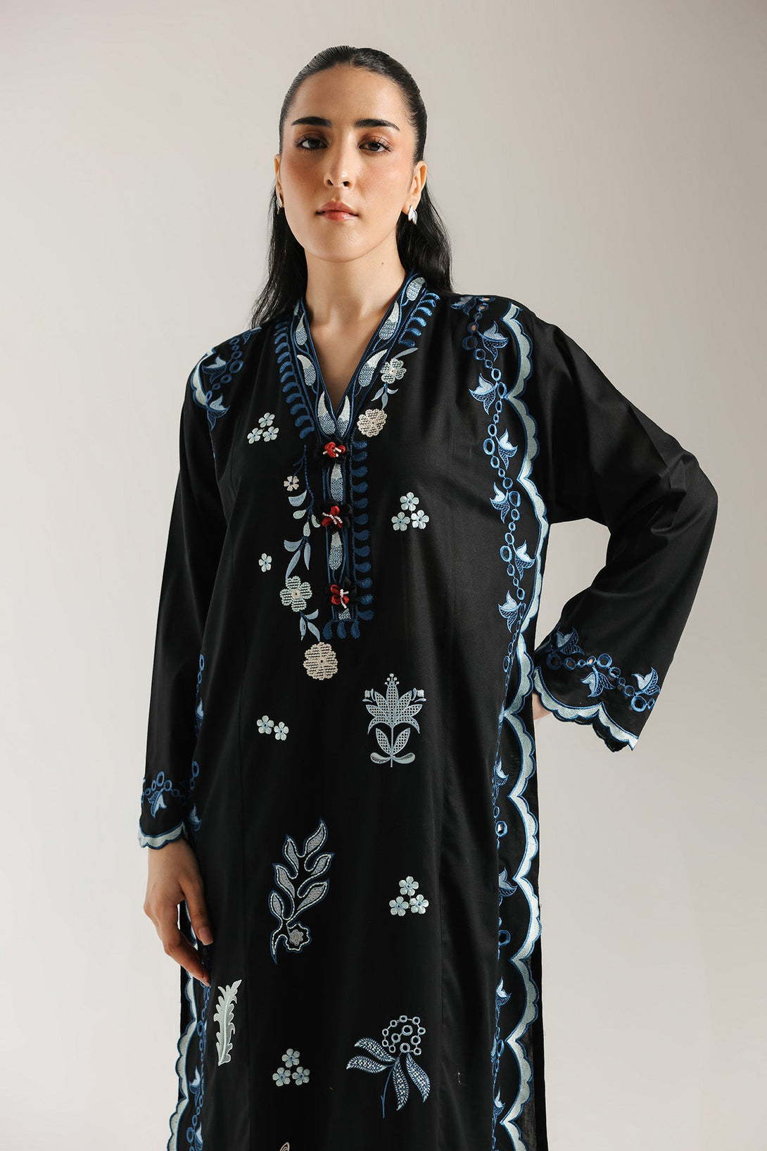 A striking silhouette brought to life by exquisite details. This long shirt is a canvas of classic elegance, featuring a bold black base and intricate folkloric embroidery in serene shades of light and royal blue. The mesmerizing patterns flow gracefully from the neckline to the scalloped hem, while the full sleeves are adorned with complementary motifs. This is a timeless piece that beautifully blends traditional artistry with a sophisticated, modern aesthetic.