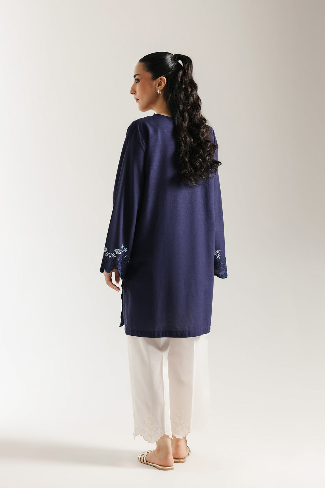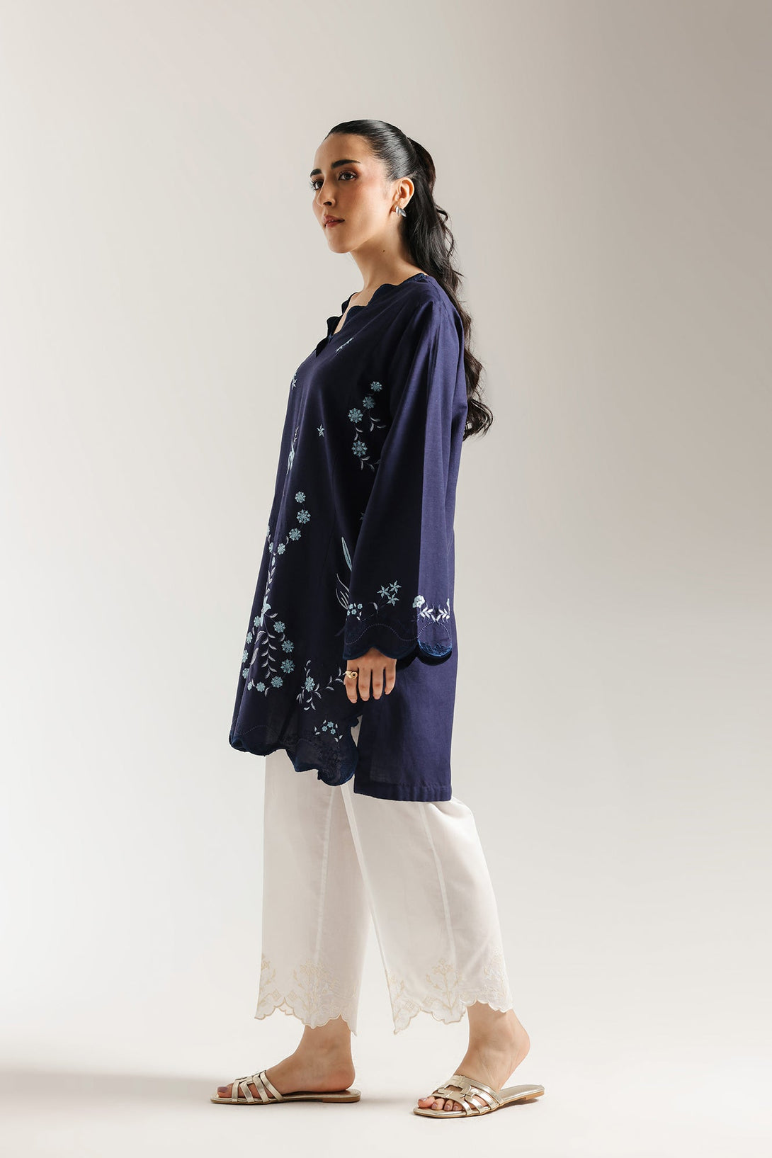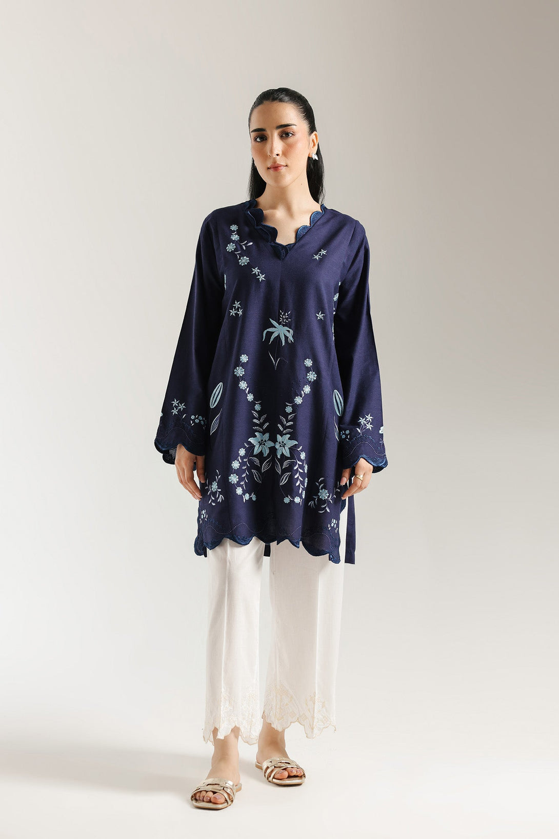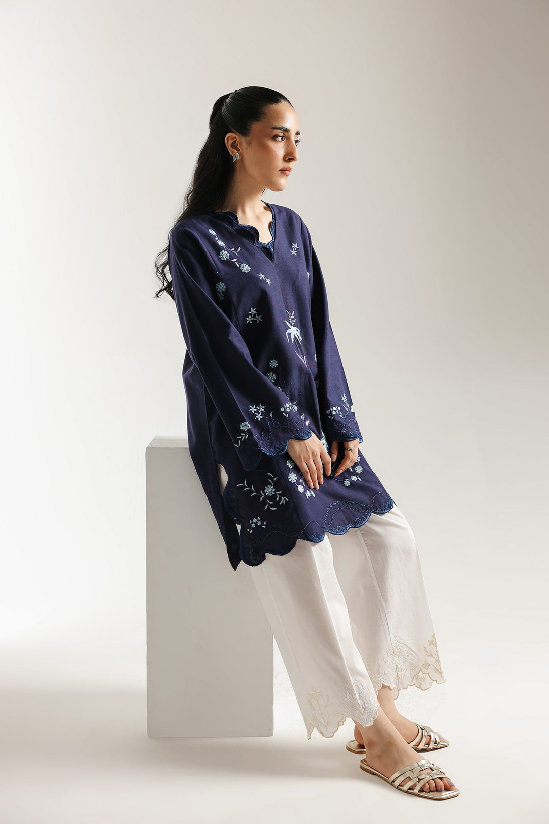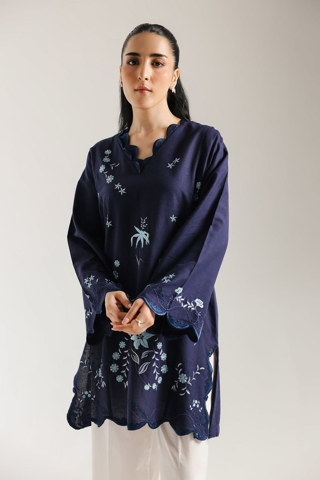 Dive into the depths of elegant style. This beautiful embroidered shirt features a rich, deep navy blue fabric that serves as a stunning backdrop for the intricate floral embroidery in soft blue and white. The graceful scalloped neckline and hem add a touch of delicate charm, while the relaxed fit and detailed sleeves make it a truly sophisticated piece. This shirt is a testament to refined design and serene beauty.