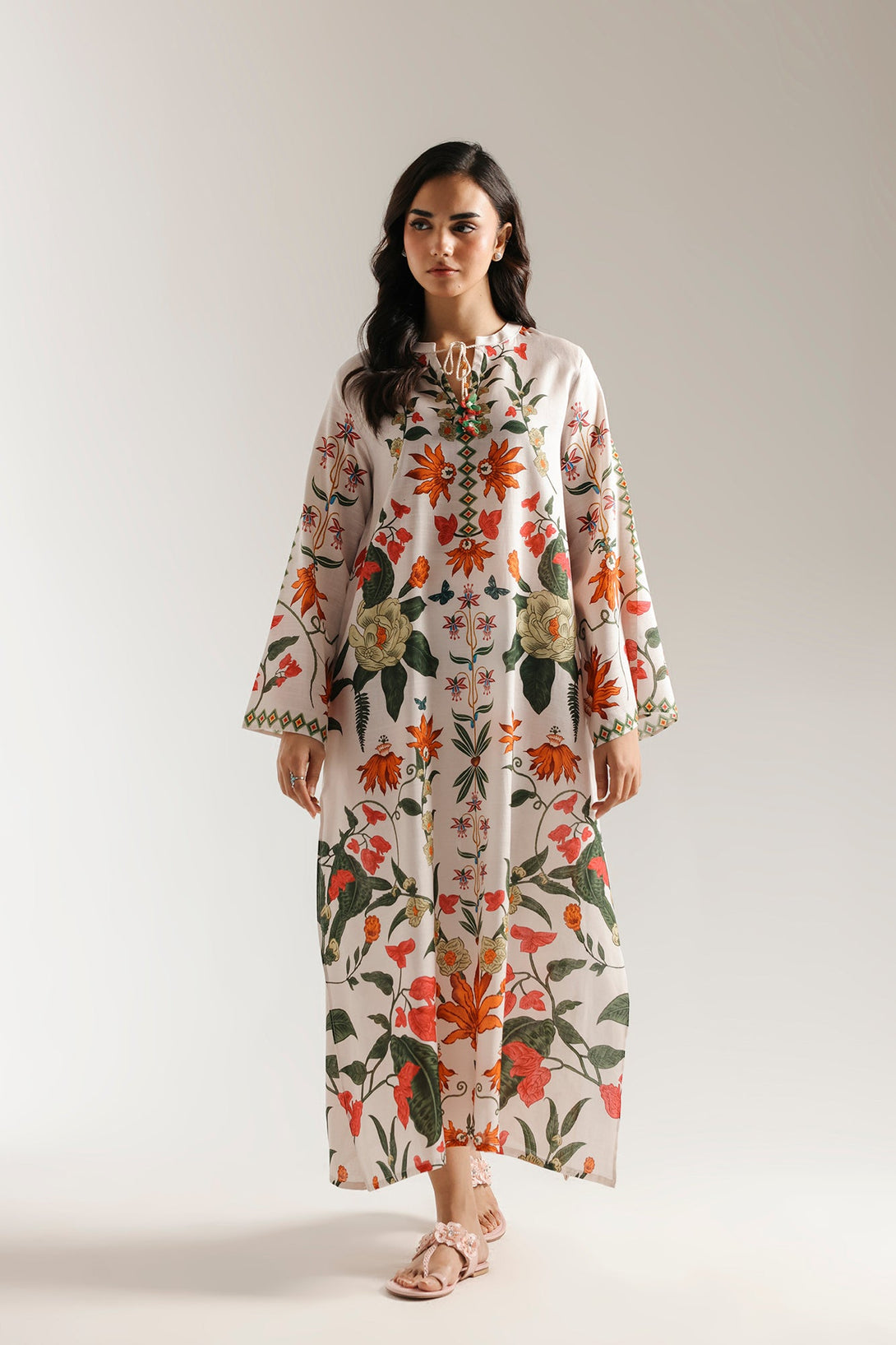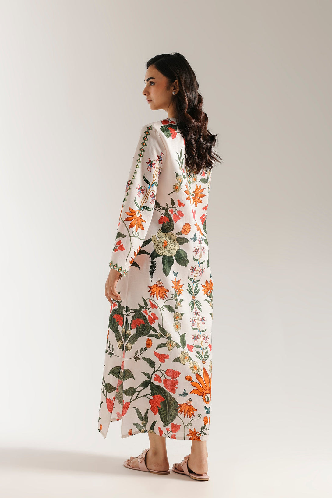 This piece is a celebration of vibrant floral artistry, showcasing a beautiful garden-inspired print with bold, blossoming flowers and intricate botanical details. The elegant long shirt, crafted from a soft, flowing fabric, offers a relaxed silhouette and graceful drape. The neckline features delicate tie-up detailing, adding a touch of bohemian charm to the classic design. Perfect for a leisurely day out or a stylish gathering, this versatile shirt brings a fresh and enchanting feel to your wardrobe.