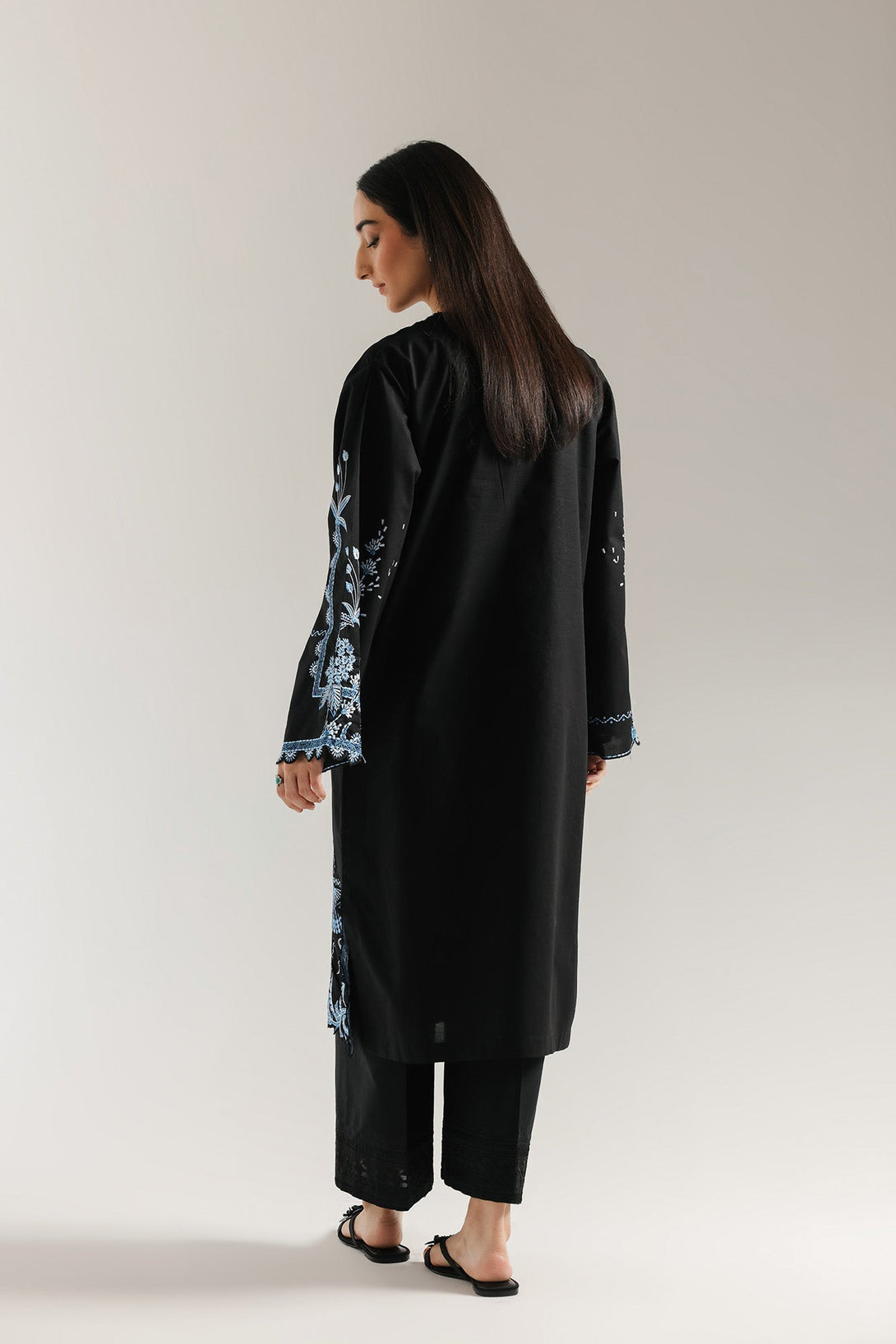 Immerse yourself in the timeless elegance of this stunning embroidered shirt. This beautiful black shirt features a comfortable, flowing silhouette. It is adorned with intricate blue floral and geometric embroidery throughout, creating a look that is both modern and elegant. The shirt has a classic V-neckline and full sleeves. With its relaxed fit and unique design, this shirt is perfect for making a sophisticated statement at any event.
