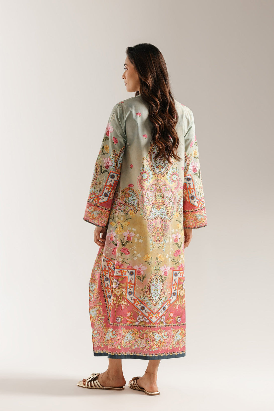 Elegance is captured in this enchanting printed shirt. Crafted in a serene light green, this shirt features a stunning, intricate panelled print that blends vibrant floral and traditional motifs in a captivating mix of pink, orange, and gold. The graceful, flowing silhouette and wide sleeves give it a relaxed yet sophisticated feel, while the tasseled neckline adds a touch of bohemian charm.