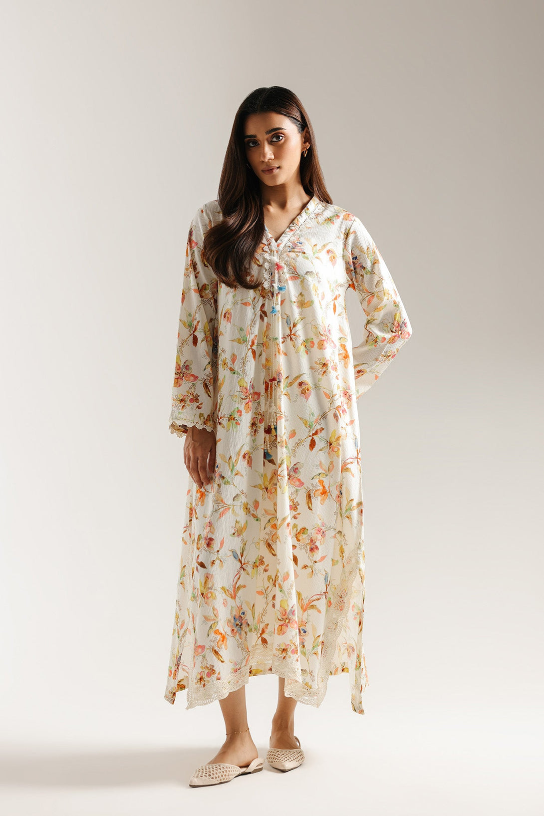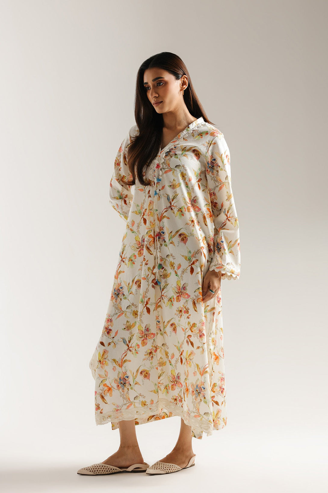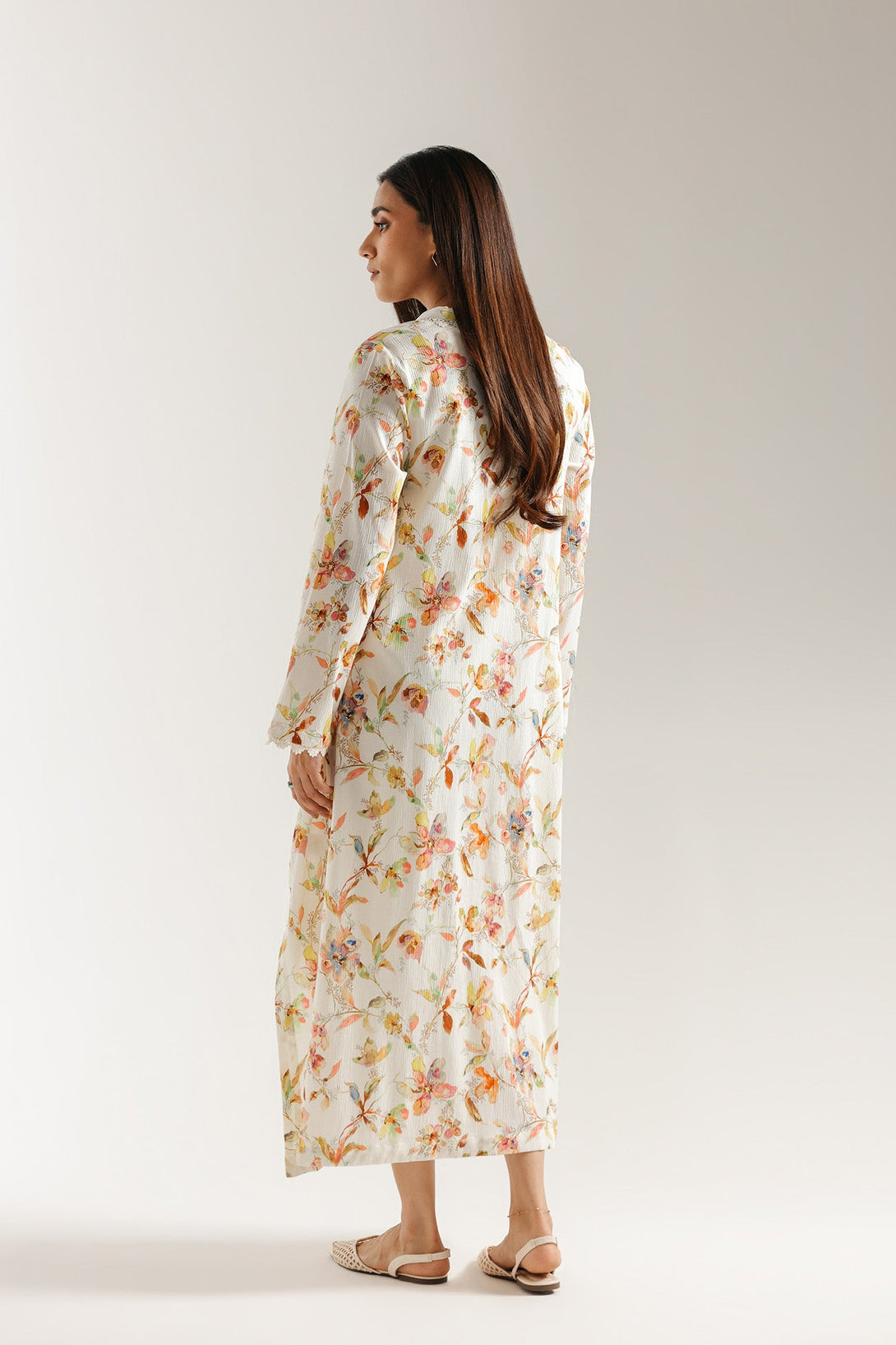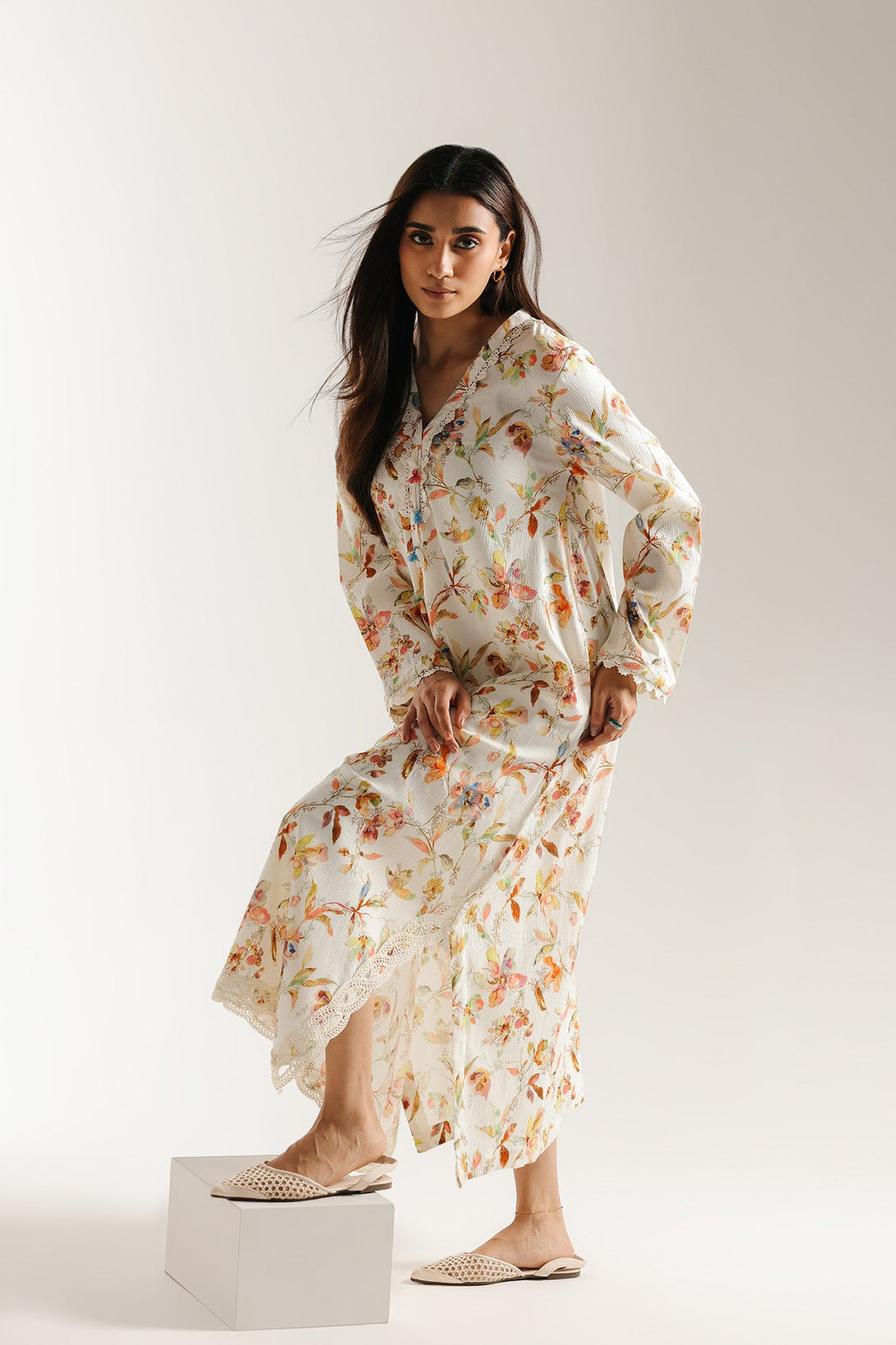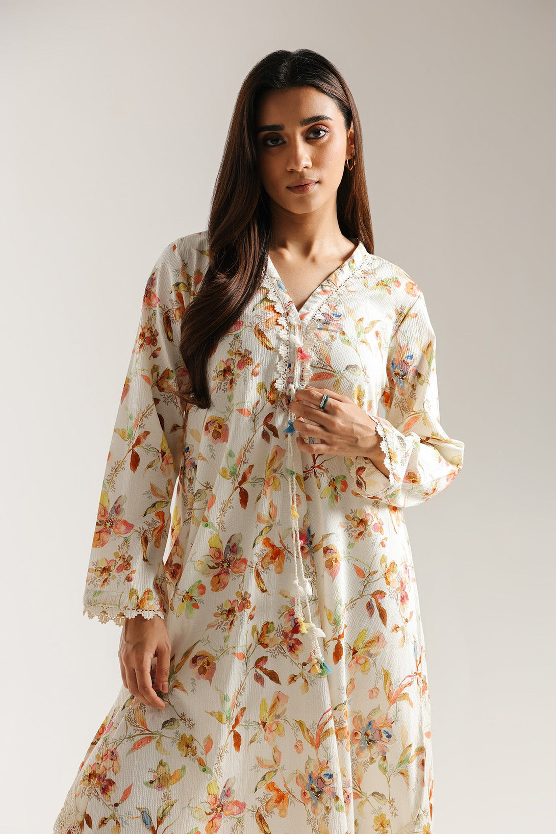 Float through your day in this ethereal embroidered shirt. Crafted in a light, flowing fabric, this long shirt is adorned with a delicate, all-over floral print in a beautiful mix of pastel shades. The intricate embroidered trims adds a touch of charm, while the scalloped lace hemline completes its graceful silhouette. With its soft colors and elegant design, this shirt is a perfect choice for a serene and sophisticated look.