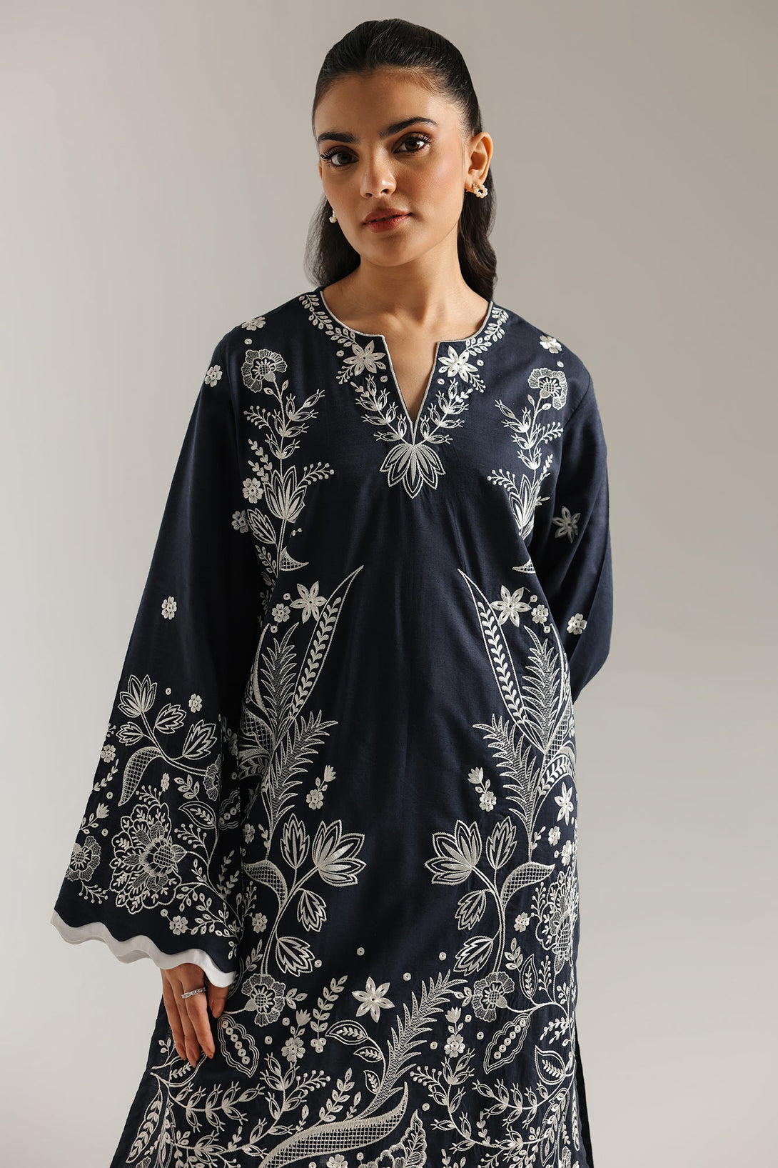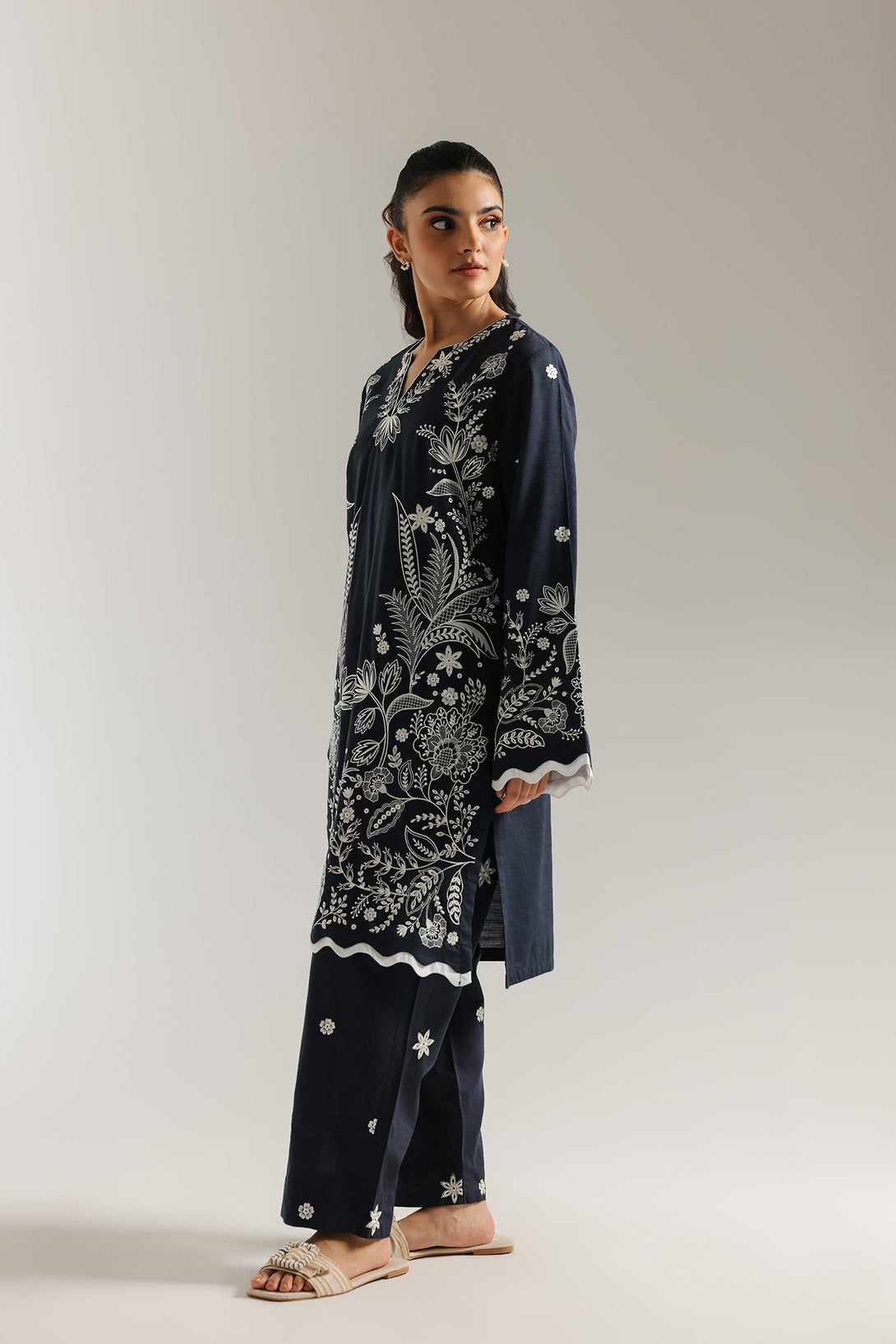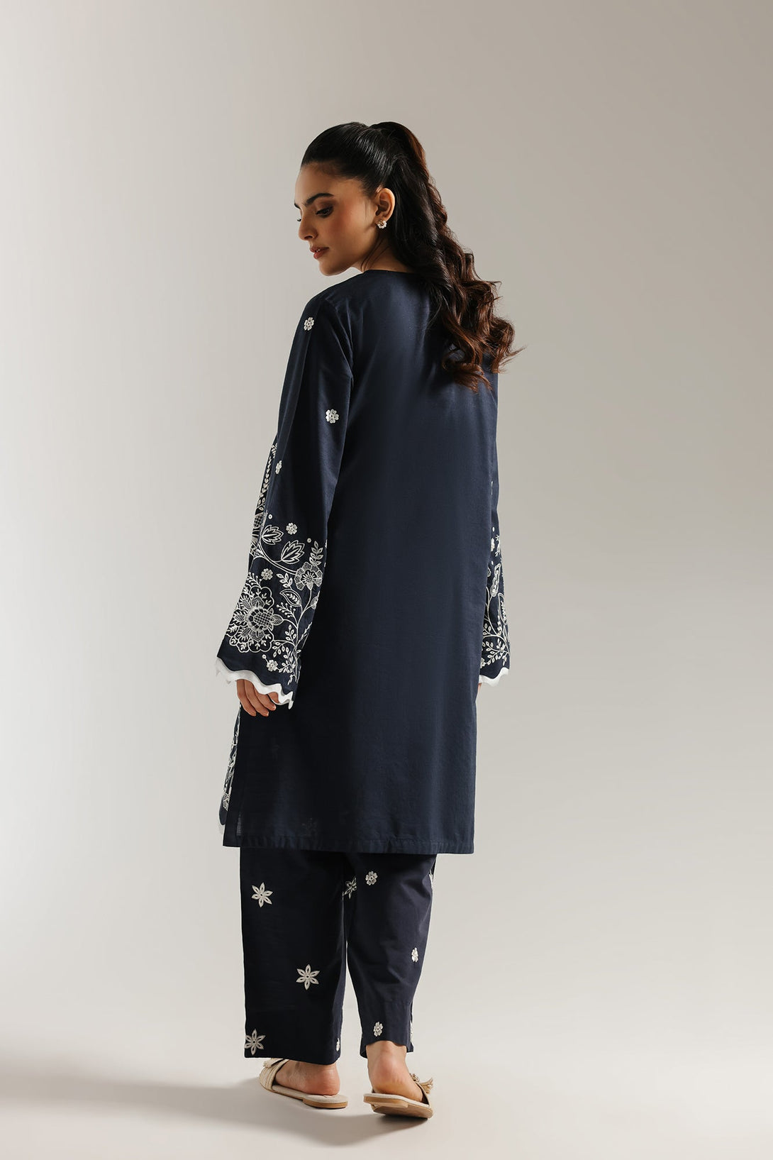 A vision of sophisticated contrast, this embroidered suit is a celebration of timeless elegance. The deep navy fabric is a stunning canvas for the intricate white embroidery, featuring bold floral motifs that gracefully adorn the neckline and sweep across the bodice. The wide, flowing sleeves and hem are beautifully finished with a delicate scalloped border, while the matching shalwar feature coordinating scattered embroidery throughout. This striking ensemble is the epitome of refined style and dramatic flair.