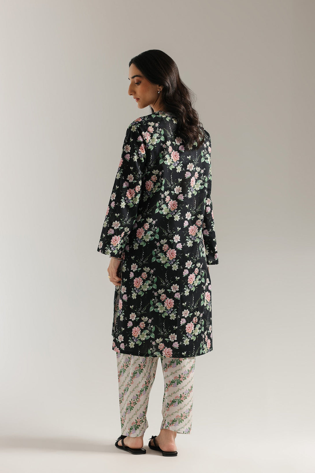 Immerse yourself in a garden of midnight blooms with this captivating printed suit. The deep black fabric of the long, flowing shirt serves as a dramatic backdrop for a lush and romantic floral print in soft shades of pink, cream, and green. The refined V-neckline is accented with a delicate border that continues down the buttoned placket. The ensemble is beautifully balanced with coordinating shalwar featuring a subtle, textured print in light neutral tones, creating a sophisticated and effortlessly chic statement.