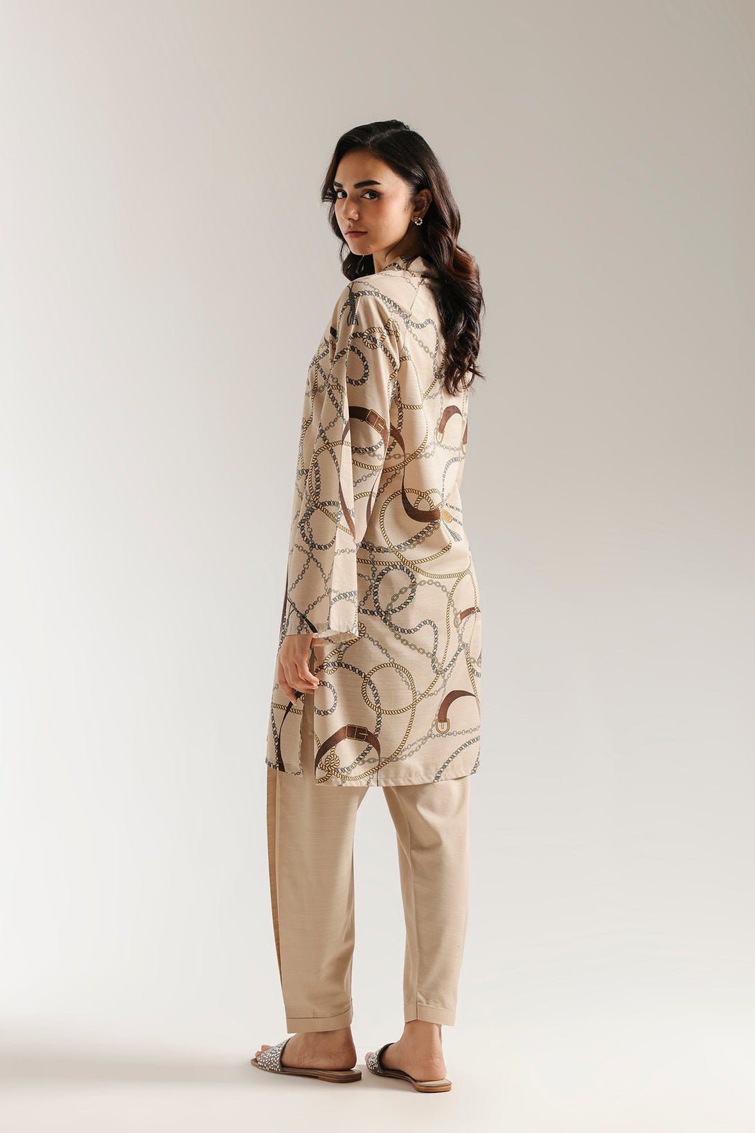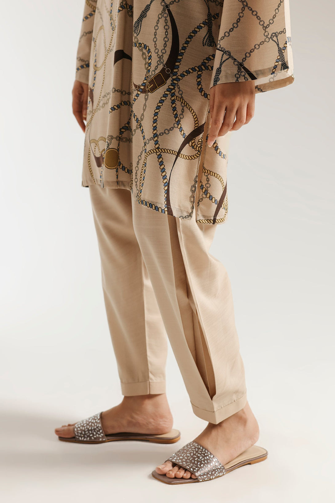 A luxurious tapestry of design, this captivating printed suit is a true statement piece. The soft beige fabric is adorned with an intricate and fashionable chain-link print in a rich palette of gold, blue, and brown. Paired with a matching beige loose fit shalwar. The elegant silhouette and sophisticated pattern create a look that is both modern and timeless.