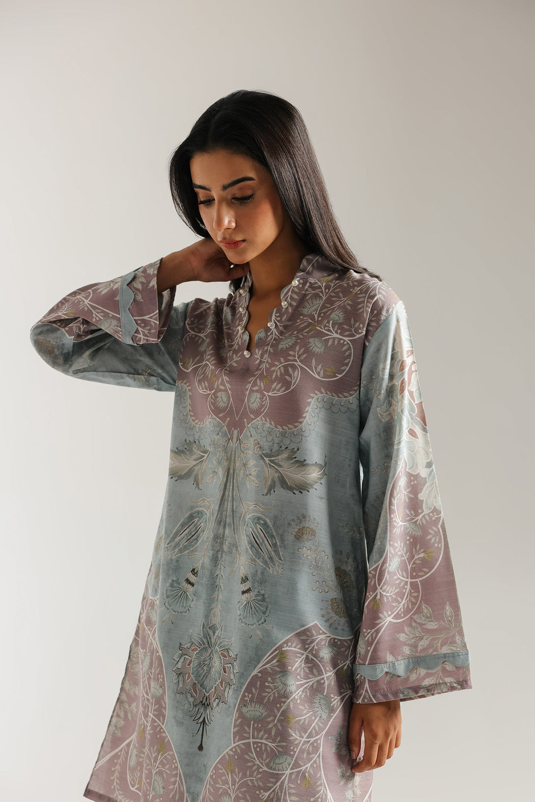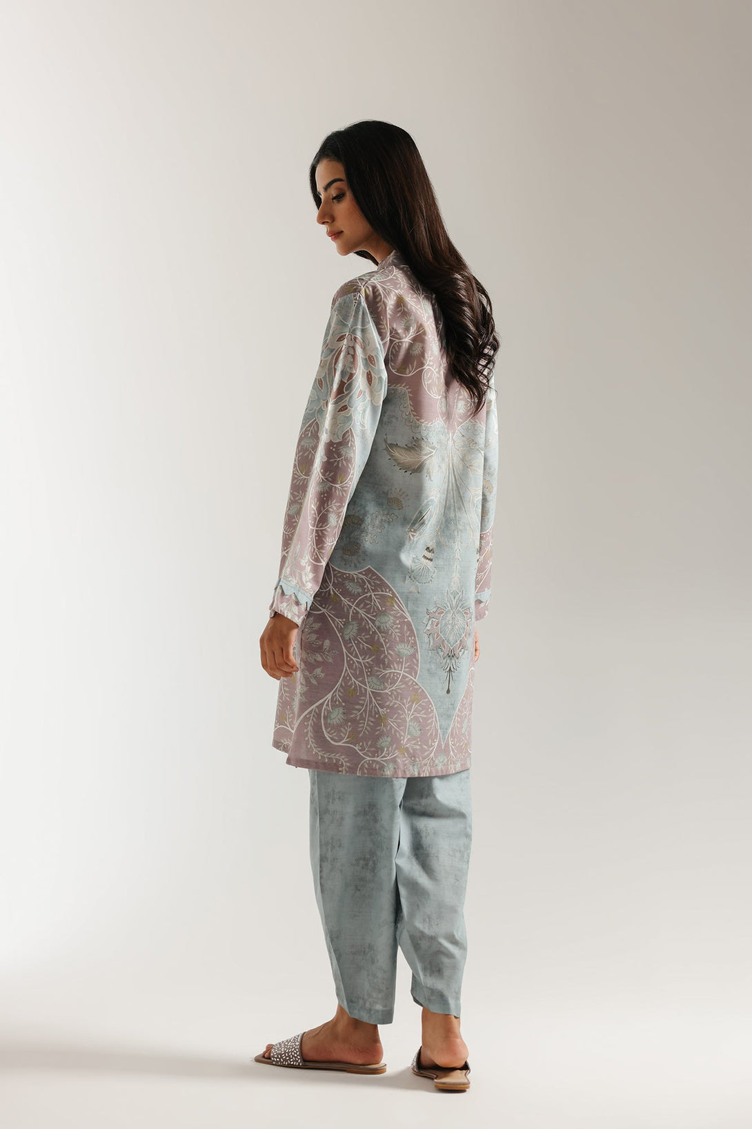 Drape yourself in the soft, serene hues of this beautifully printed suit. The shirt features an enchanting mix of traditional motifs in dusty rose and calming blue, creating a graceful and sophisticated look. The neckline is detailed with a charming, scalloped V-cut, while the relaxed-fit sleeves add to the elegant silhouette. The ensemble is completed with straight shalwar in a coordinating shade of blue, designed for both comfort and style. This suit is a perfect choice for an effortlessly chic daytime look.