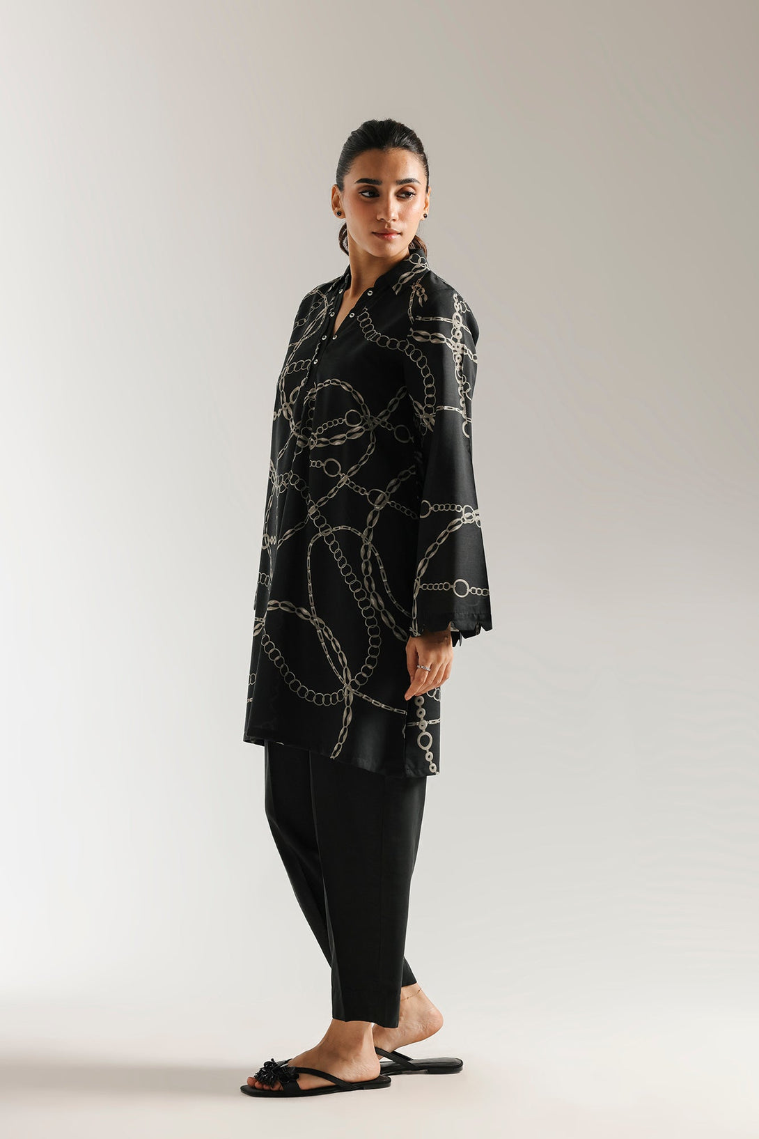 A bold statement of sophisticated style, this captivating printed suit is a modern wardrobe essential. The deep black fabric is adorned with an eye-catching chain-link print in contrasting white, creating a dynamic and chic pattern. With its elegant silhouette and sleek coordinating trousers, this ensemble offers a contemporary and polished look.