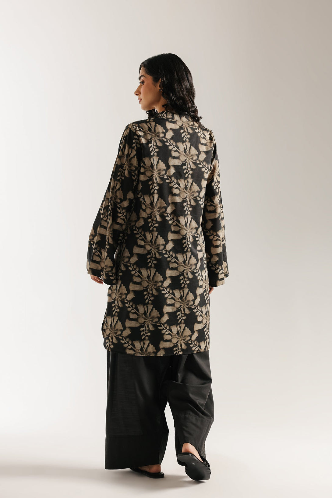 Step out in sophisticated style with this captivating printed suit. This two-piece ensemble features a black kurta adorned with an elegant all-over floral print in a subtle beige tone, creating a striking contrast. The relaxed-fit top boasts a flattering V-neckline and wide sleeves for a graceful silhouette. Paired with coordinating black shalwar, this suit offers a harmonious blend of traditional charm and modern flair, perfect for any occasion.