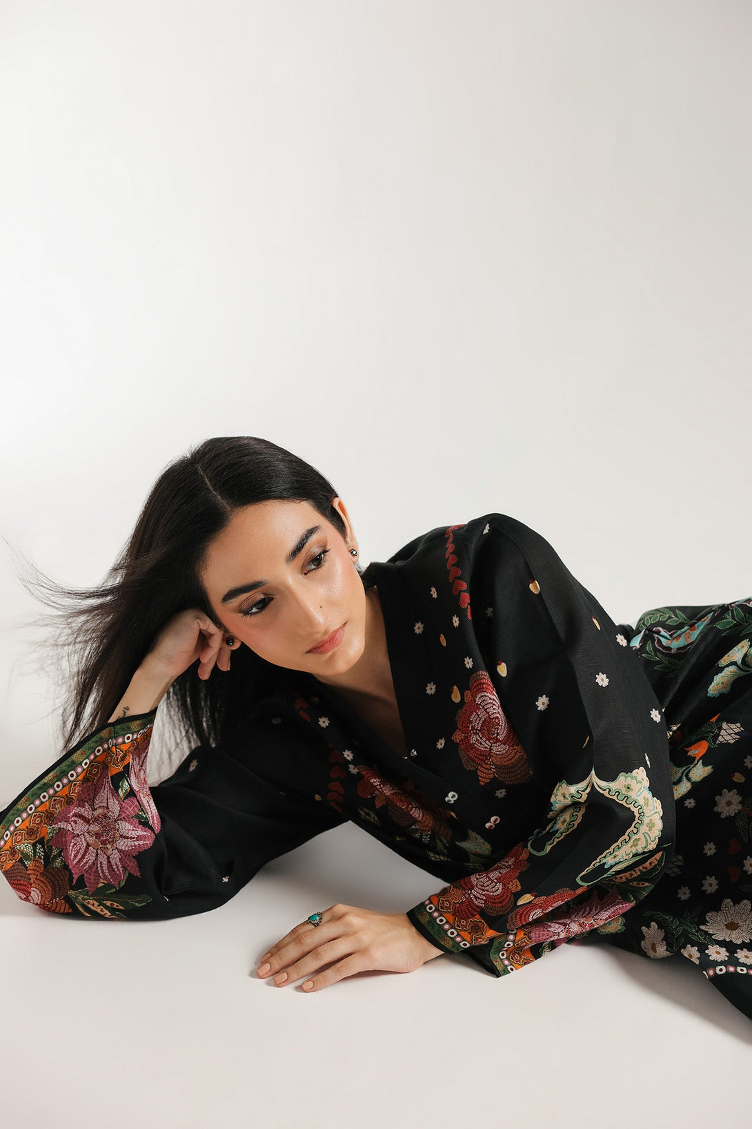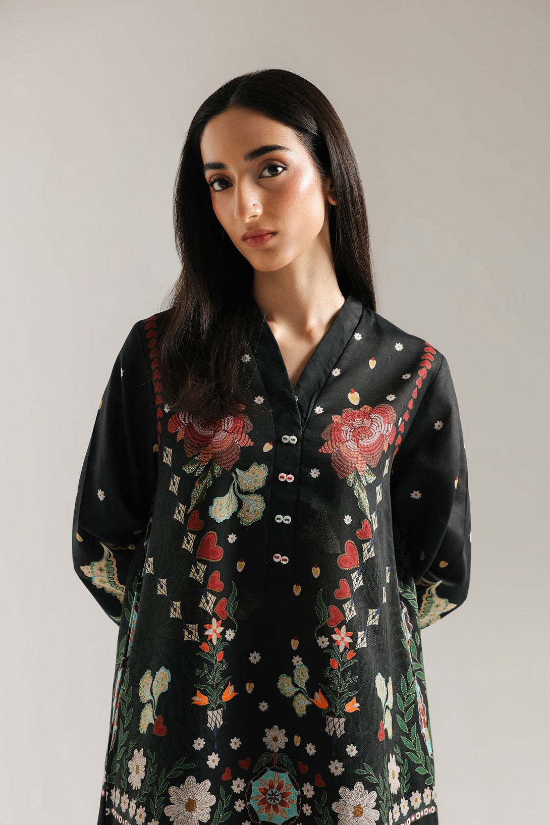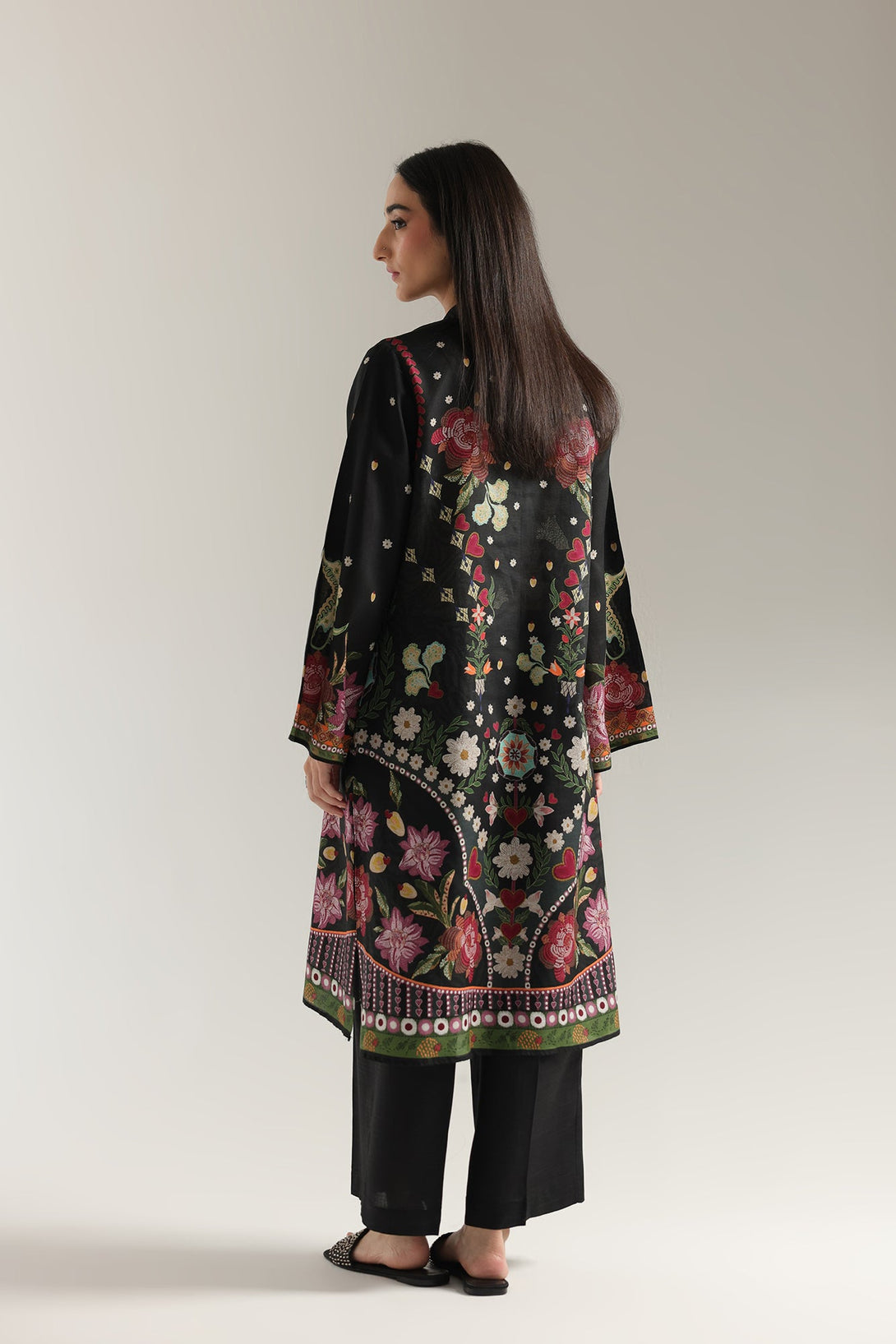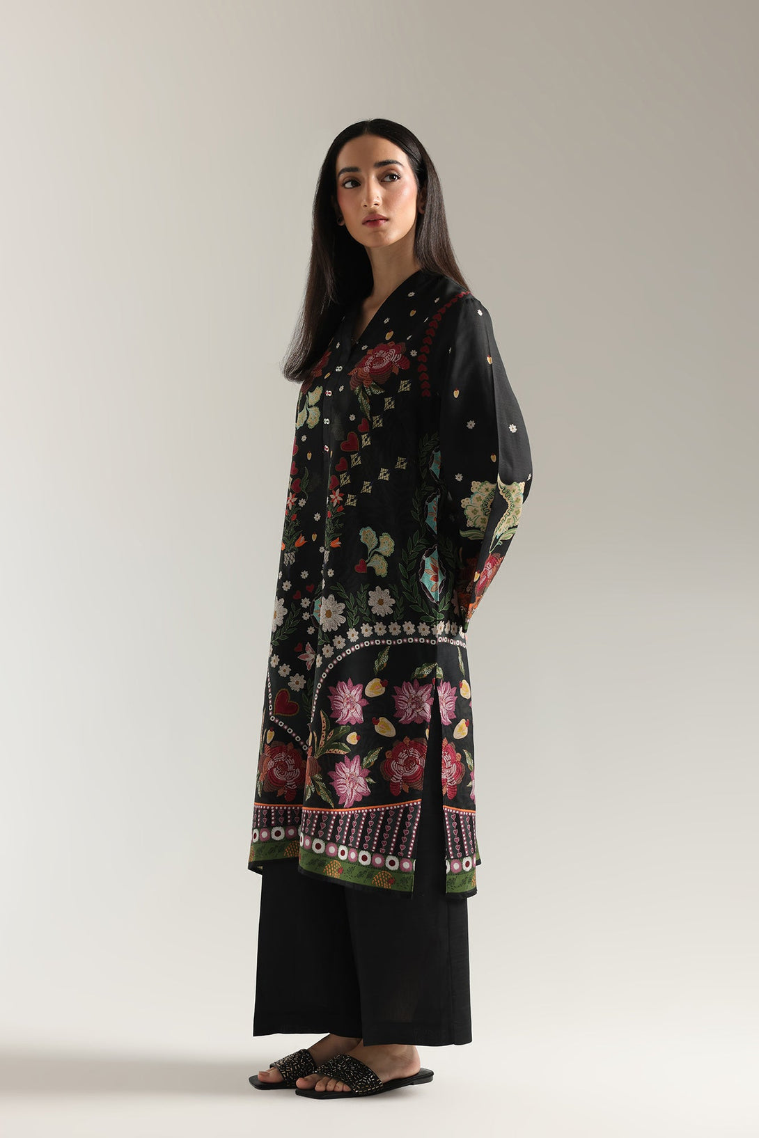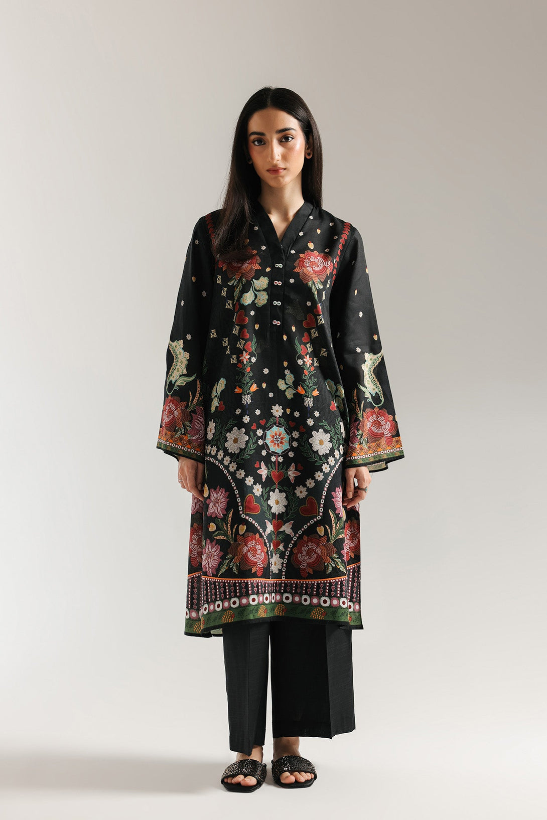 Step into a world of artistic wonder with this vibrant printed suit. This stunning two-piece ensemble is a true masterpiece of intricate design. The rich black base of the long shirt serves as a dramatic canvas for the beautiful, multi-colored floral and bird motifs. The detailed patterns on the neckline, front, and sleeves create a captivating design that celebrates traditional craftsmanship. The suit is completed with matching trouser, making it an ideal choice for any festive occasion or formal gathering.