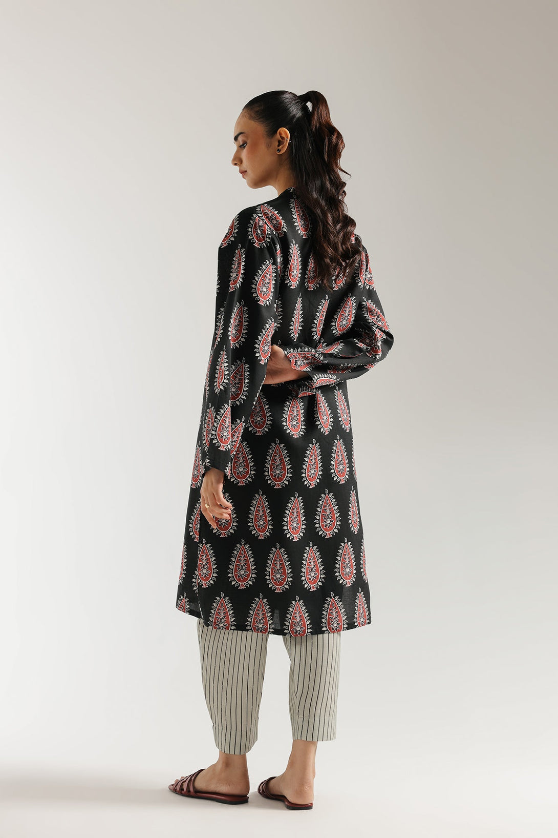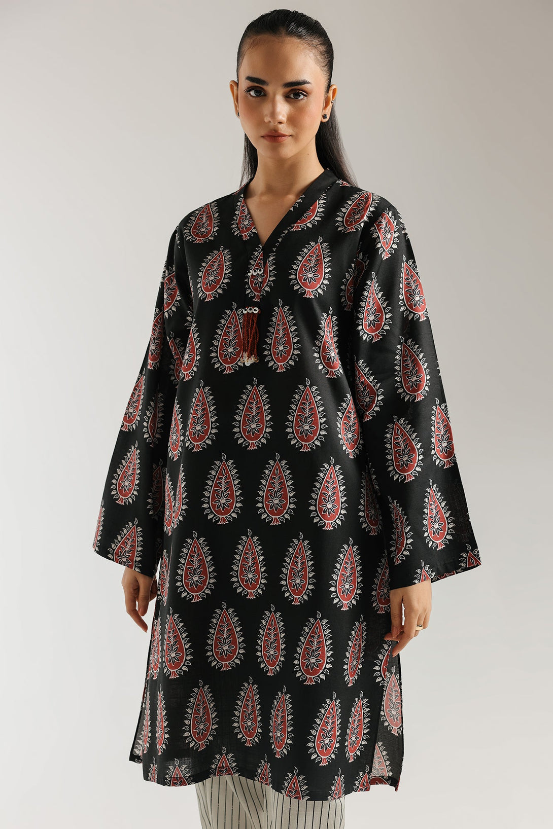 Step out in bold cultural style with this vibrant black printed ensemble, a striking fusion of traditional patterns and contemporary flair. The rich black tunic features a sharp V-neckline adorned with a single red tassel, setting a distinctive tone. The entire tunic is a canvas of intricate red and white paisley-like motifs, creating a mesmerizing all-over print that commands attention. Complementing this statement top are the comfortable straight trousers in an off-white or light grey, accented with subtle black vertical pinstripes, offering a chic contrast. This cohesive set is perfect for making a memorable impression at casual gatherings, festive events, or simply when you desire a look that is both stylish and undeniably unique.