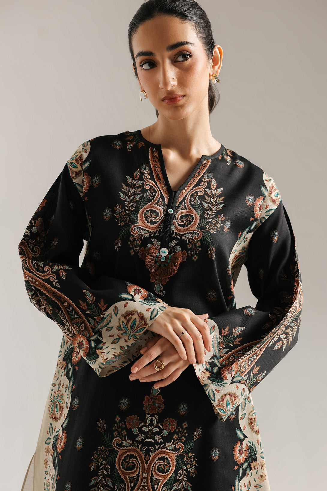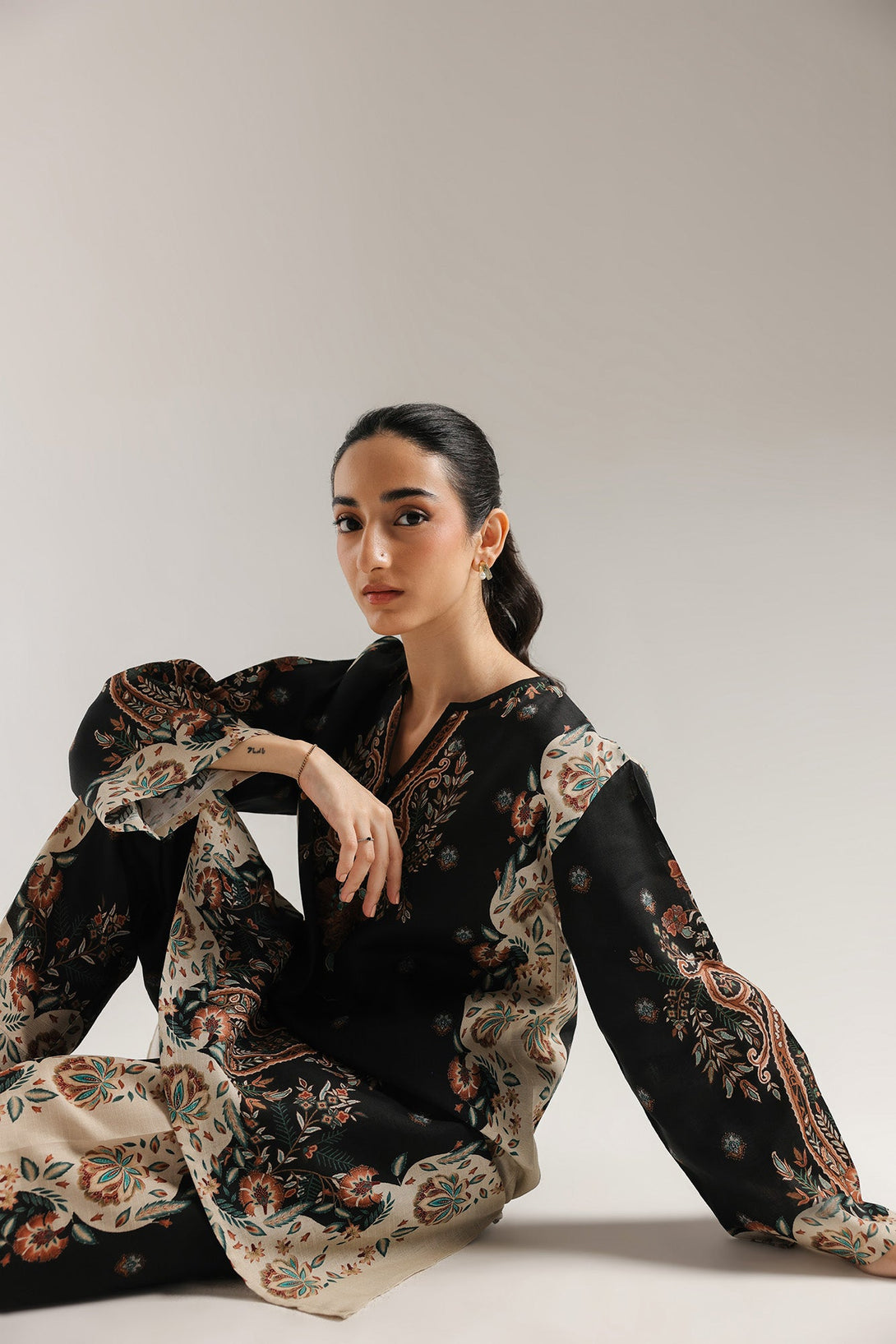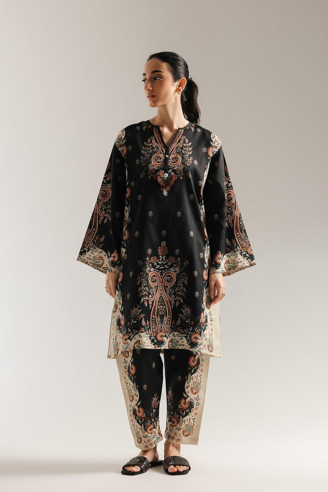 Wrap yourself in a look that is a masterpiece of intricate design and timeless elegance. This two-piece ensemble features a rich black base with a striking all-over paisley and floral print in shades of burnt orange and off-white. The long shirt has a comfortable, flowing silhouette, while the shalwar feature a complementary print, creating a cohesive and captivating look. This outfit is perfect for any occasion.