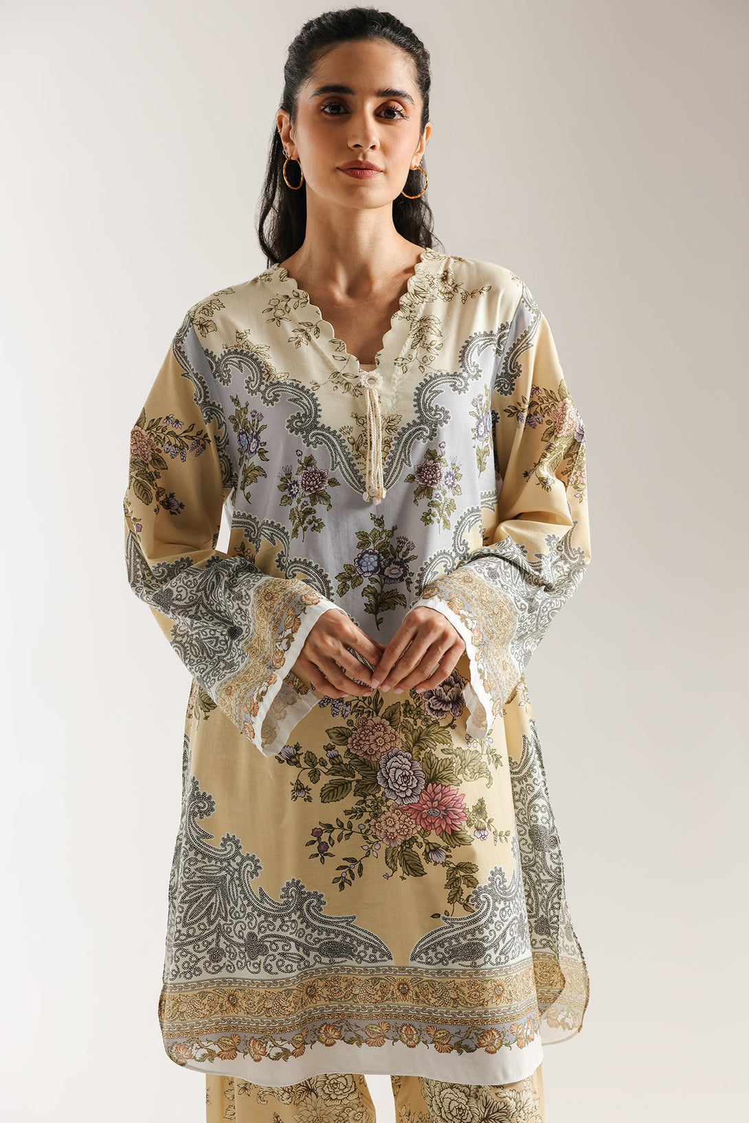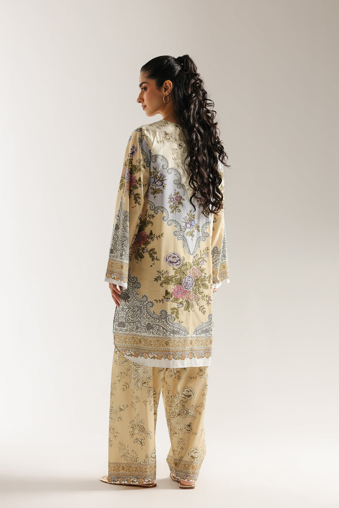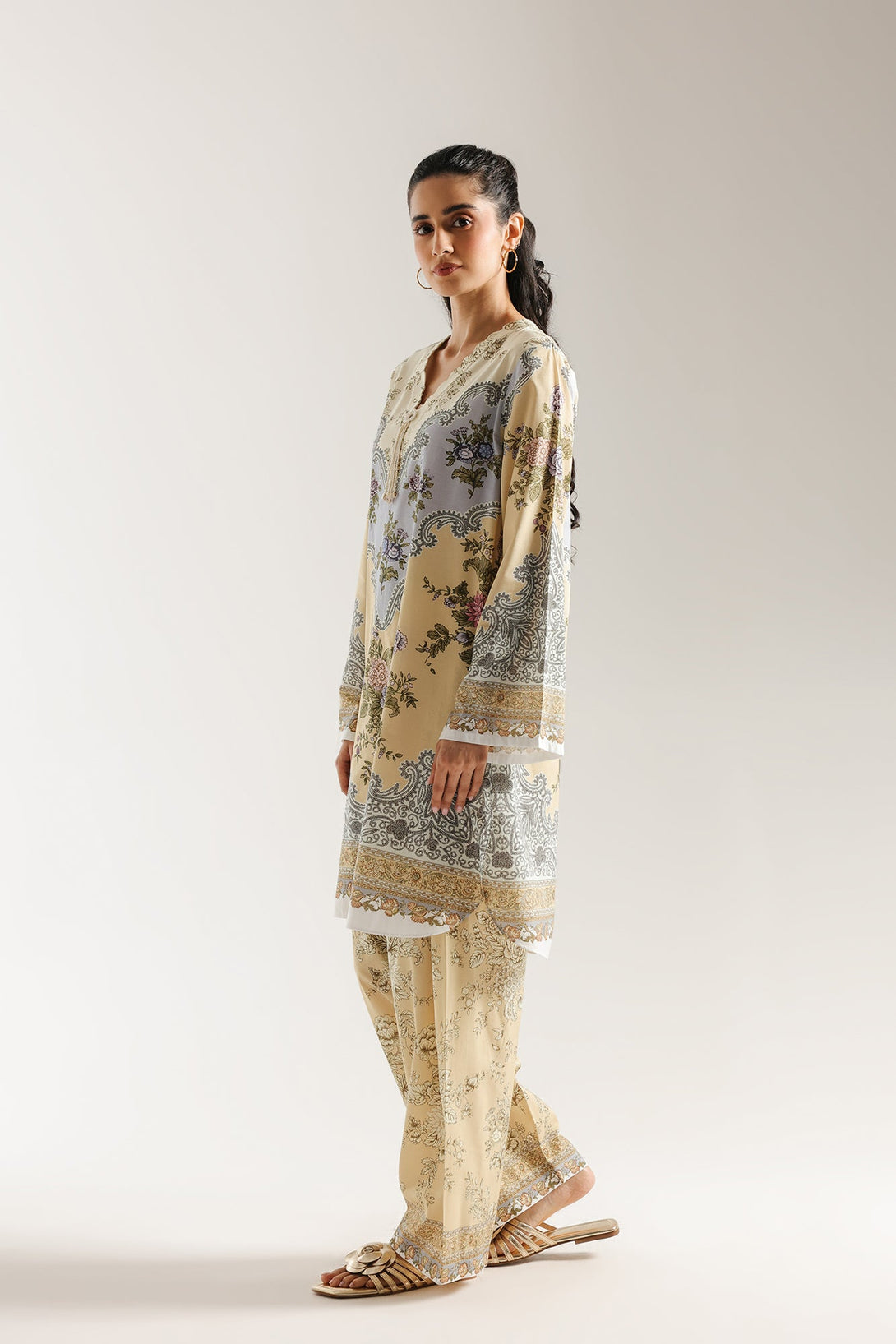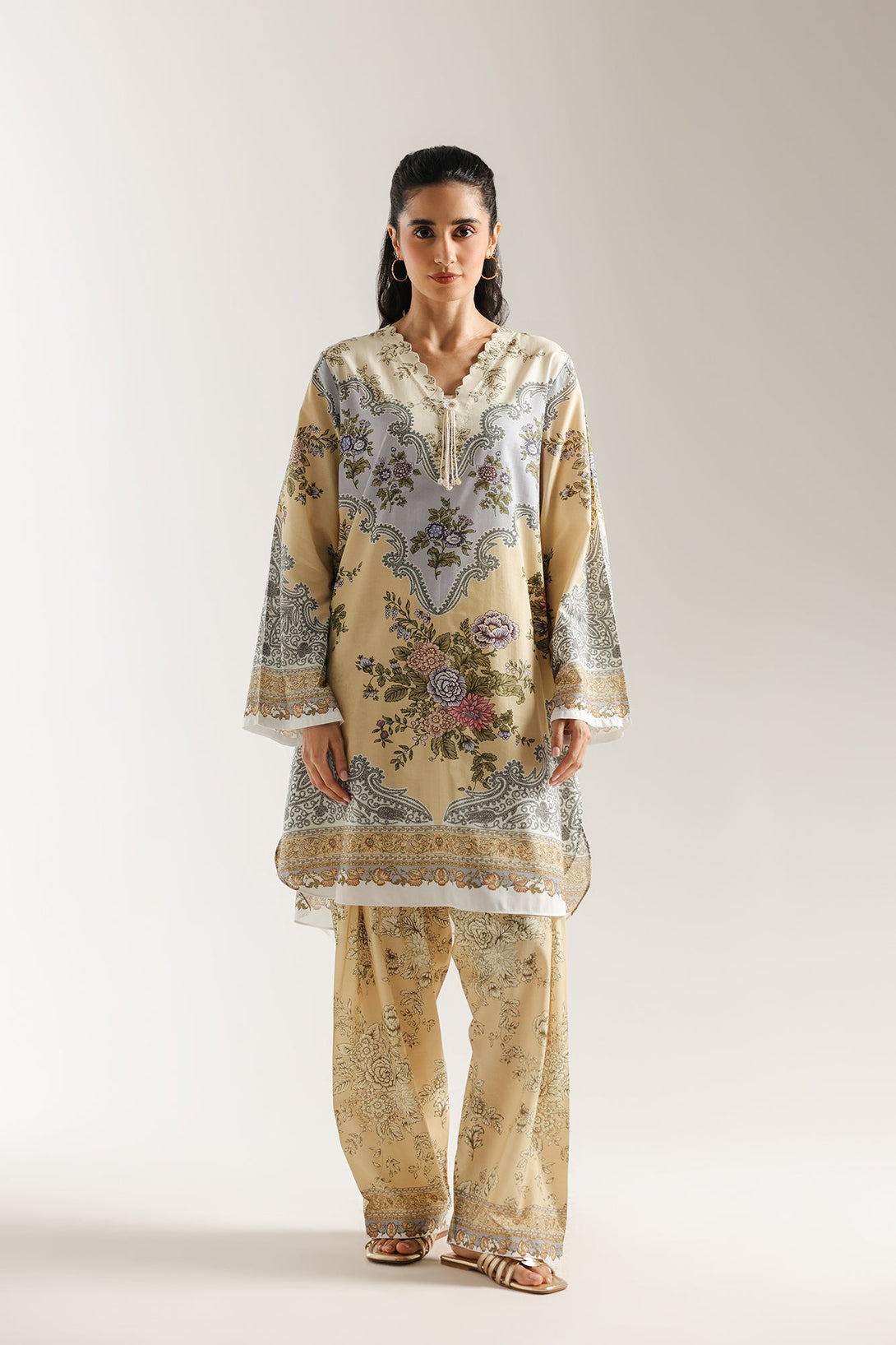 Discover an artful blend of patterns with this harmonious printed suit. The kurta features an elegant multi-panel print that combines soft floral and intricate paisley motifs in a sophisticated palette of beige, lilac, and green. The coordinating shalwar adorned with a delicate all-over pattern, perfectly complement the top. This suit is a gracefully styled ensemble, offering a rich and timeless aesthetic.