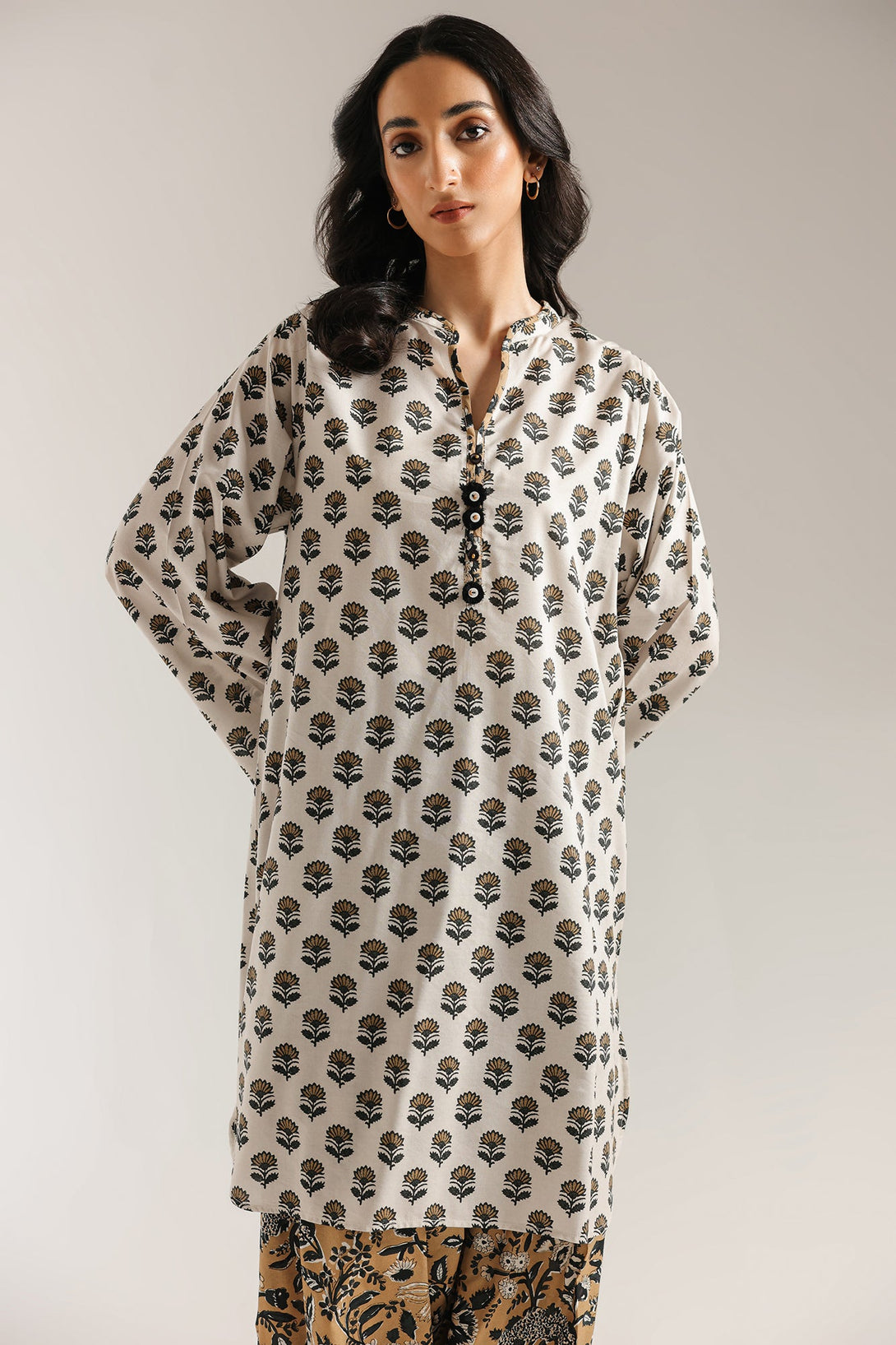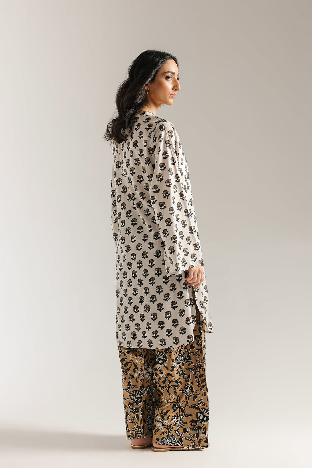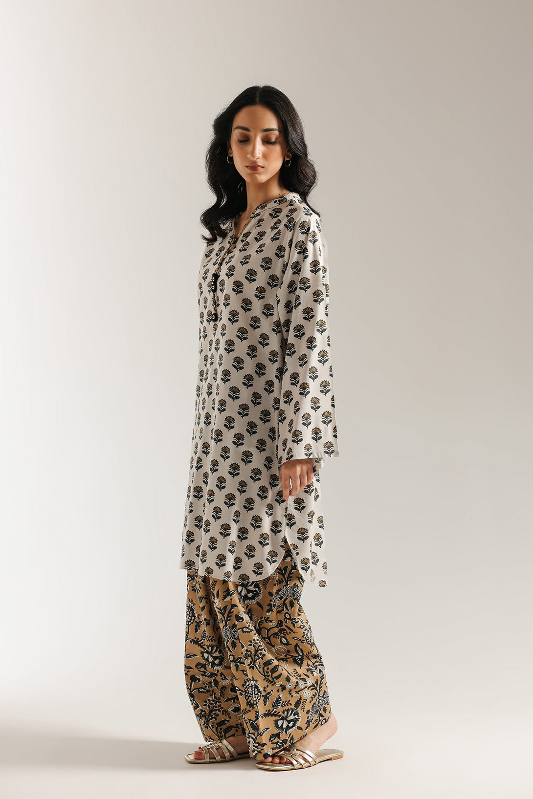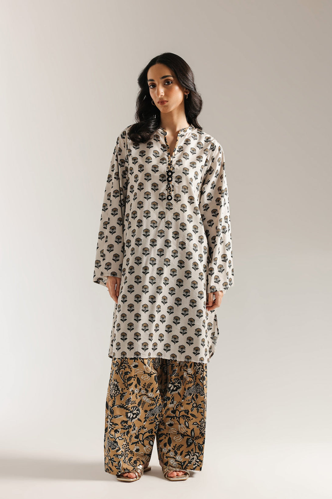 This beautiful printed suit features a harmonious blend of patterns for a truly distinctive look. The tunic, with its relaxed fit and full-length sleeves, showcases a delicate all-over floral print in a neutral color palette. The neckline is accented with a simple button detail, adding a subtle touch of elegance. This top is paired with wide, flowing shalwar that display a larger, more abstract botanical print in complementary shades. The mix of prints creates a dynamic and stylish outfit, perfect for a fashionable day out.