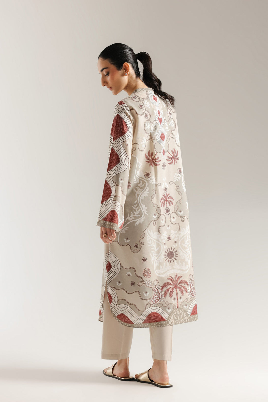 Step into a world of artistic wonder with this vibrant printed suit. This stunning two-piece ensemble is a true masterpiece of intricate design. The light beige base of the long shirt serves as a graceful canvas for the beautiful, geometric and stylized floral print in shades of red, white, and brown. The suit is completed with matching trouser, making it an ideal choice for any festive occasion or formal gathering.