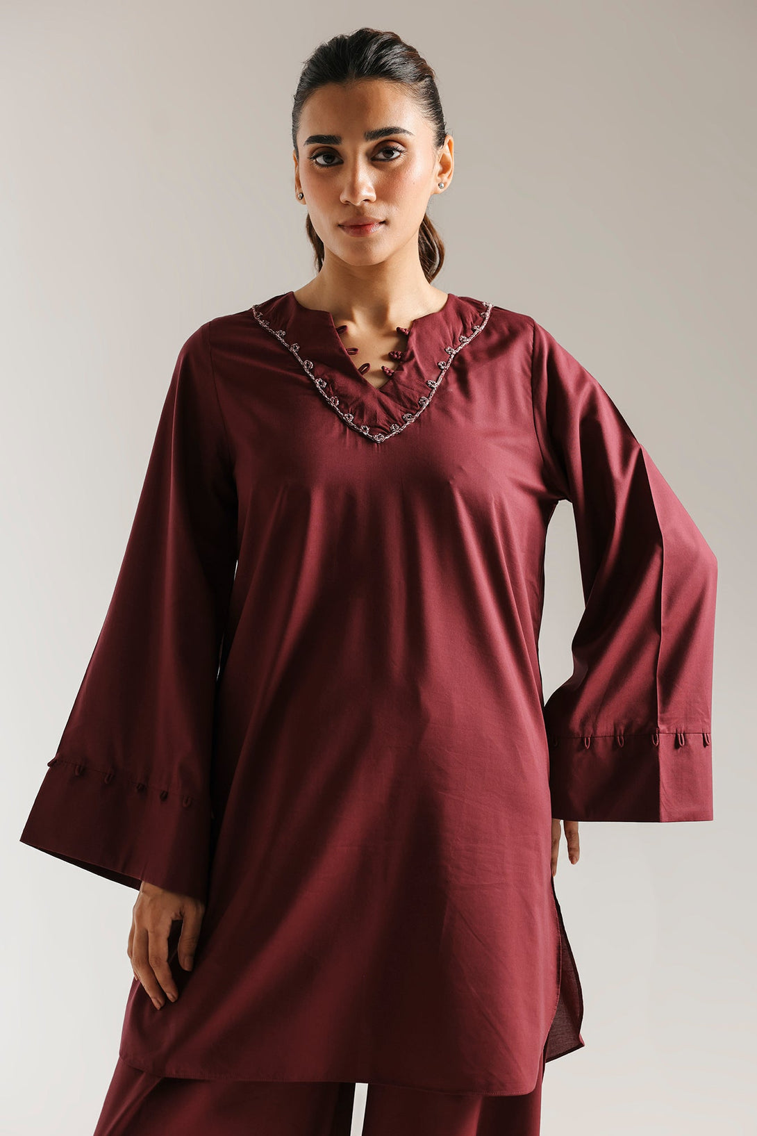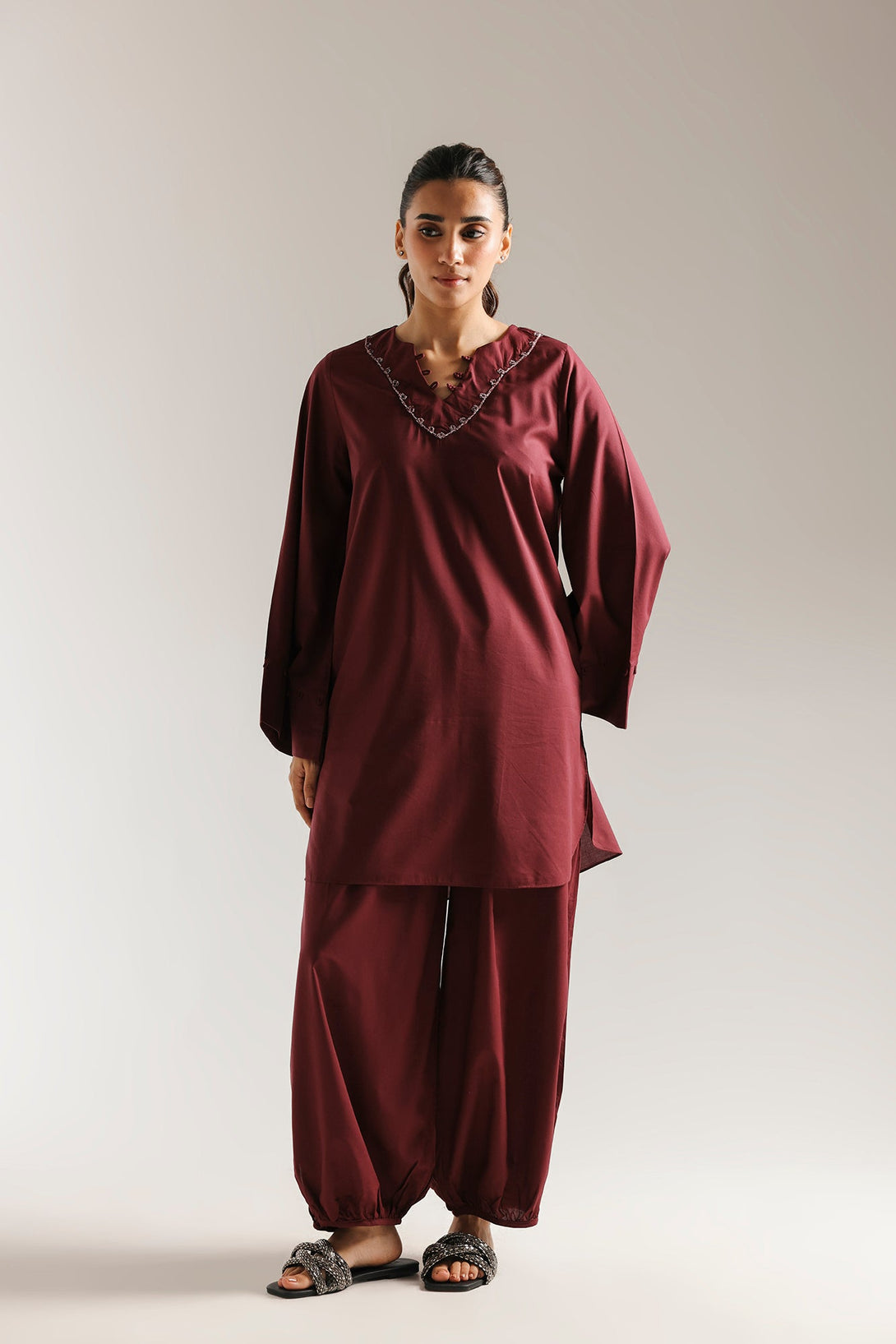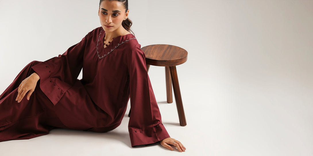 Experience refined simplicity with this elegant solid suit. This two-piece ensemble features a deep plum kurta with a sophisticated V-neckline adorned with subtle detailing for a touch of refined detail. The wide, flowing sleeves add a graceful touch, while the matching plum shalwar complete the look. This suit offers a clean, contemporary silhouette that is both comfortable and effortlessly stylish.