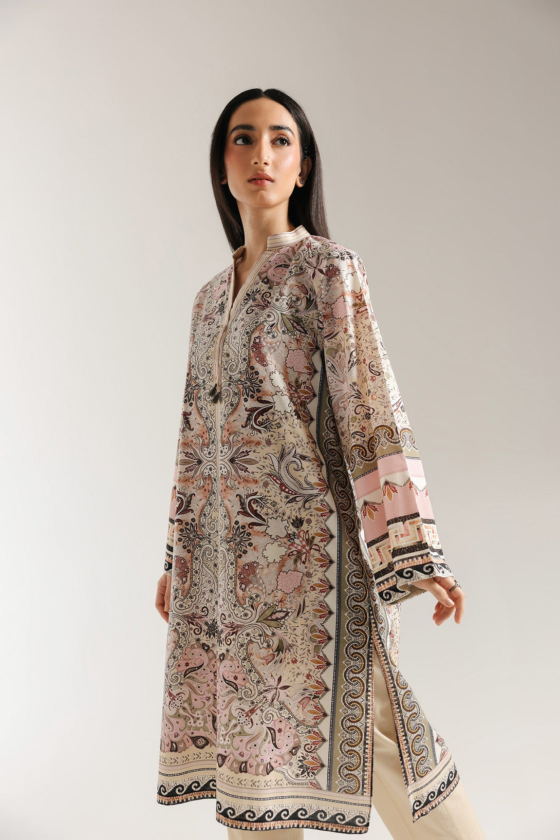 Wrap yourself in a look that is a masterpiece of intricate design and timeless elegance. This two-piece ensemble is crafted from a soft, light-colored fabric with a beautiful all-over paisley and floral print in shades of pink, off-white, and black. The long shirt has a comfortable, flowing silhouette, while the trouser feature a complementary solid color, creating a cohesive and captivating look. This outfit is perfect for any occasion.