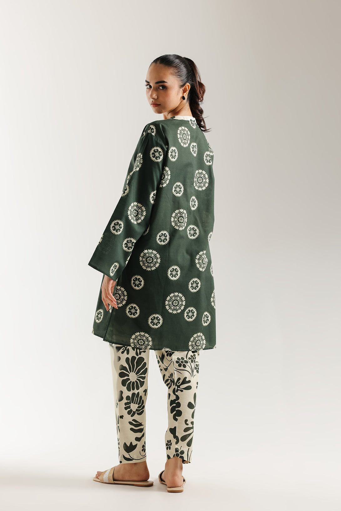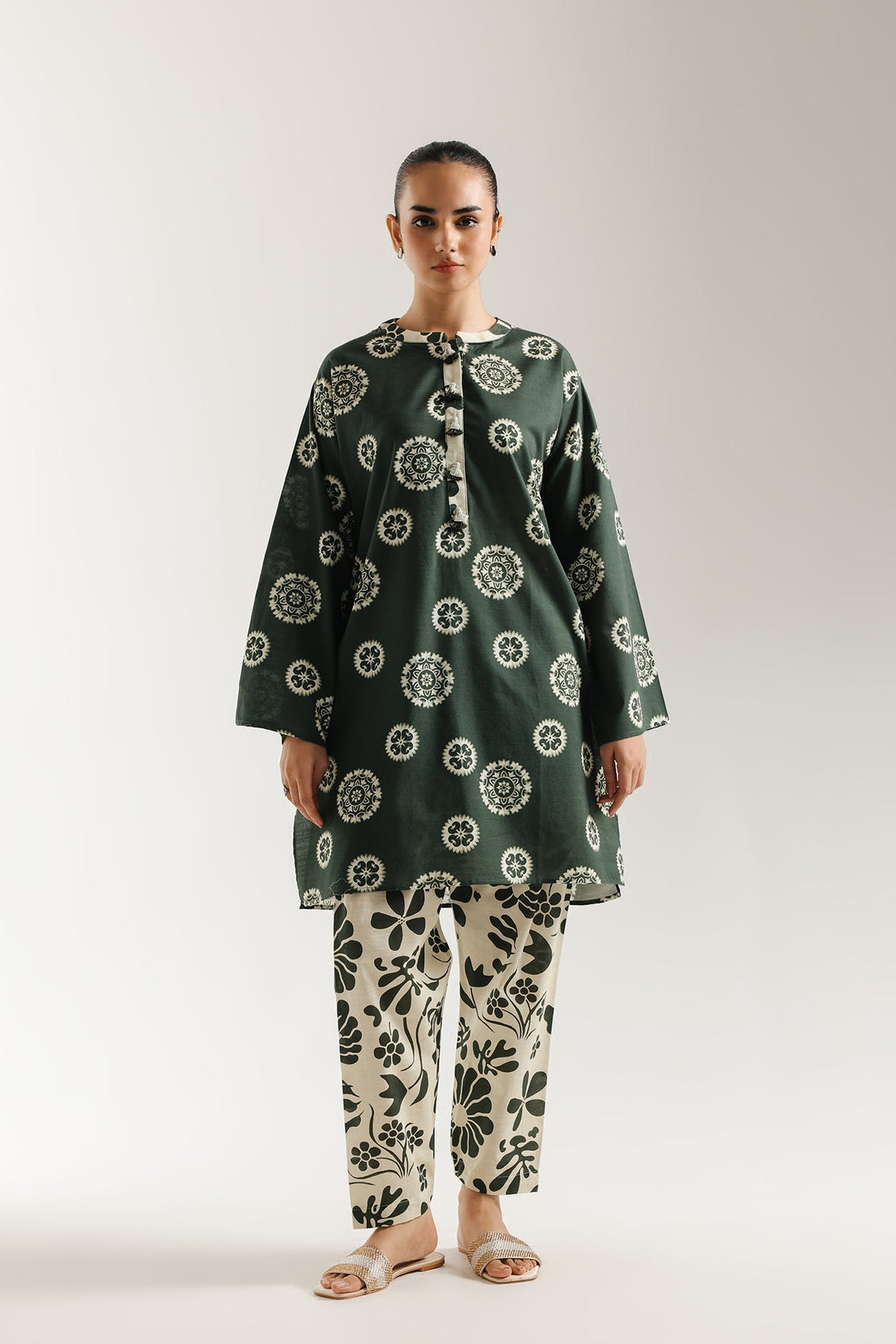 Envelop yourself in the bold, graphic beauty of this striking printed suit. The straight-cut kurta is crafted in a rich forest green and features an all-over geometric medallion print in crisp white, creating a captivating visual contrast. The top is perfectly paired with tailored shalwar in a soft off-white, which showcase an elegant, large-scale botanical print in olive green. This suit is an artistic blend of pattern and color, perfect for a contemporary, sophisticated look.