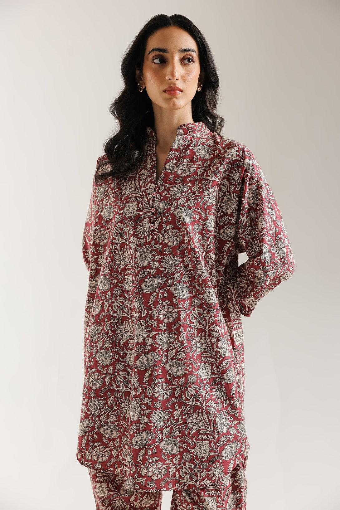 Wrap yourself in the rustic allure of this stunning printed suit. The entire ensemble is crafted from a vivid, violet fabric and features an all-over, intricate floral and vine print in a contrasting off-white or beige. The relax fit kurta has a traditional band collar with a split V-neckline and three-quarter sleeves, creating a relaxed yet tailored silhouette. This richly patterned top is perfectly matched with comfortable shalwar in the exact same print, resulting in a cohesive and charming traditional look.