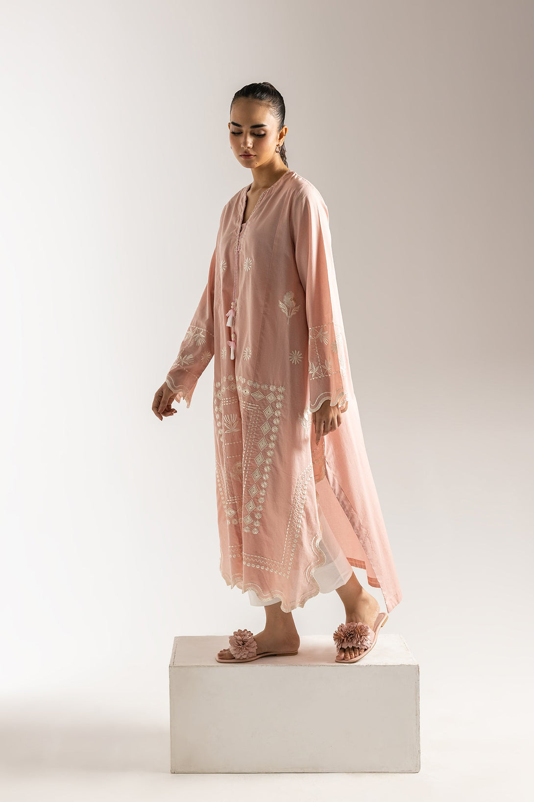 Embrace the essence of delicate charm with this beautiful blush pink shirt. The soft, rosy hue provides a serene canvas for the intricate white embroidery that adorns the front, hem, and graceful bell sleeves. Playful tassels at the neckline add a touch of modern flair, while the relaxed, flowing silhouette ensures a comfortable yet elegant fit. This piece is a perfect blend of timeless style and serene sophistication.
