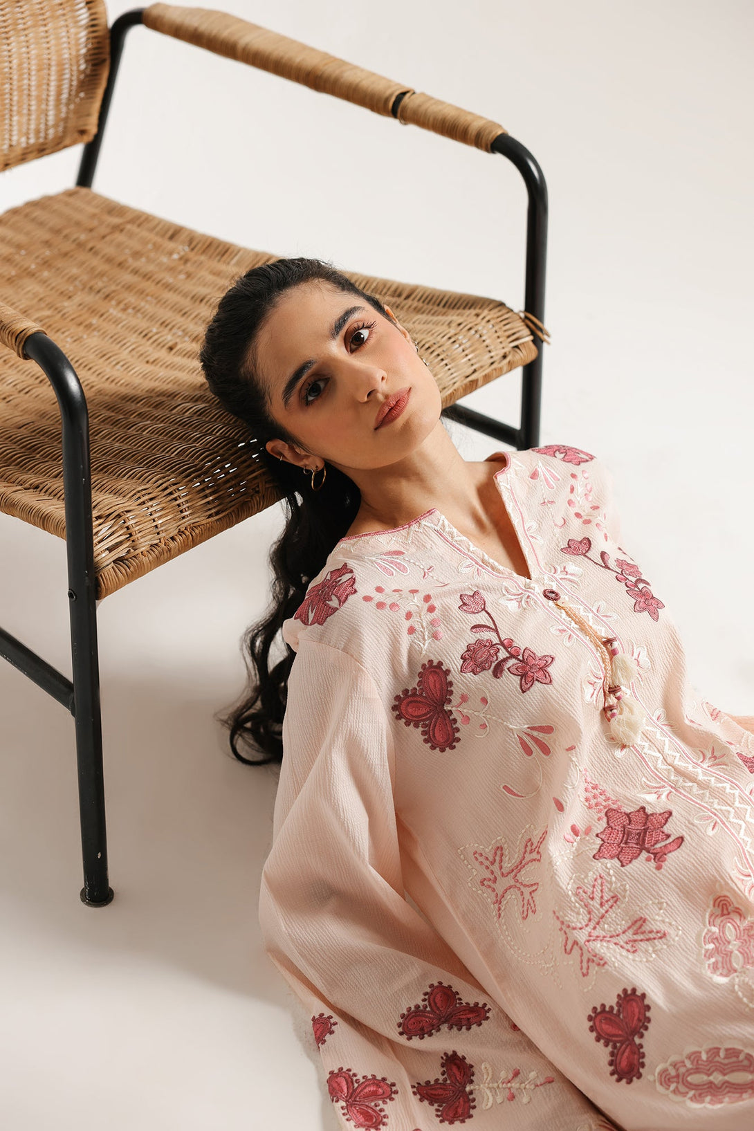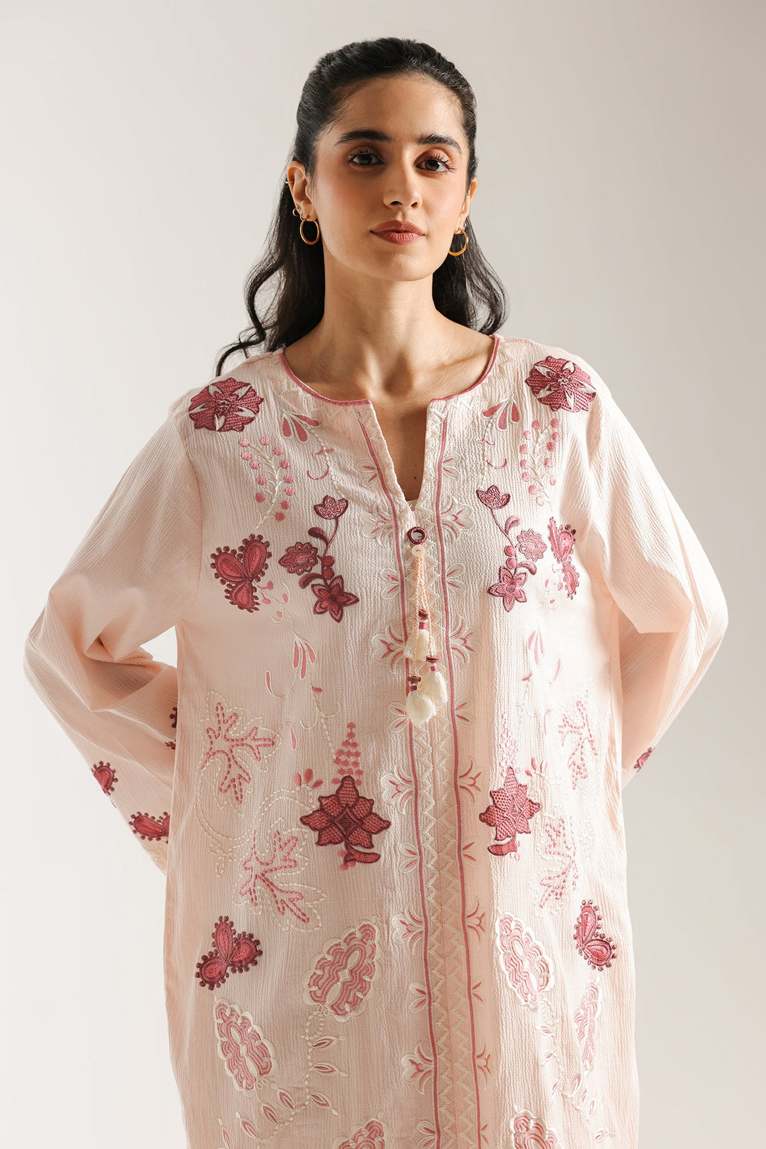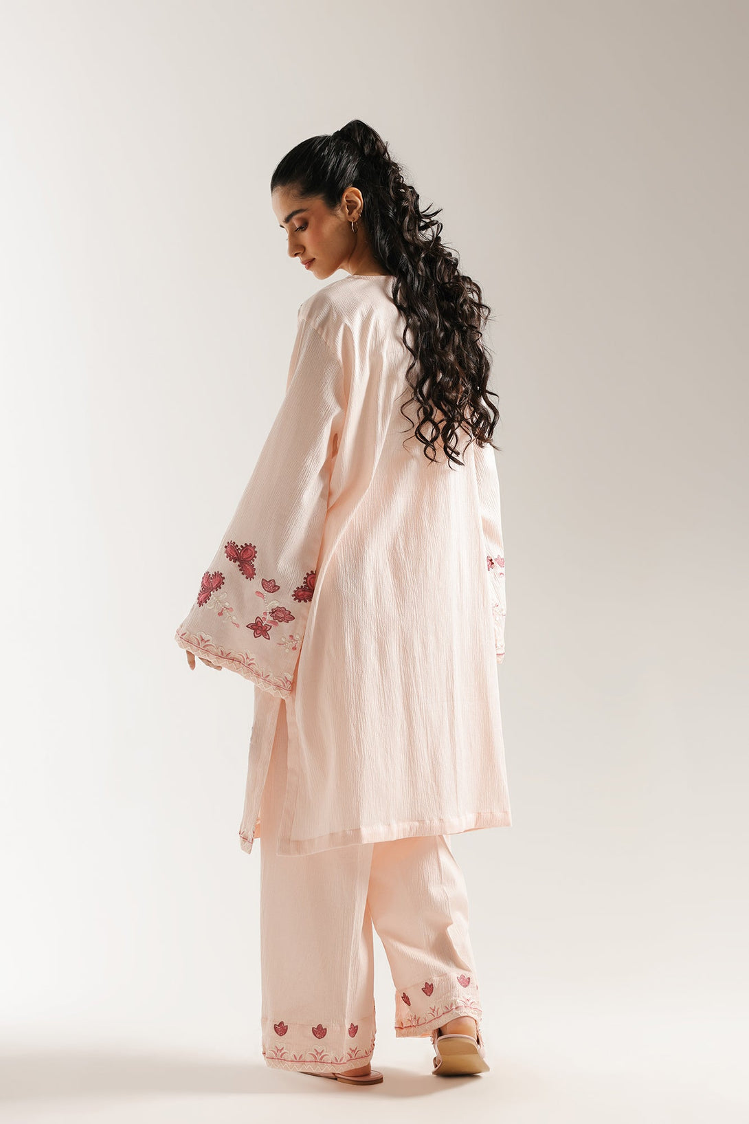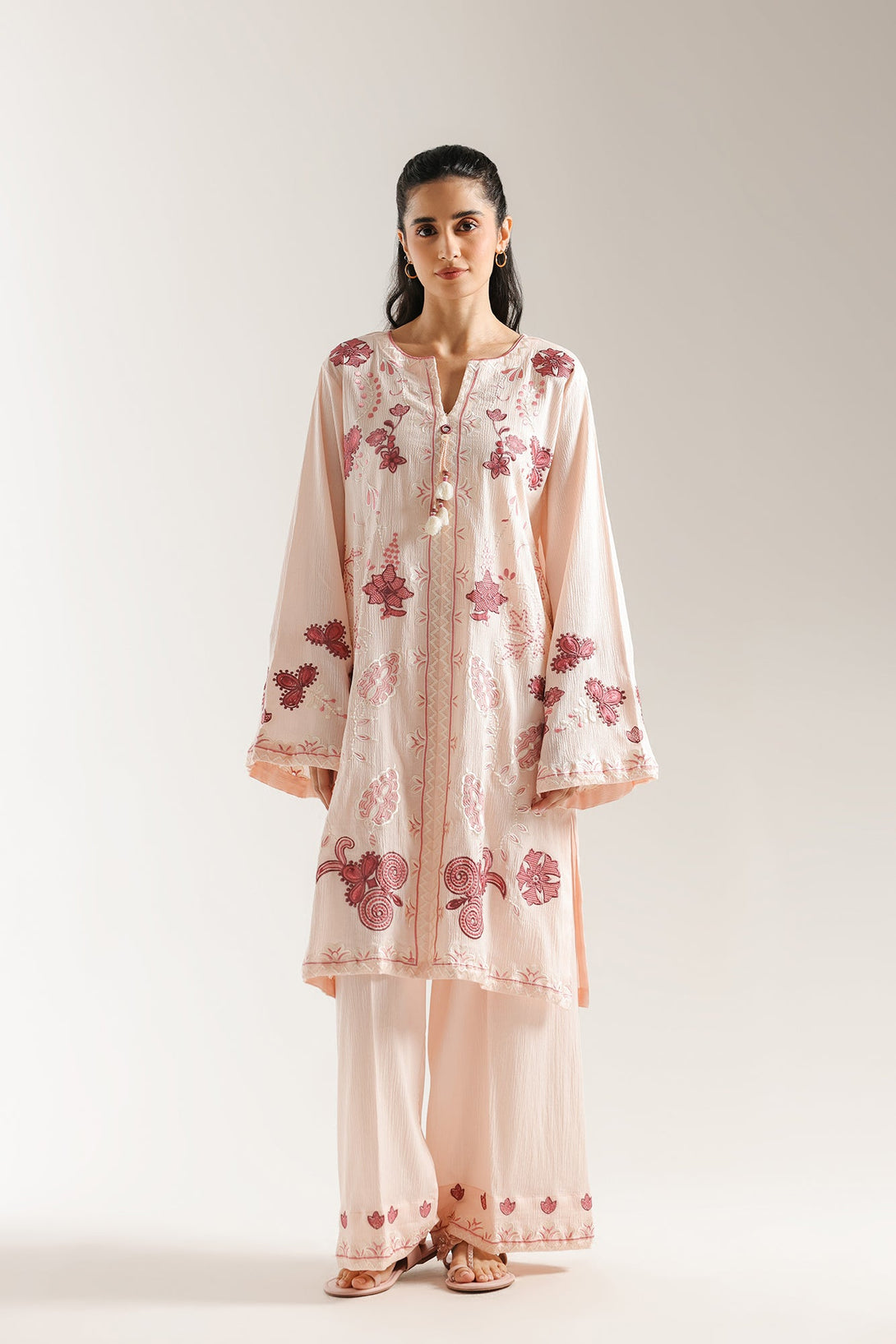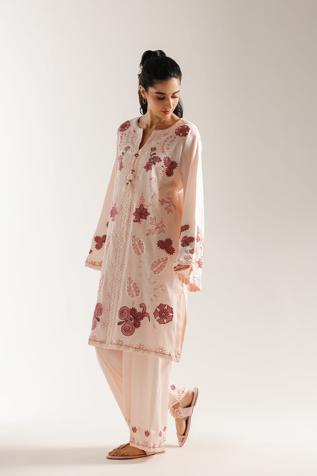 Delicate charm defines this exquisite embroidered suit. This two-piece ensemble features a soft pink kurta adorned with intricate floral and abstract embroidery in rich maroon and lighter pink hues, creating a beautiful textural contrast. The matching pink trousers also feature coordinating embroidery at the hem, completing a harmonious and elegant look. With its graceful silhouette and captivating details, this suit is perfect for adding a touch of sophisticated beauty to your wardrobe.