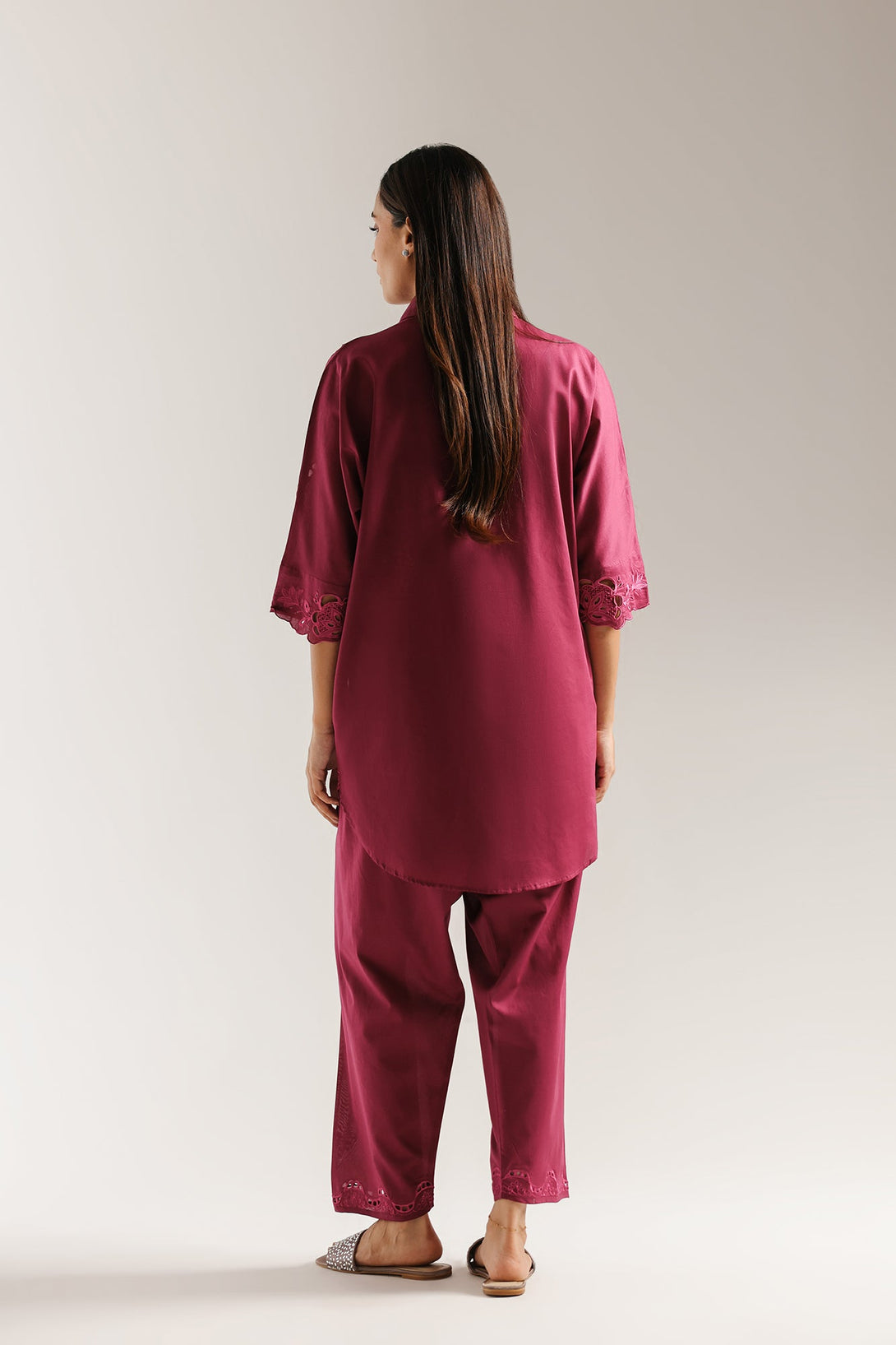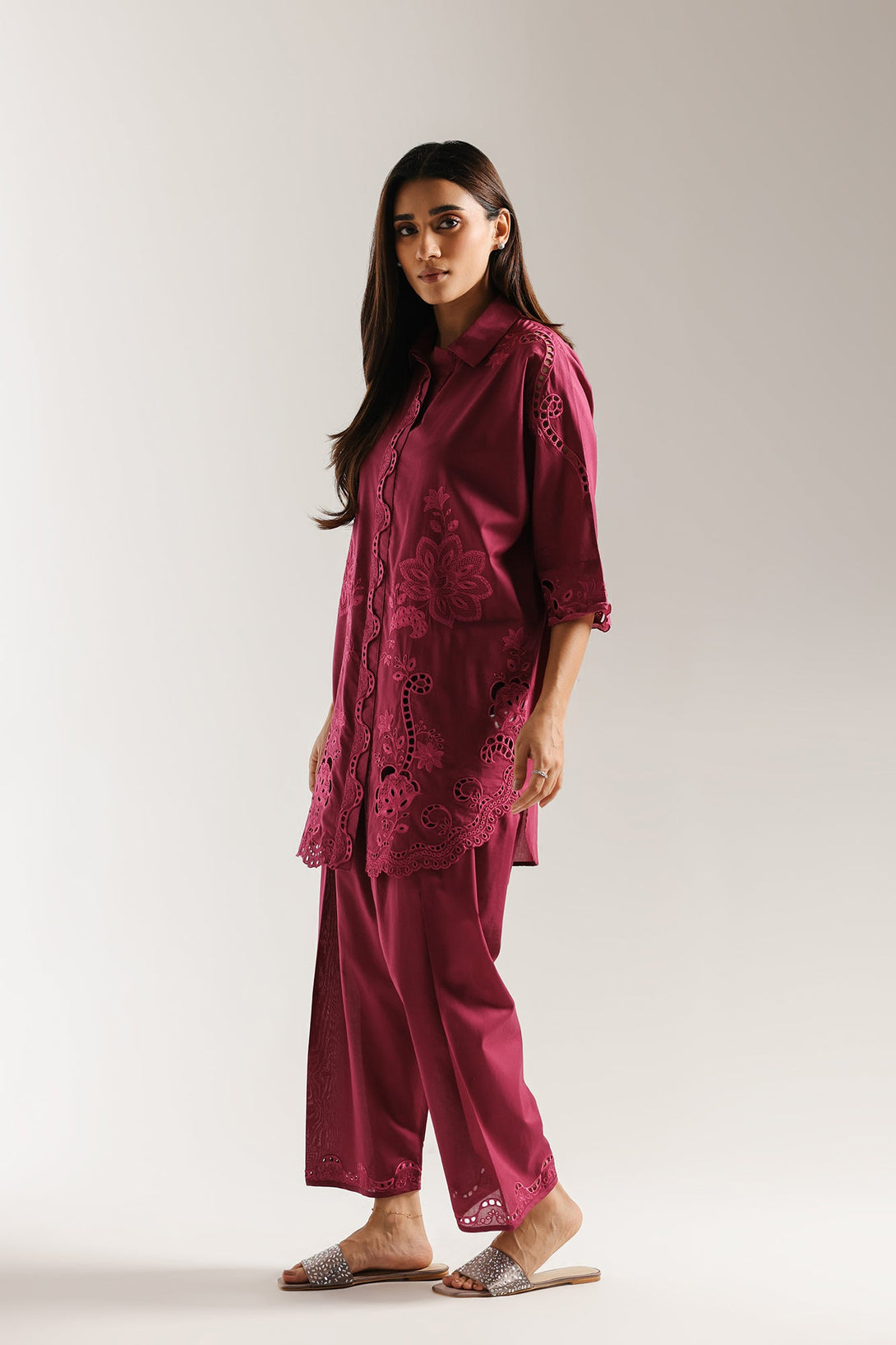Make a bold statement with this vibrant embroidered suit. This two-piece ensemble features a rich magenta kurta beautifully detailed with intricate cutwork and embroidery in large floral patterns down the front and on the sleeves. The clean, button-down silhouette is complemented by matching loose fit shalwar creating a cohesive and contemporary look. This suit is a stunning choice for anyone who wants to combine classic elegance with modern flair.