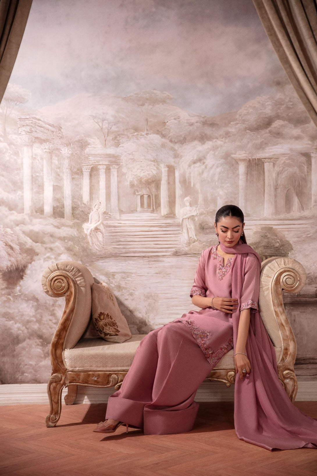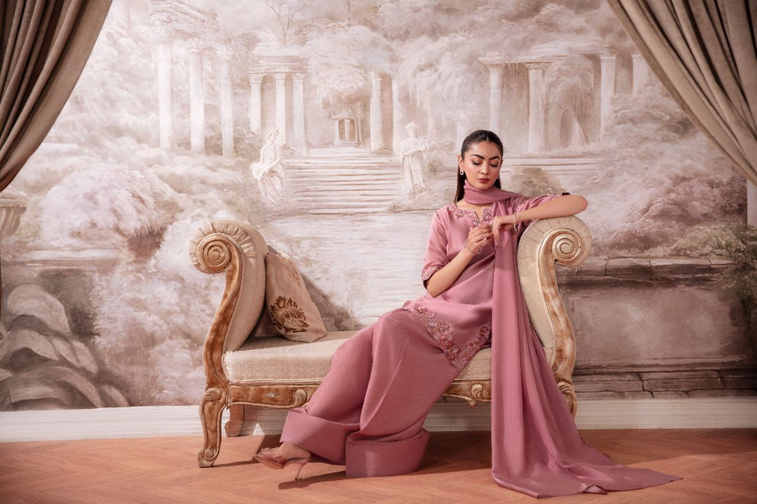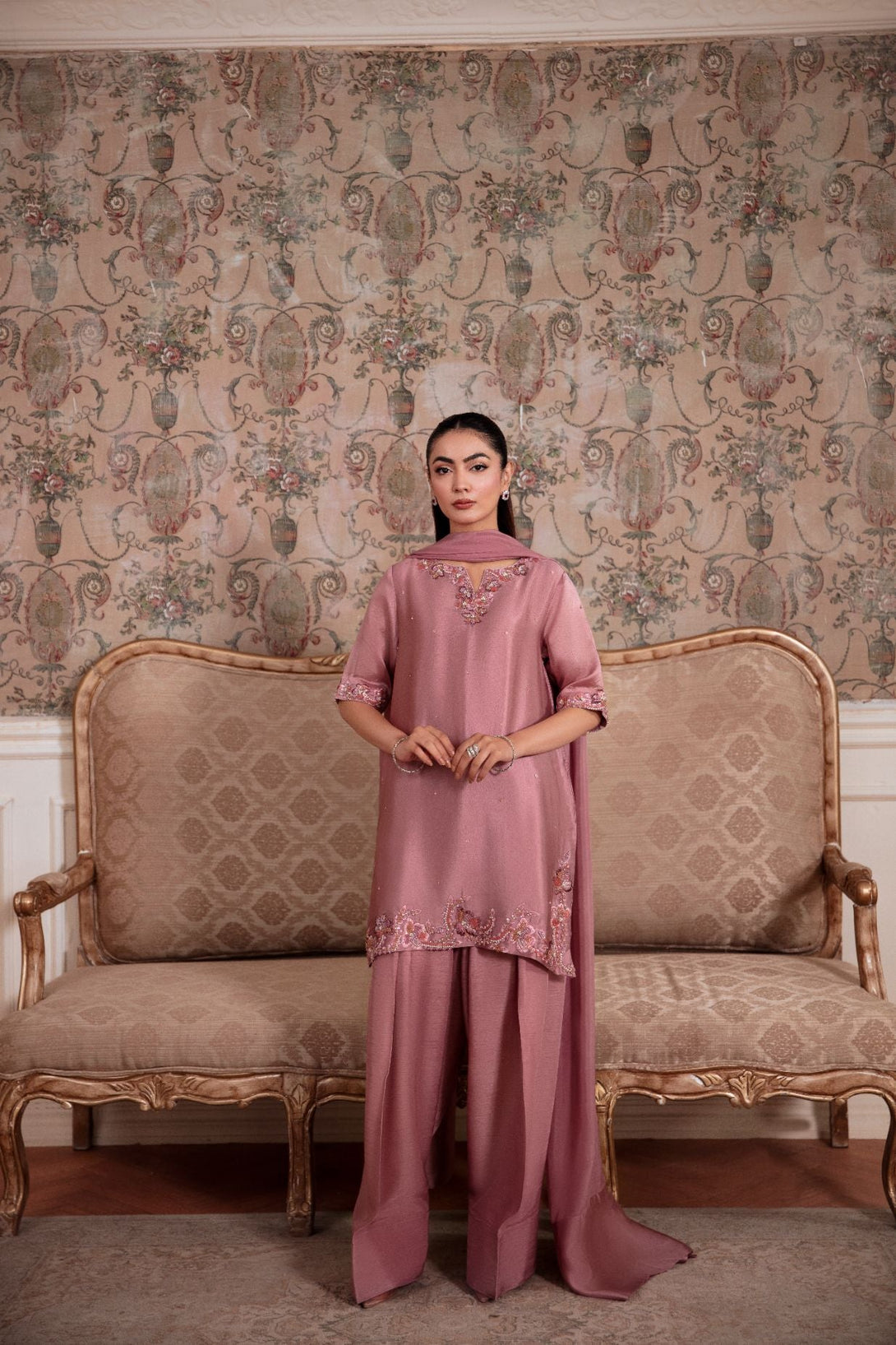 A 3pc set on sheesha Silk, embellished in monotone pearls, sequins and katdana. It comes with a medium silk duppata and a farshi shalwar.