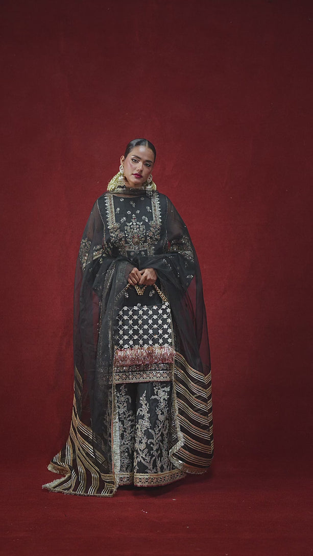 A black Indian silk shirt paired with a matching Indian silk sharara. The sharara is highlighted with delicate floral embroidery and a refined border, while the shirt is elevated with intricate adda work. Finished with a statement dupatta detailed with trims, crushed gota, and kiran for a rich festive appeal.