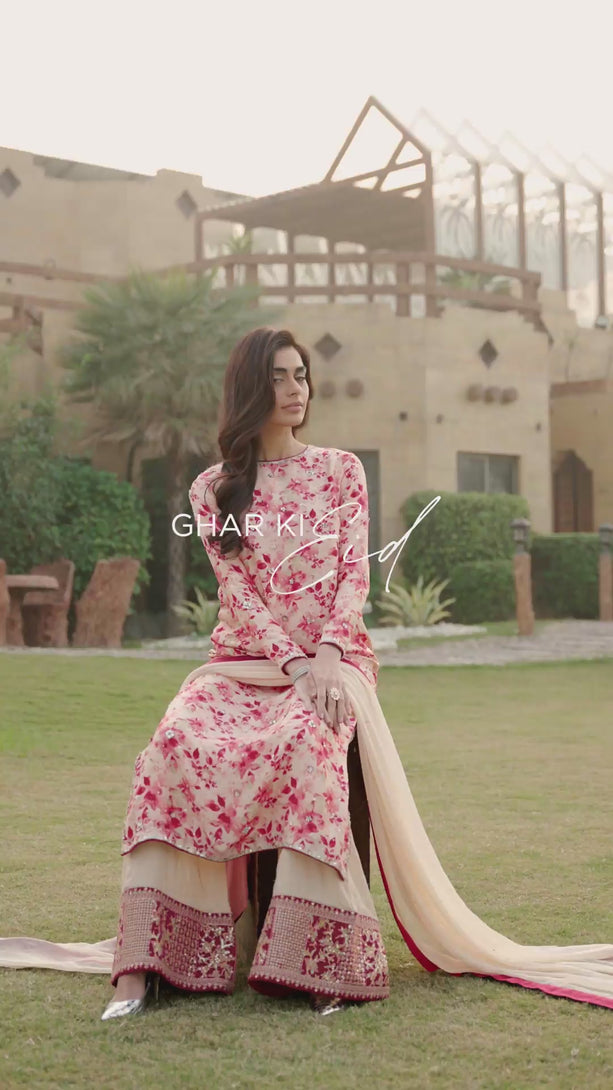 Digitally printed Shirt crafted from pure raw silk, adorned with a delicate all-over floral print. The shirt is further enhanced with subtle hand embellishments, adding a touch of artisanal detail while maintaining a soft, graceful aesthetic. It is paired with PK raw silk pants, designed to complement the look with their structured silhouette and richly detailed embroidered borders, lending a luxurious finish to the outfit. Completing the ensemble is a flowing chiffon dupatta, draped effortlessly to add lightness and movement, beautifully balancing the richness of the silk textures.