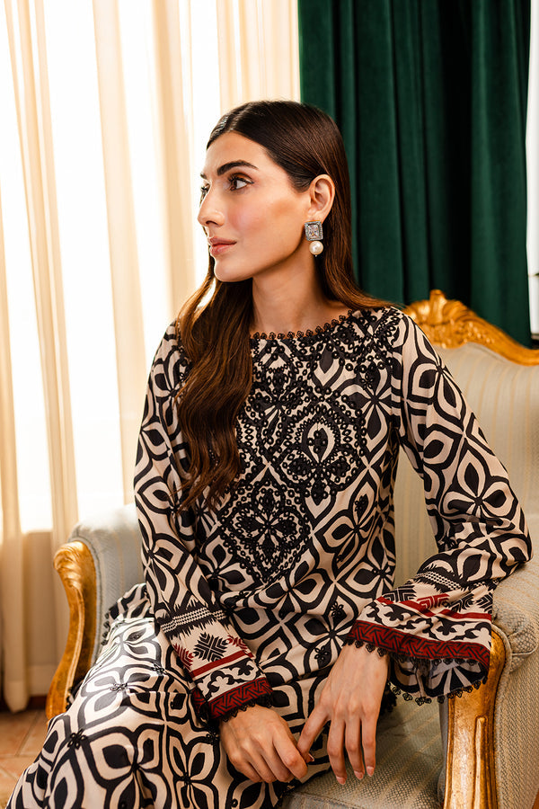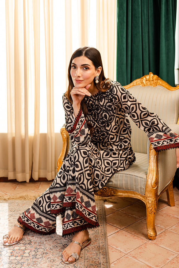 Printed and Embroidered black and beige chiken kari long shirt, paired with Plazo pants.