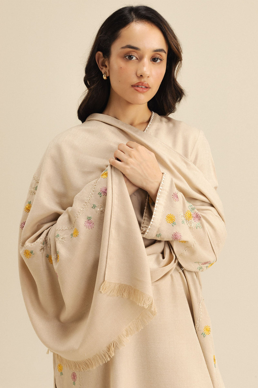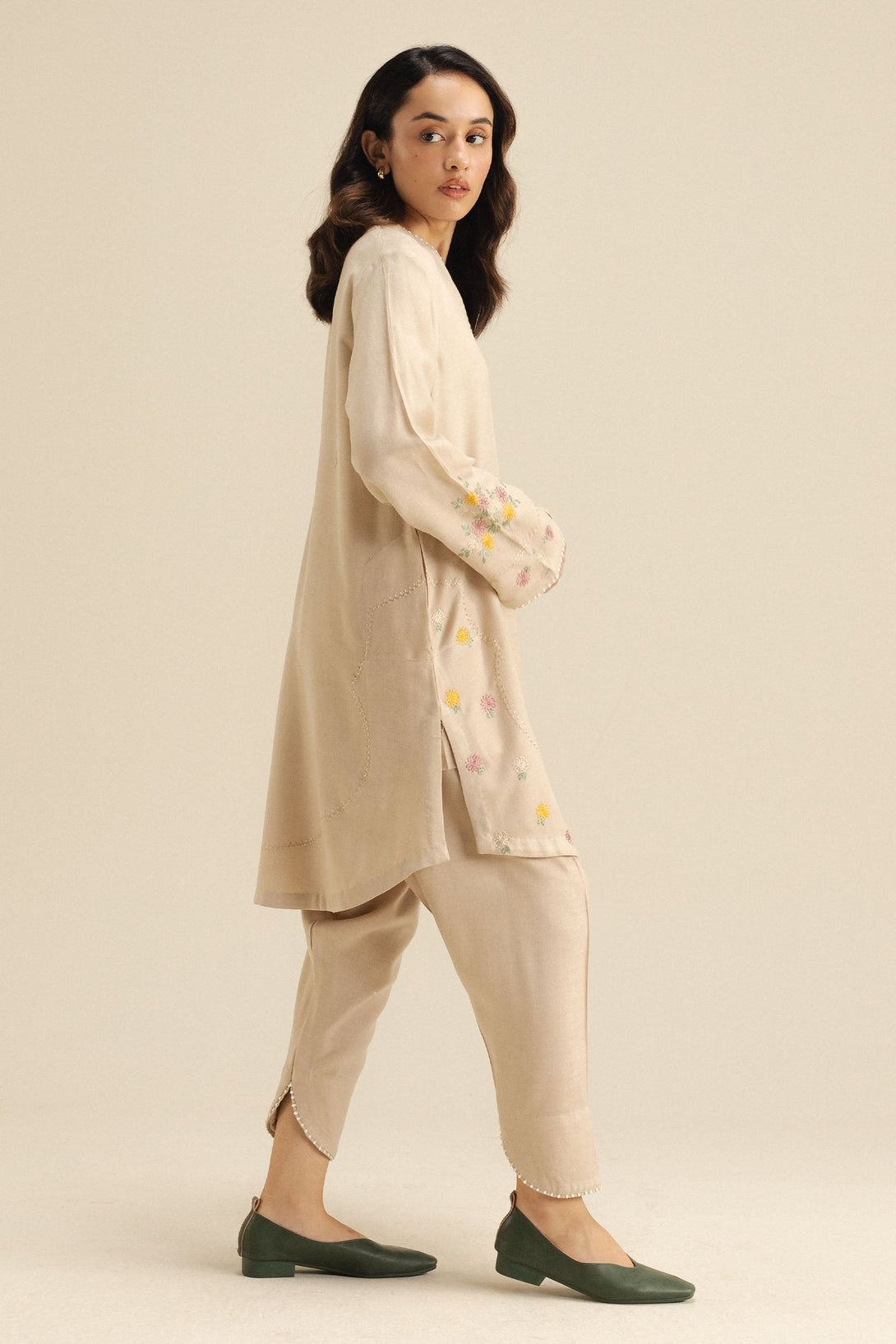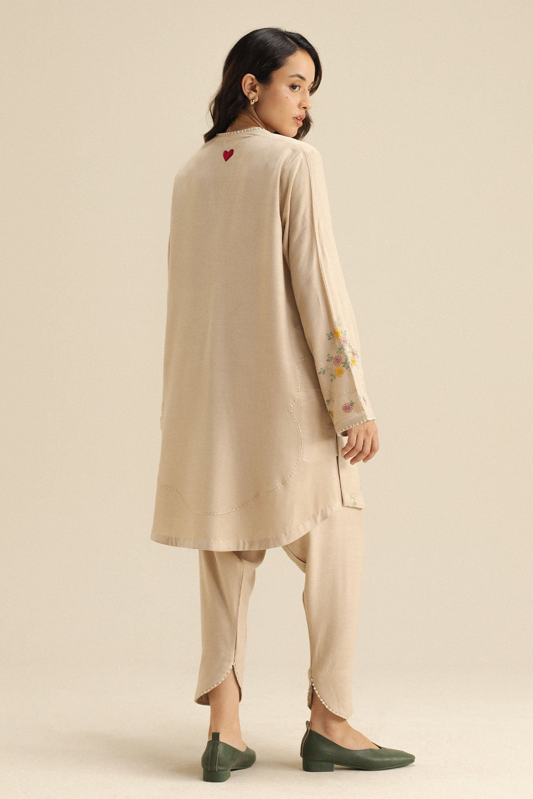 A beige wool peach outfit featuring intricate embroidery along the hem and sleeves for timeless elegance. It is paired with a matching trouser.