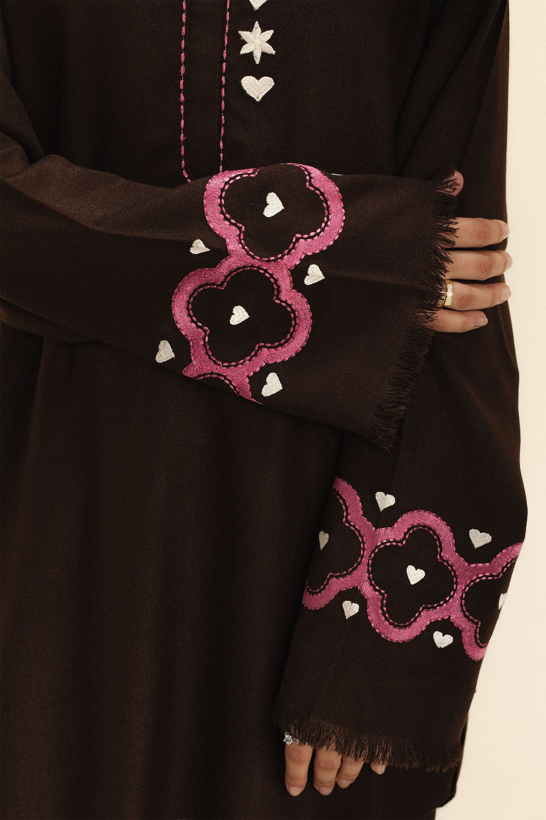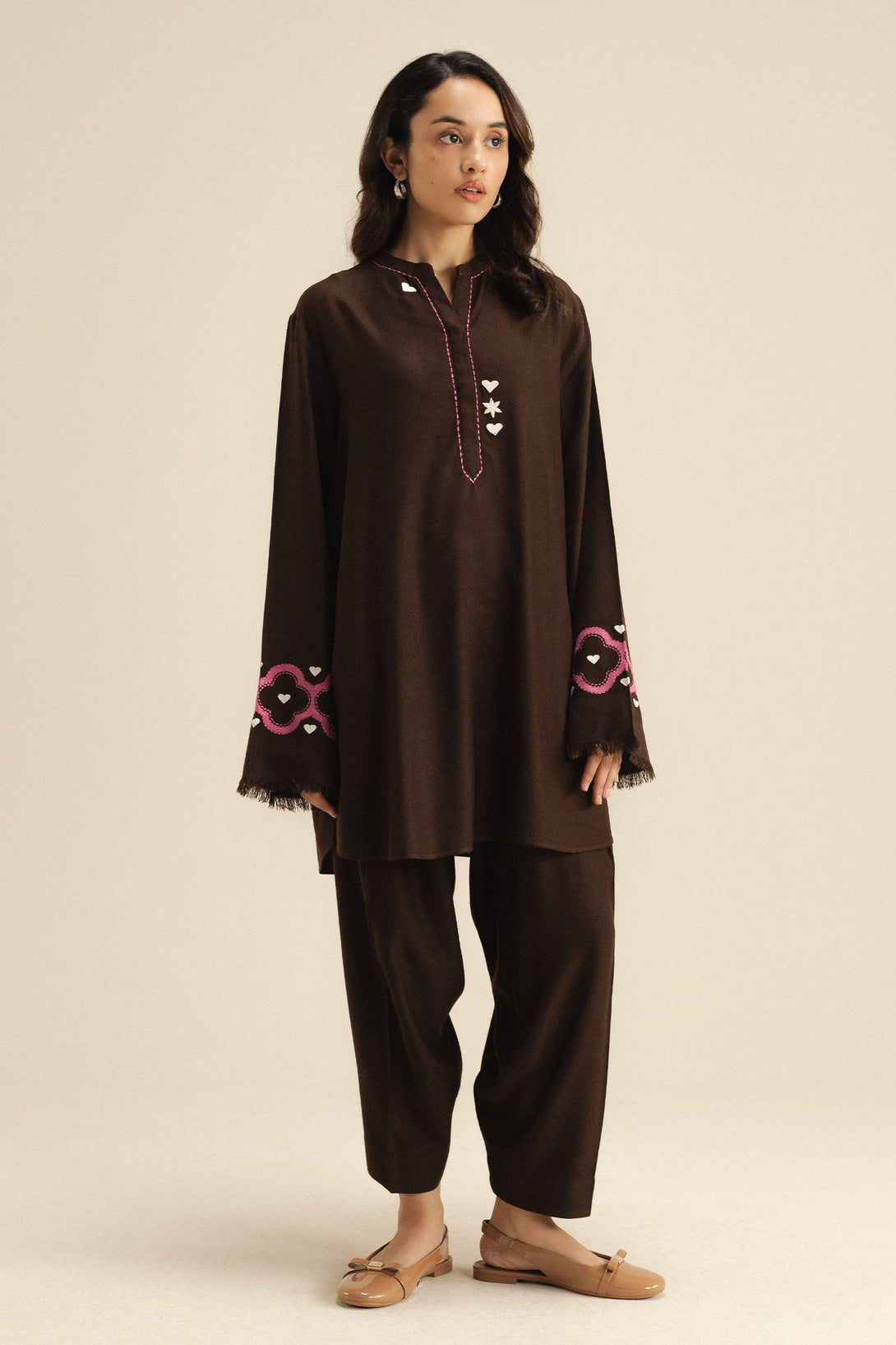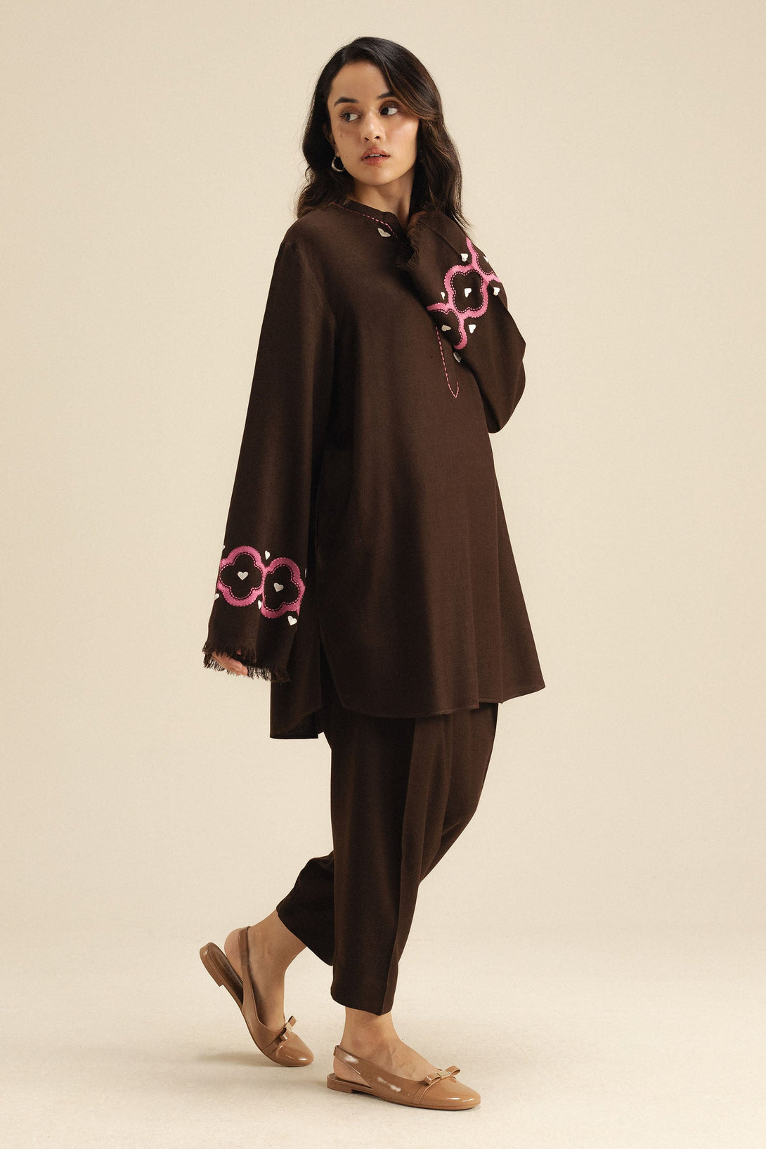 A brown wool peach short shirt and tapered shalwar ensemble accented with delicate pink and white embroidery on the sleeves for a soft, feminine touch.