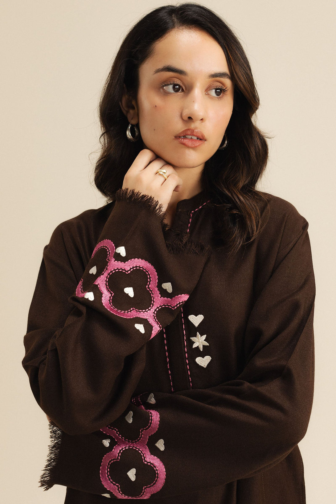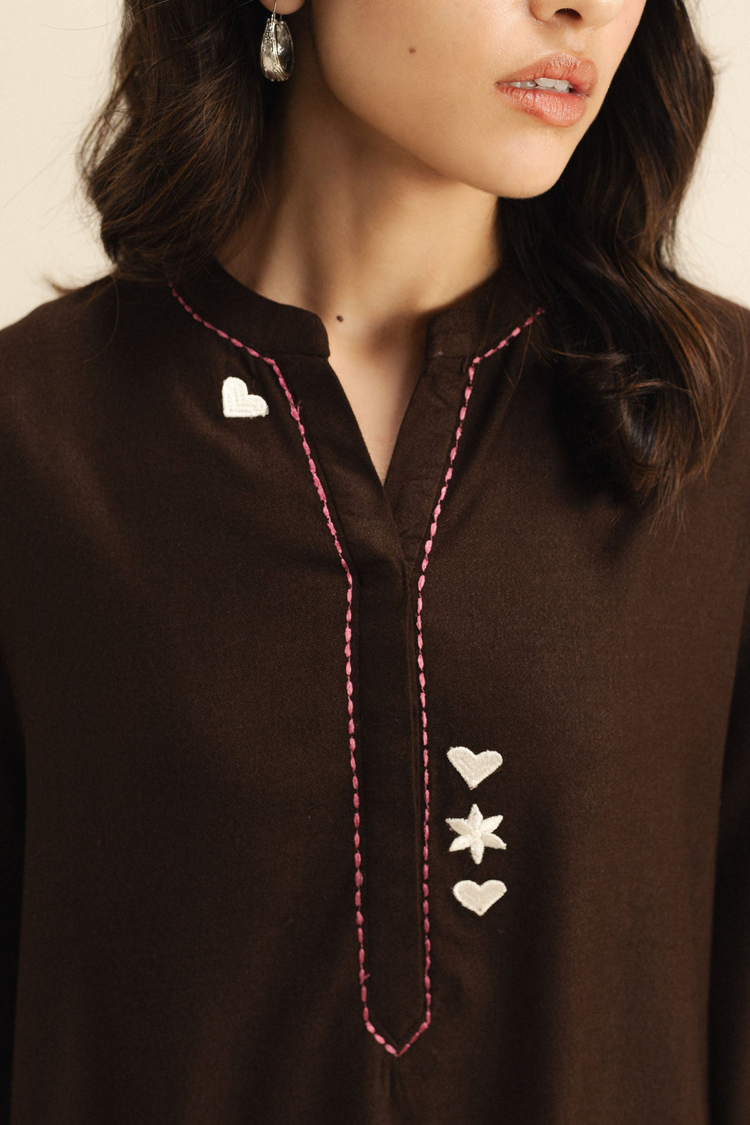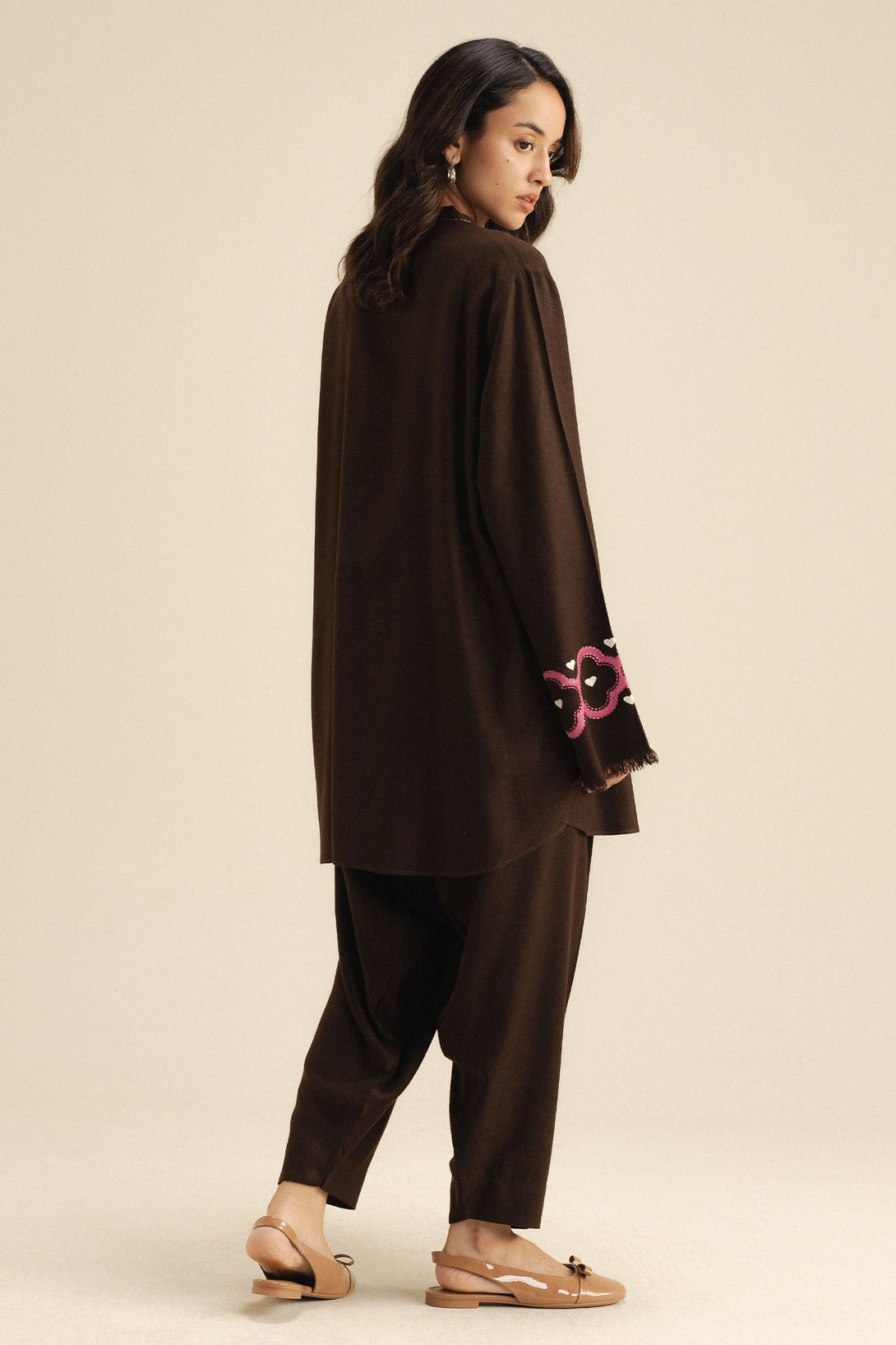 A brown wool peach short shirt and tapered shalwar ensemble accented with delicate pink and white embroidery on the sleeves for a soft, feminine touch.