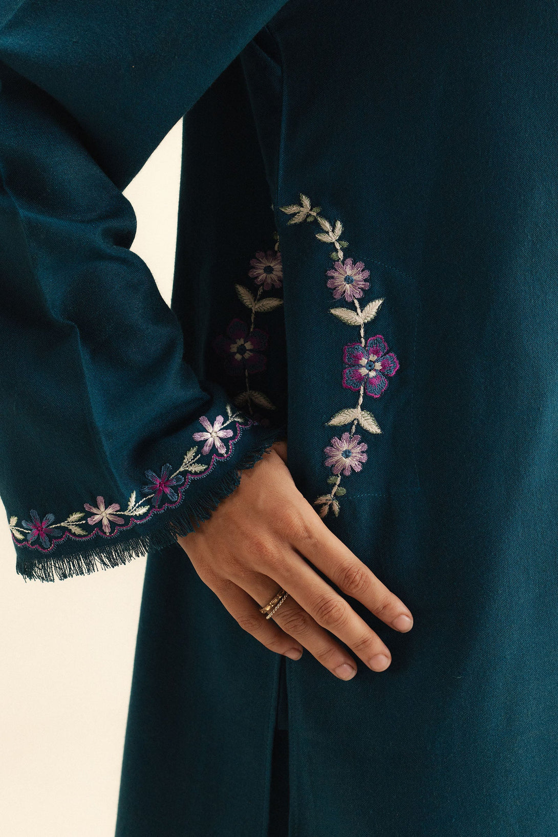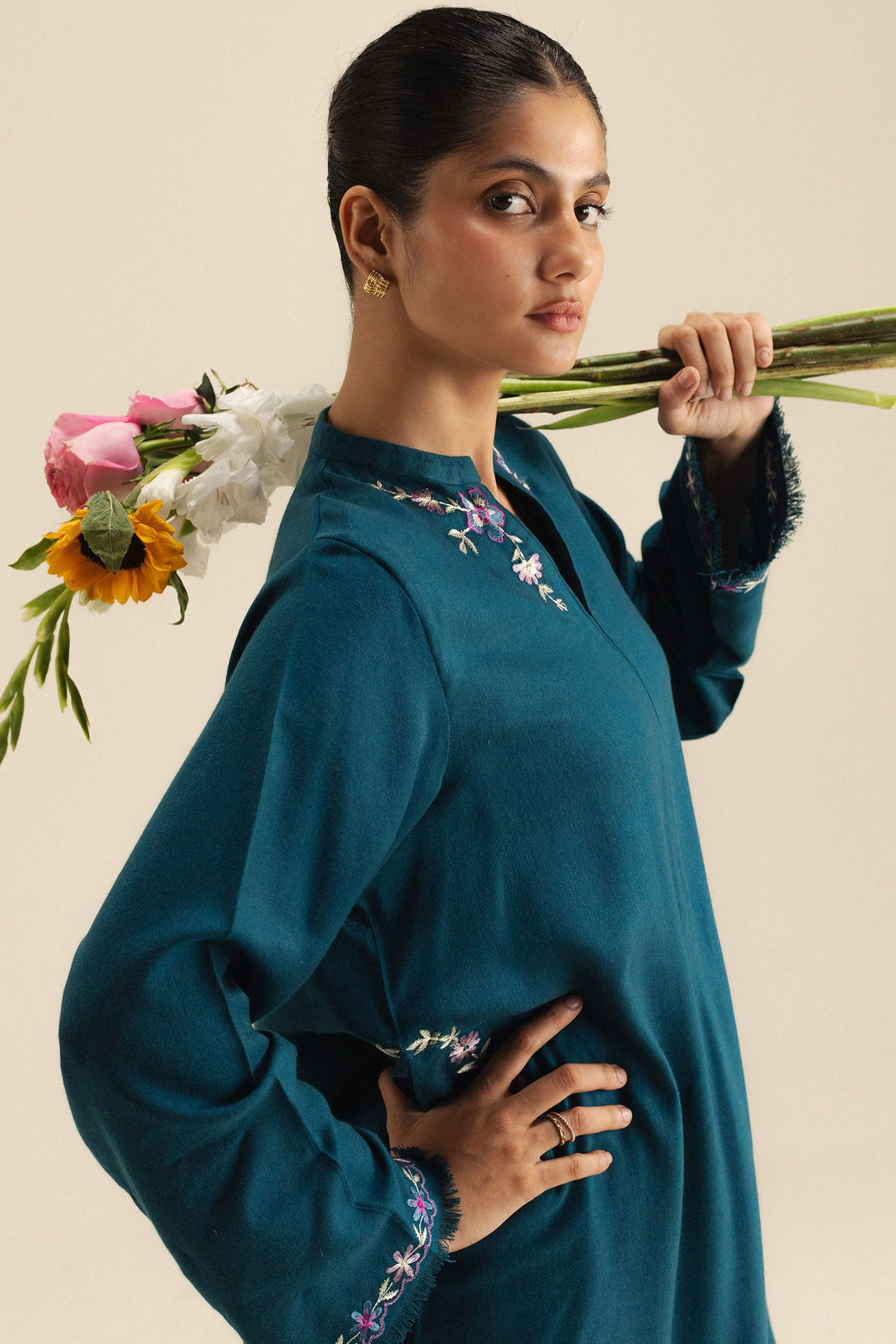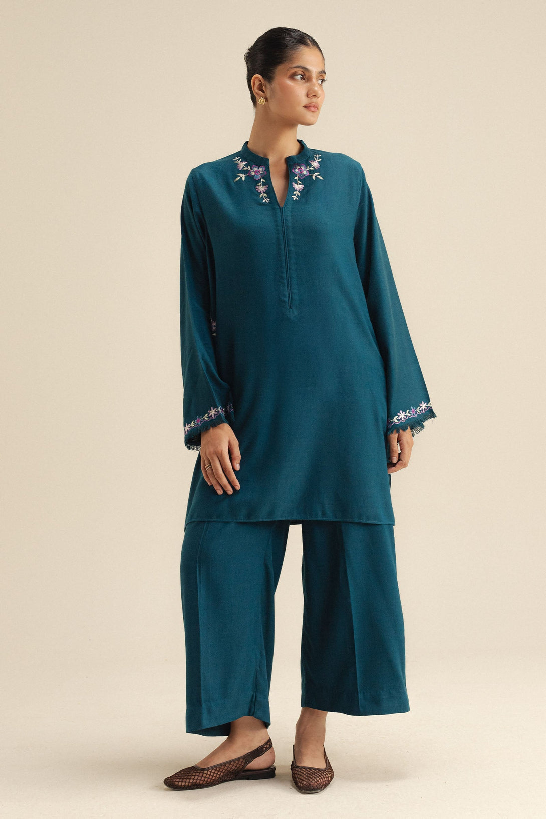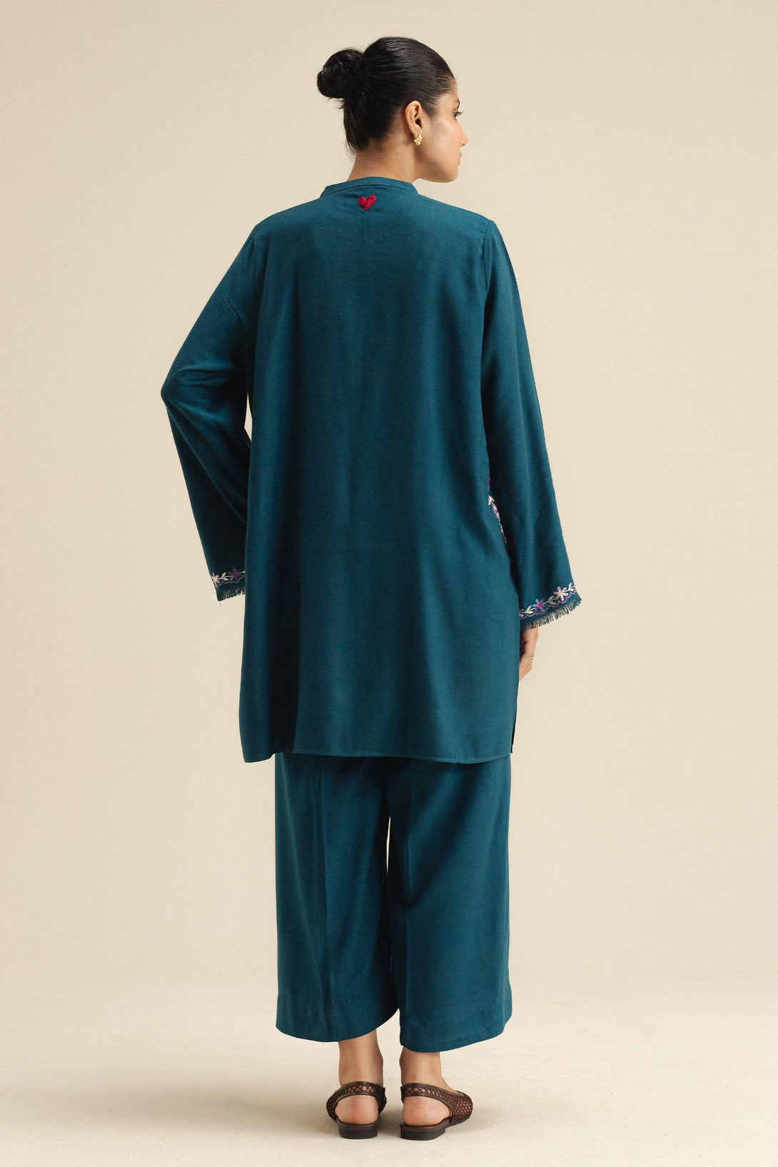 A teal wool peach short shirt paired with culottes, featuring intricate embroidery for an effortlessly elegant statement.