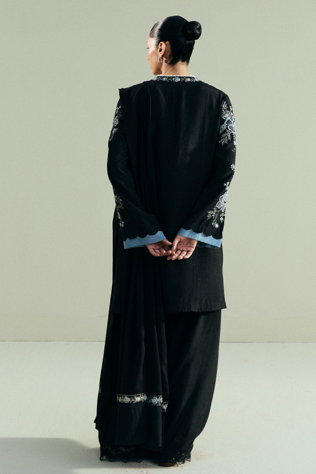 This classic black kurta is adorned with embroidery on the front, highlighted with a pop of color in the stitching for a subtle yet striking detail. It is paired with a traditional farshi shalwar that adds volume and grace. The look is completed with a tonal dupatta featuring delicate embroidery, tying the outfit together with understated elegance.