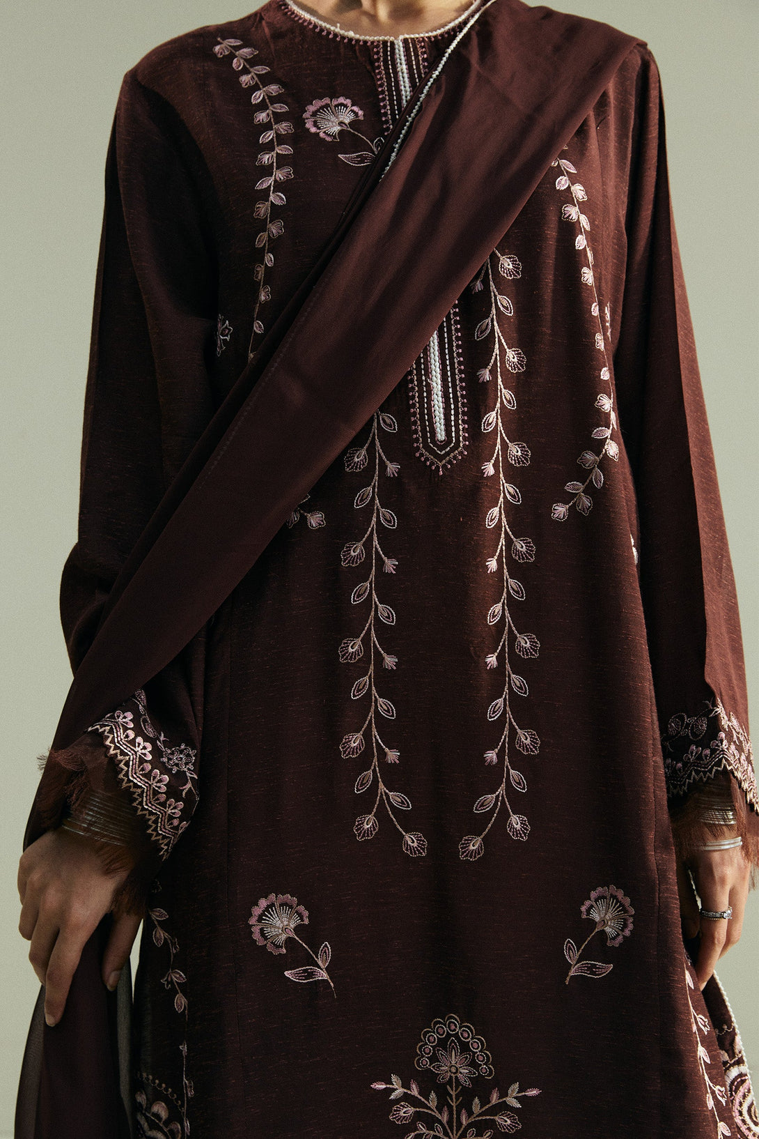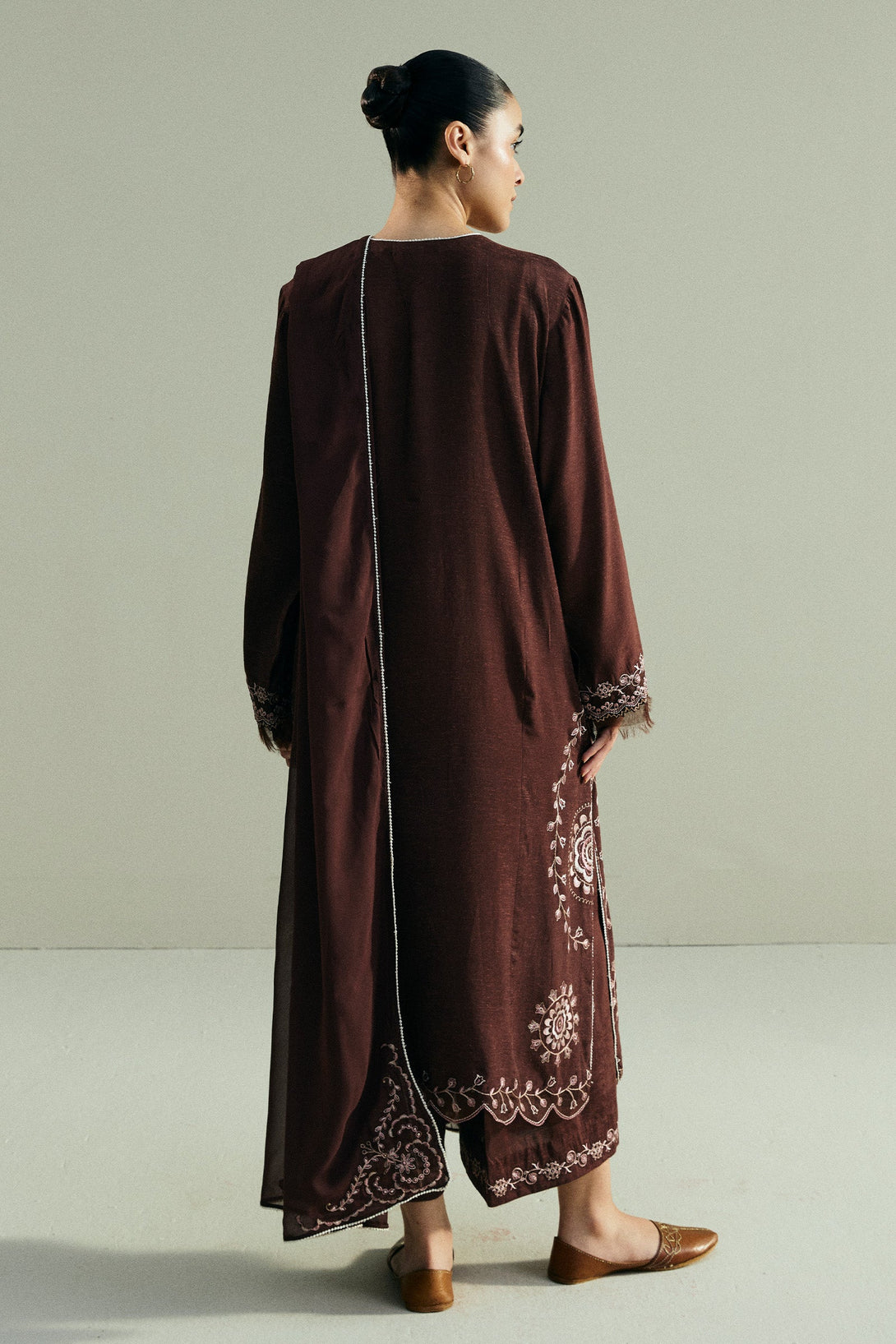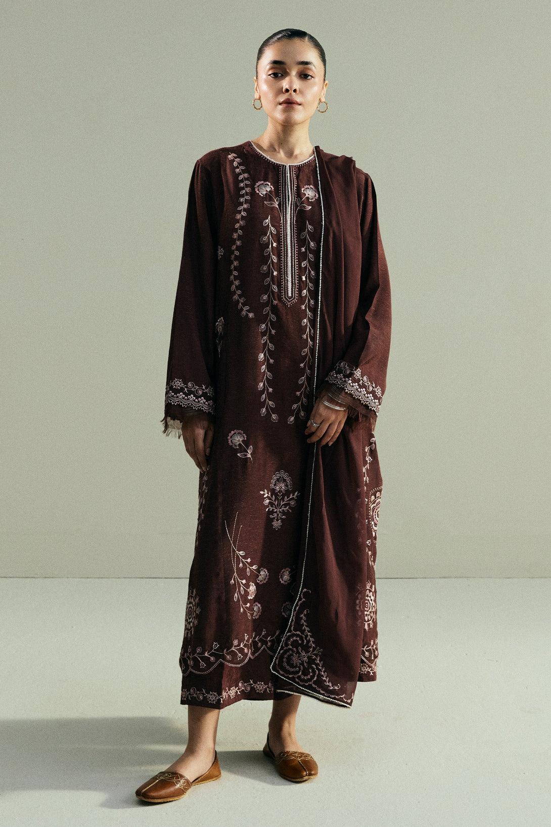 This classic long brown shirt is adorned with intricate all-over embroidery that highlights its refined craftsmanship. It is paired with embroidered culottes, adding a touch of ease and modernity to the silhouette. A minimal embroidered dupatta completes the look, keeping the focus on understated elegance.