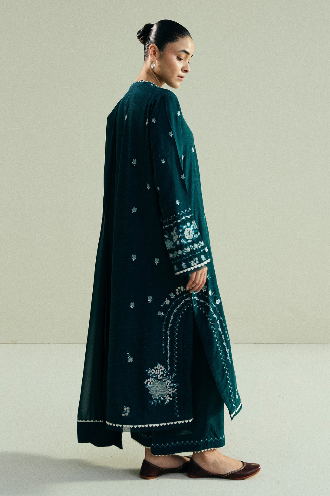 This classic navy blue long kurta is accented with bold cross-stitch embroidery in striking hues of teal and white, bringing a vivid contrast to its clean silhouette. It is paired with tonal culottes that keep the look balanced and refined. A matching dupatta completes the outfit, adding cohesion and understated elegance.