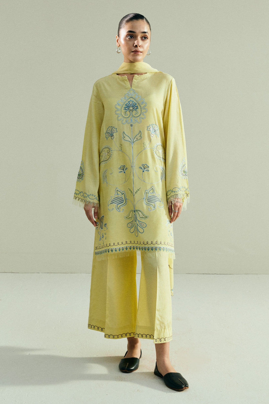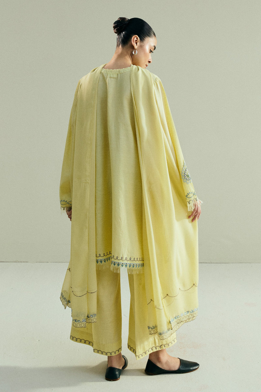 This butter-yellow short loose-fit kurta is adorned with intricate embroidery across the front, bringing charm and detail to its breezy silhouette. It is paired with embroidered culottes that add a touch of ease and refinement. A matching dupatta completes the look, creating a soft and graceful finish.