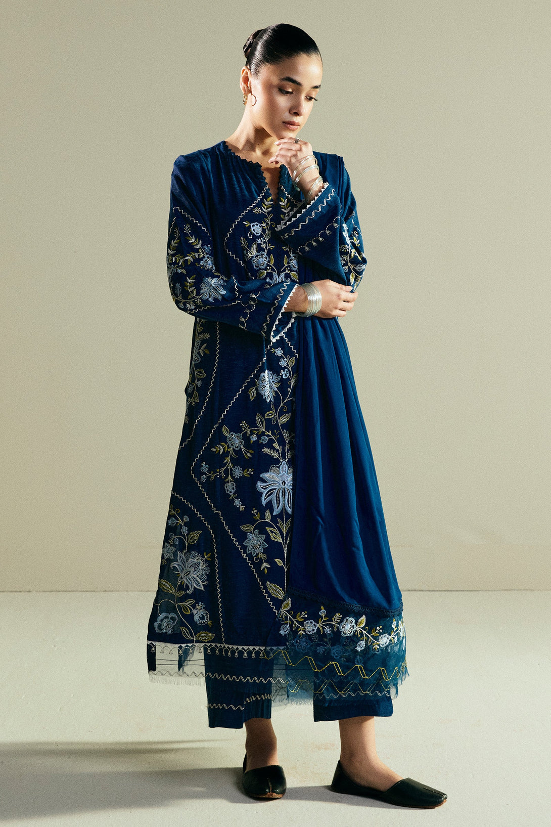 This long mid-night blue loose-fit kurta is decorated with intricate kantha embroidery on the front and sleeves, showcasing fine craftsmanship and detail. It is paired with tonal cropped straight pants featuring delicate embroidery for a subtle finish. A matching dupatta completes the look, tying the pieces together with understated elegance.