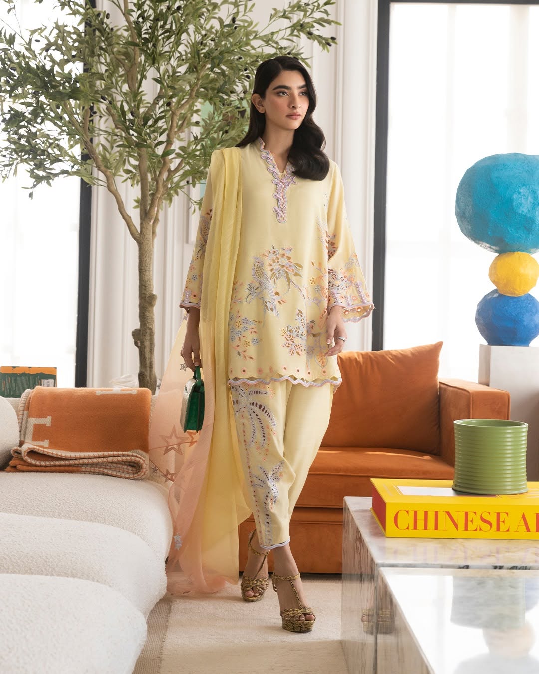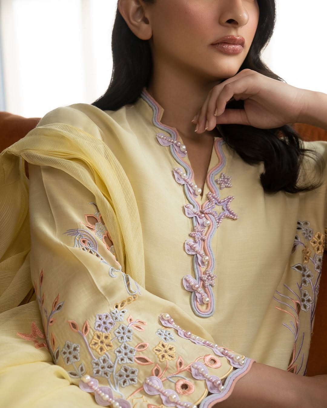 Description: A two-piece yellow silhouette in raw silk, paired with a dupatta, perfect for festive evening celebrations.