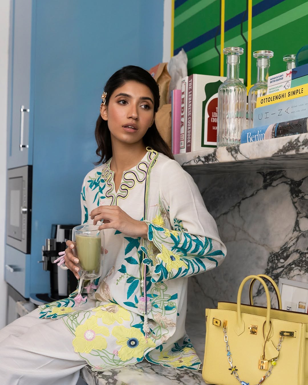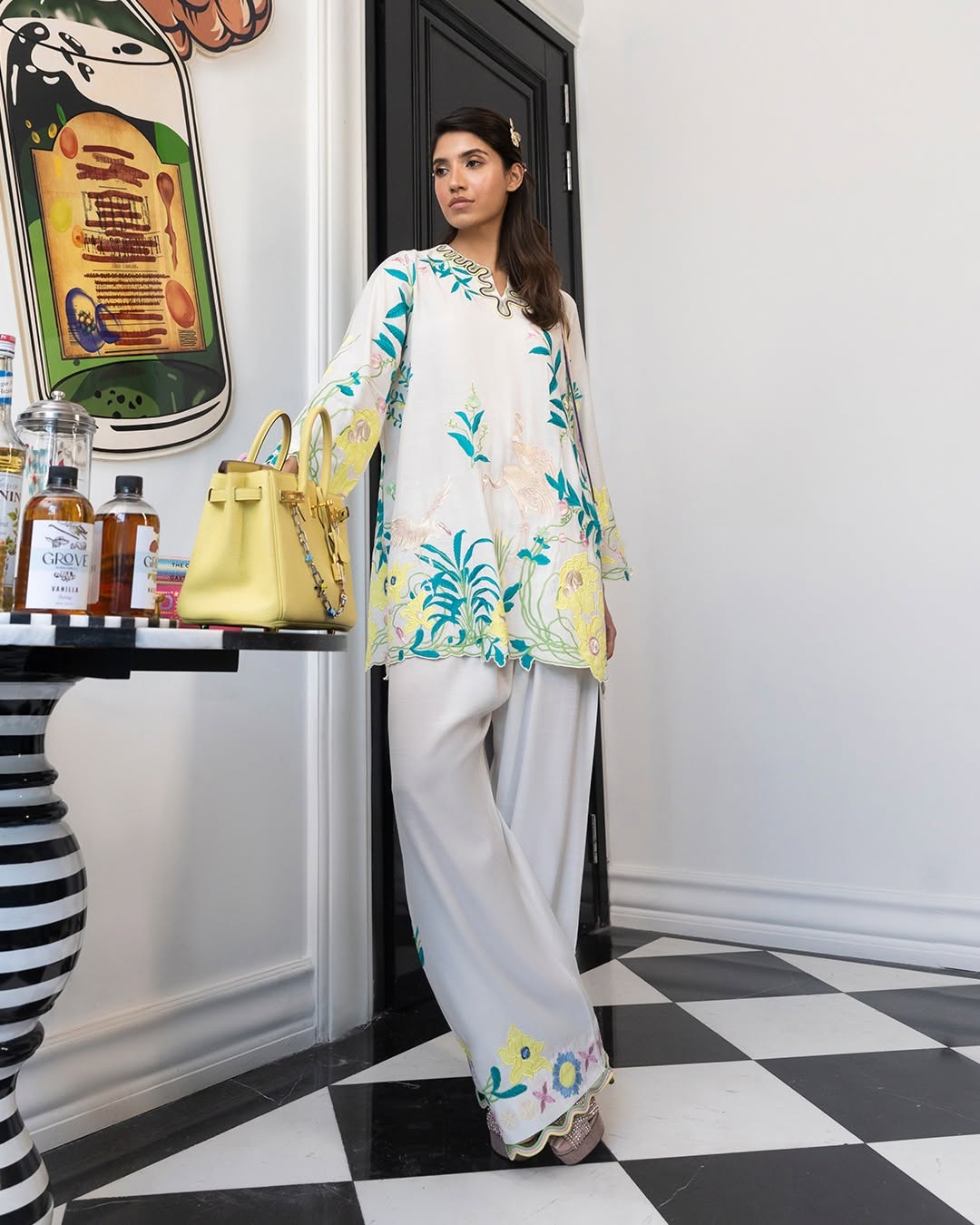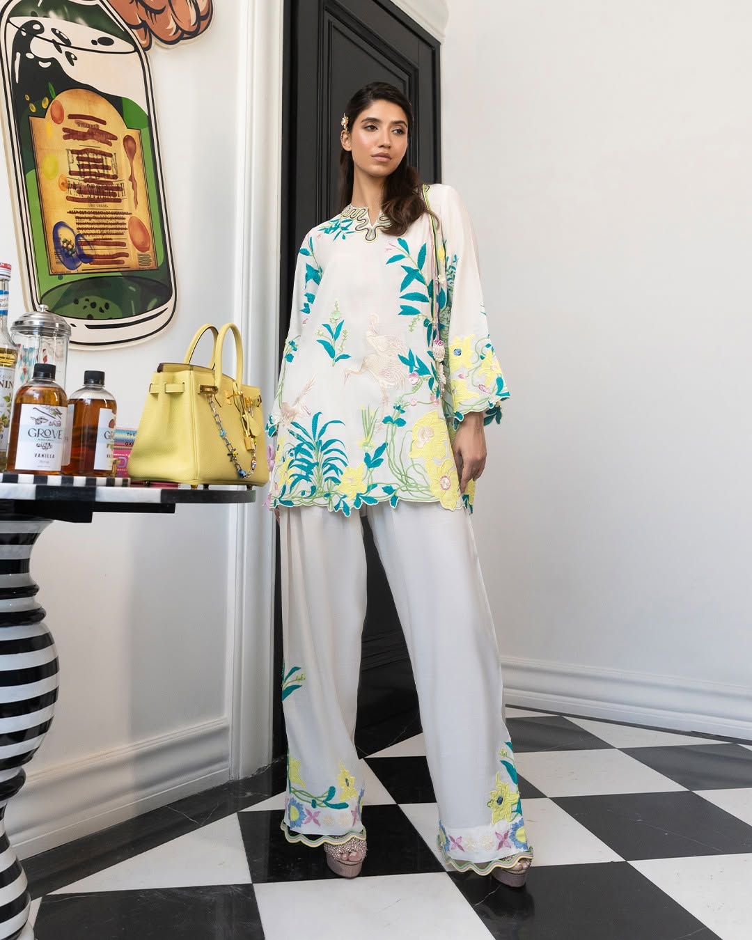 Description: A two-piece off-white outfit in raw silk with contrast embroidery  understated and refined for all gatherings.