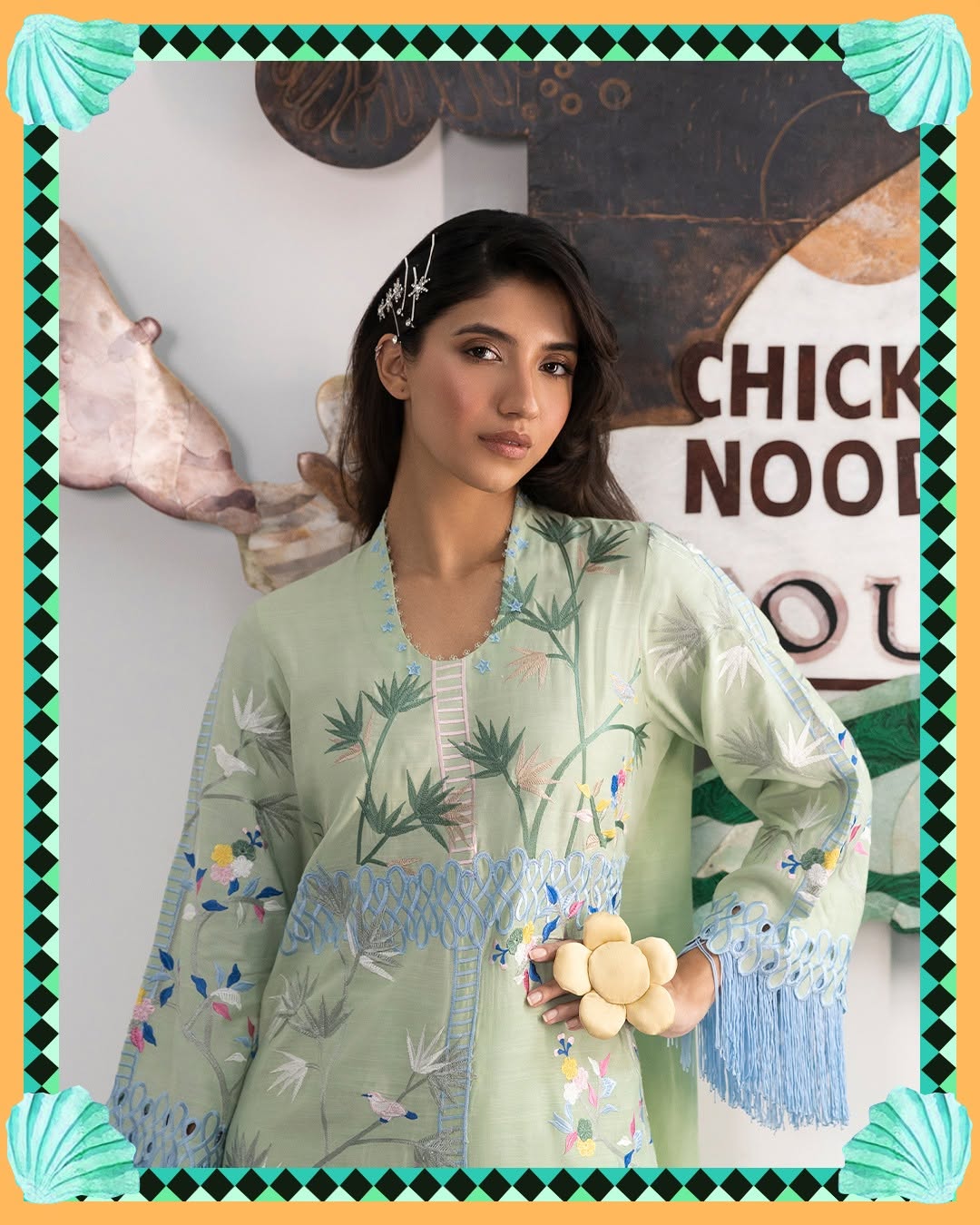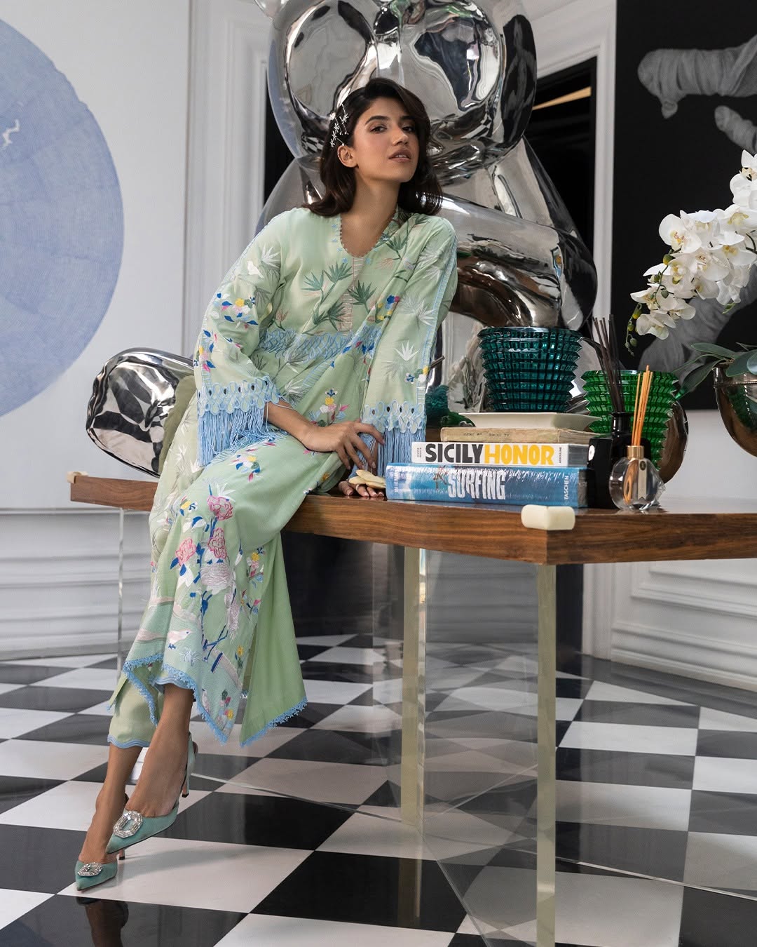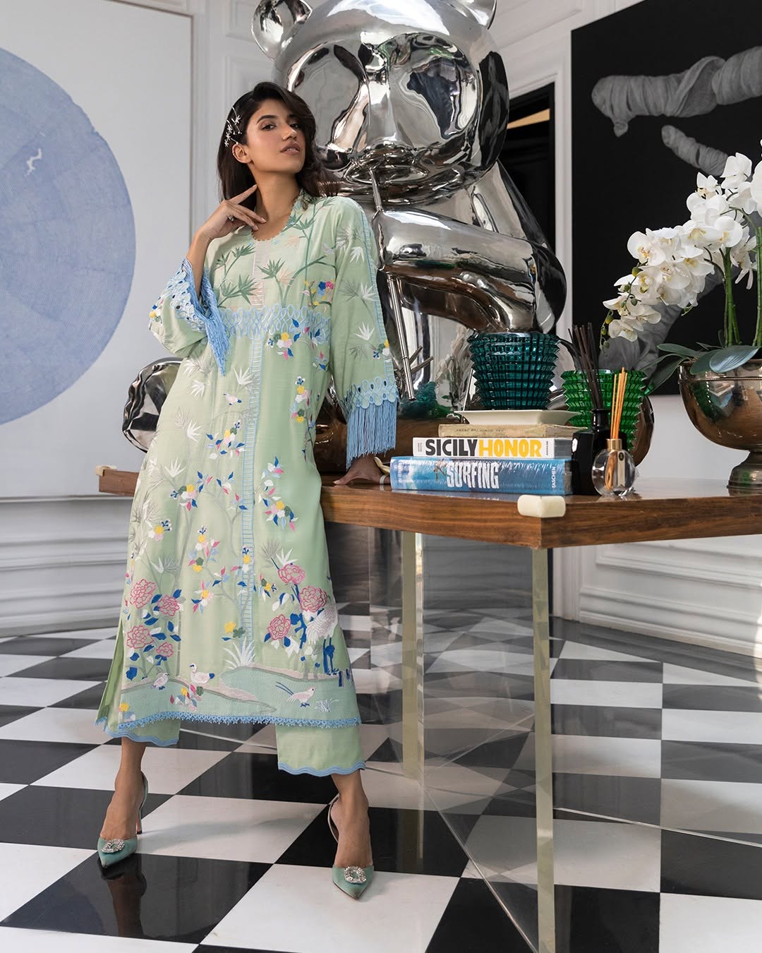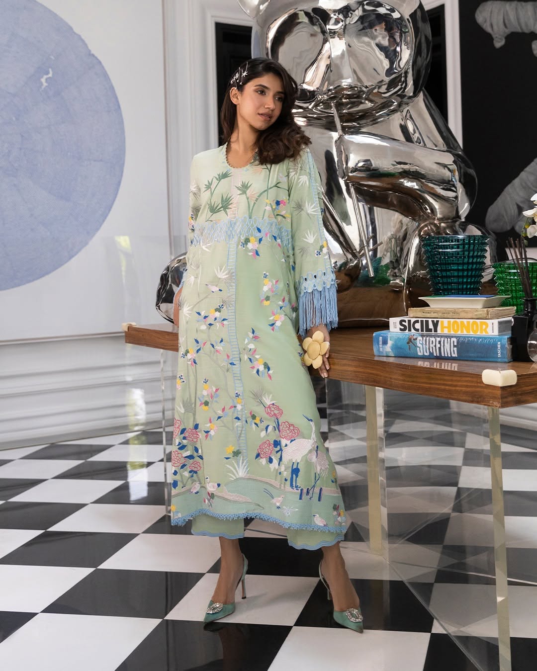Description: Pista green raw silk outfit with fluid movement  fresh, graceful, and quietly striking.