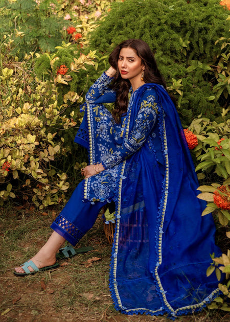 "Dalia - There’s a summer wardrobe, and then there’s a Vibrant, energetic and versatile wardrobe for the Siraa woman . Engineered floral landscape over a deep toned cobalt blue base paired with an organza karandi dupatta accentuated with a scatter of chikankari inspired detailing and contrasting delicate borders."