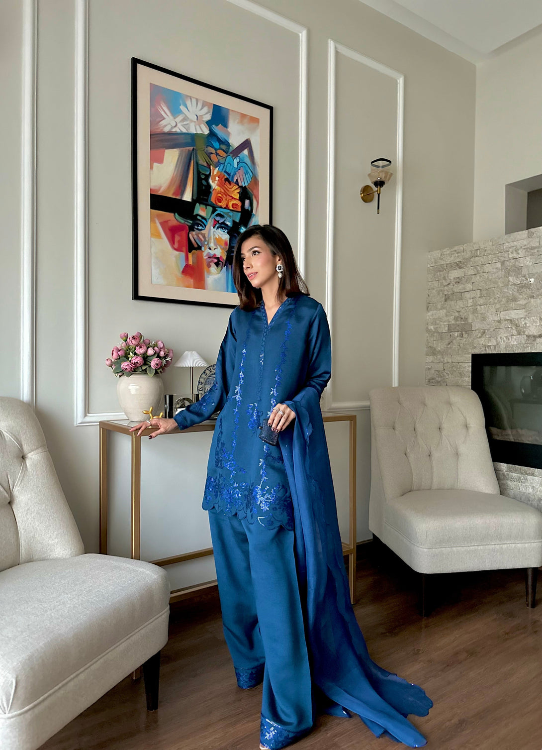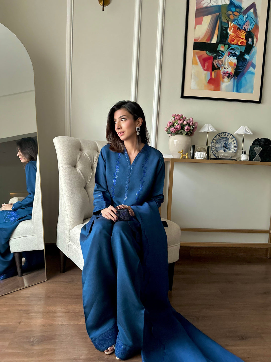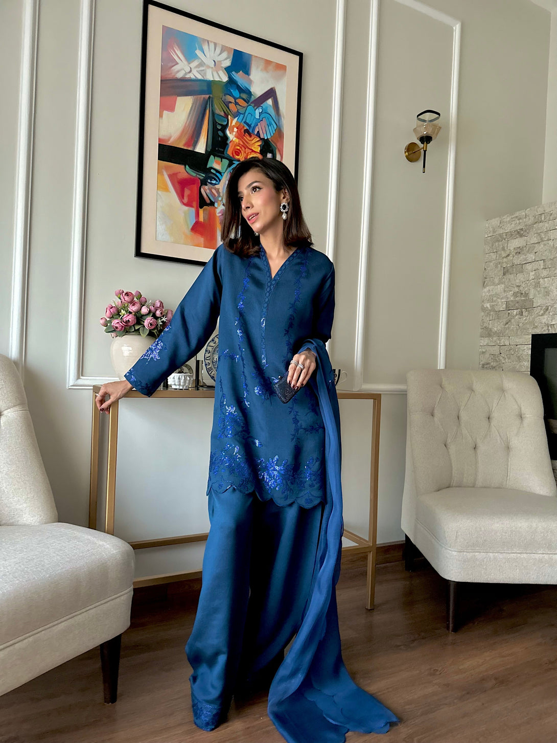 Immerse yourself in the midnight allure of Celestia — a three-piece stitched ensemble designed for modern elegance and timeless sophistication. Crafted in a deep ocean-blue hue, the shirt features intricate sequin embroidery that glimmers subtly with every movement, paired with wide-leg pants finished with a delicate sequin border for a coordinated, elevated look.