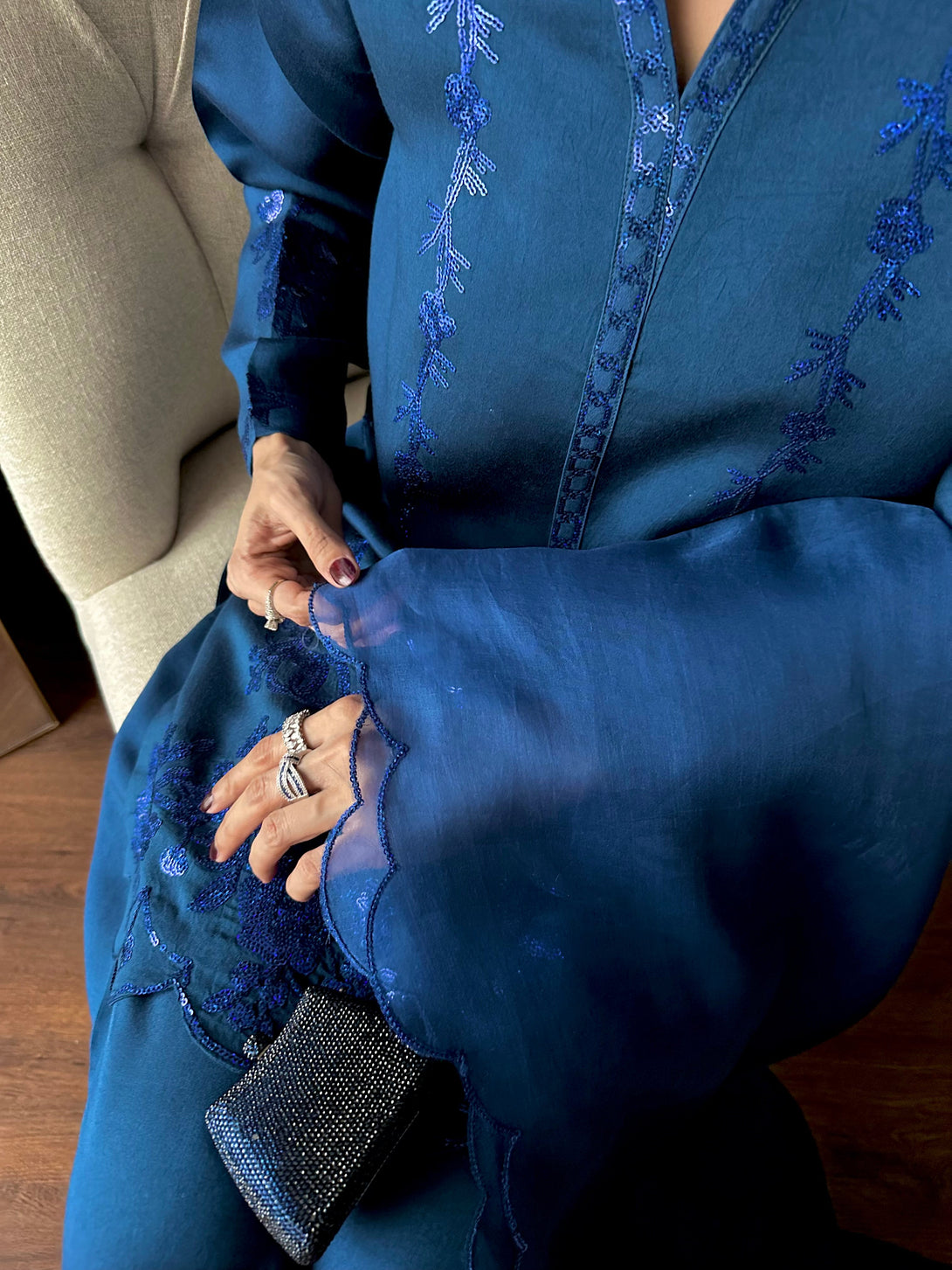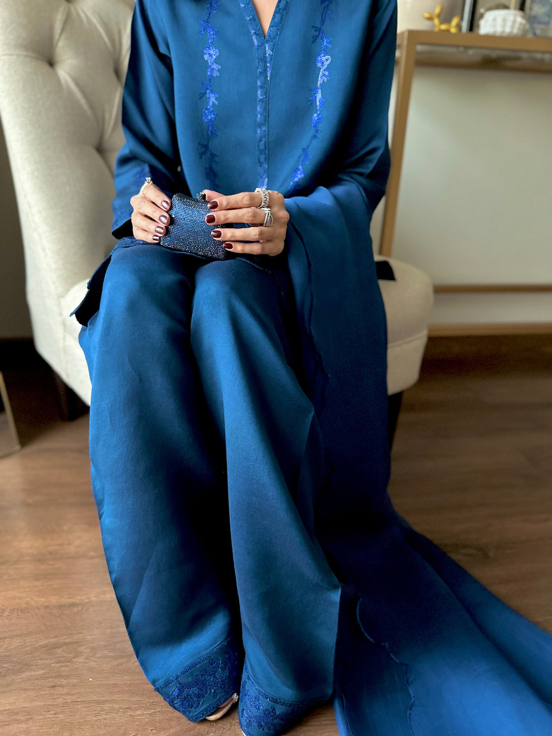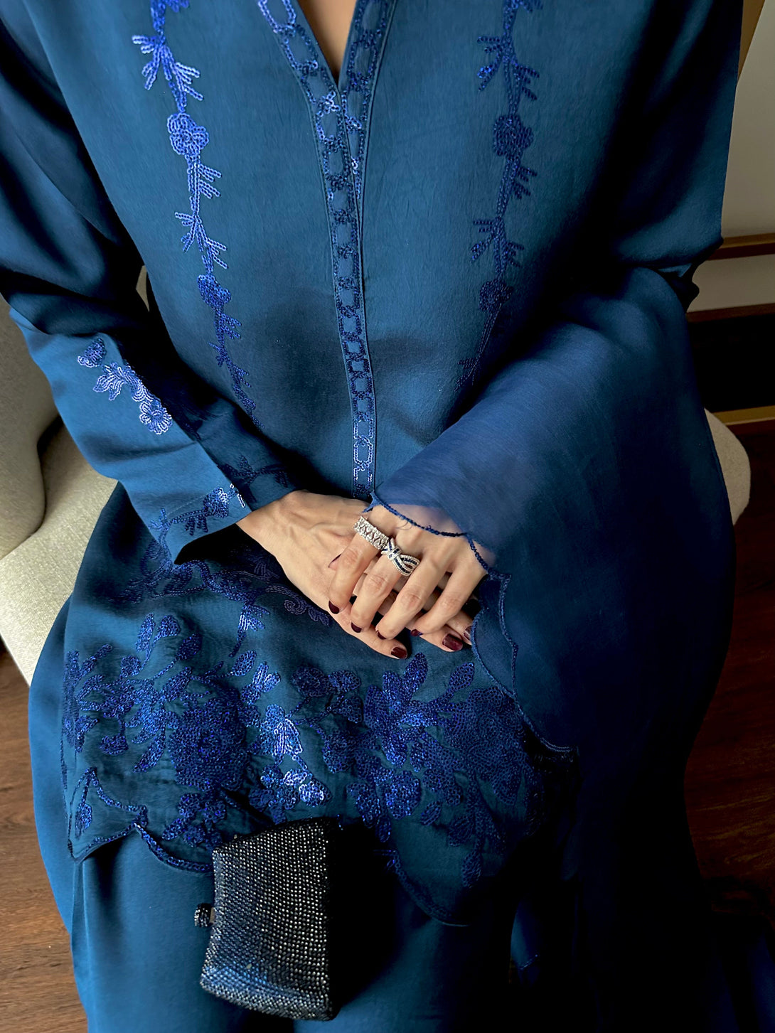 Immerse yourself in the midnight allure of Celestia — a three-piece stitched ensemble designed for modern elegance and timeless sophistication. Crafted in a deep ocean-blue hue, the shirt features intricate sequin embroidery that glimmers subtly with every movement, paired with wide-leg pants finished with a delicate sequin border for a coordinated, elevated look.