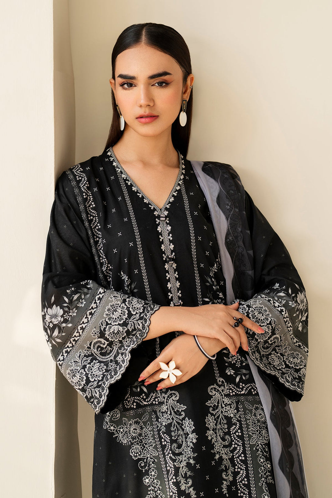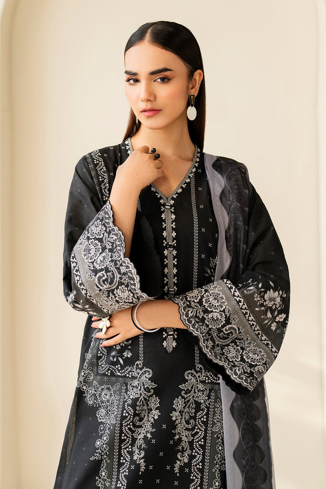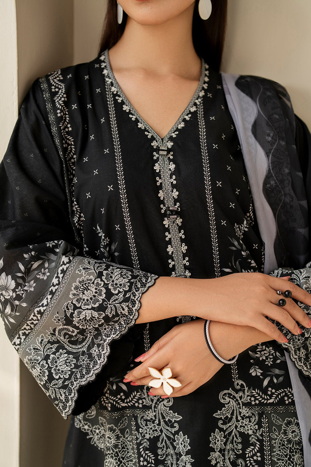 This beautiful set includes a digitally printed lawn shirt adorned with an embroidered organza neckline patch and detailed front and back borders. It is paired with a dyed cotton trouser and a soft, digitally printed chiffon dupatta, creating a perfect mix of elegance and comfort.