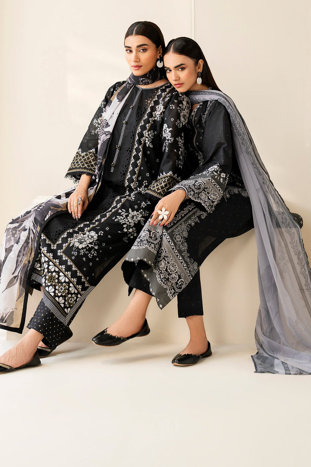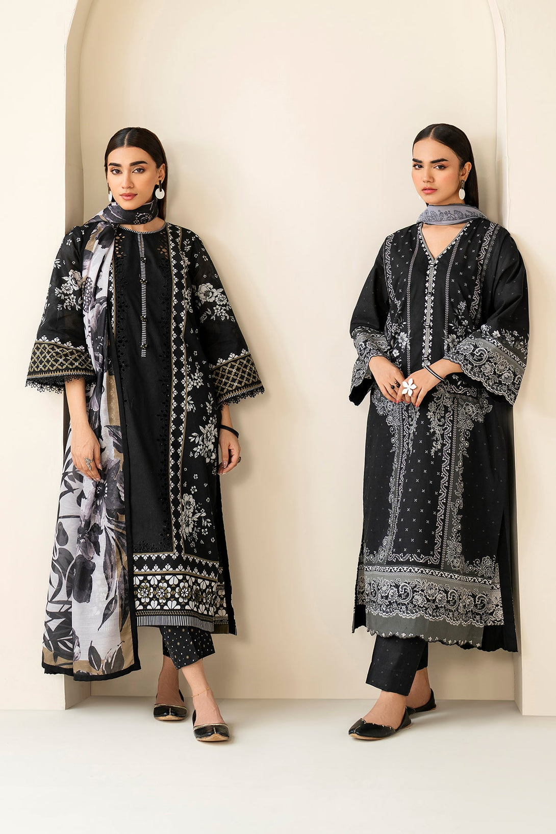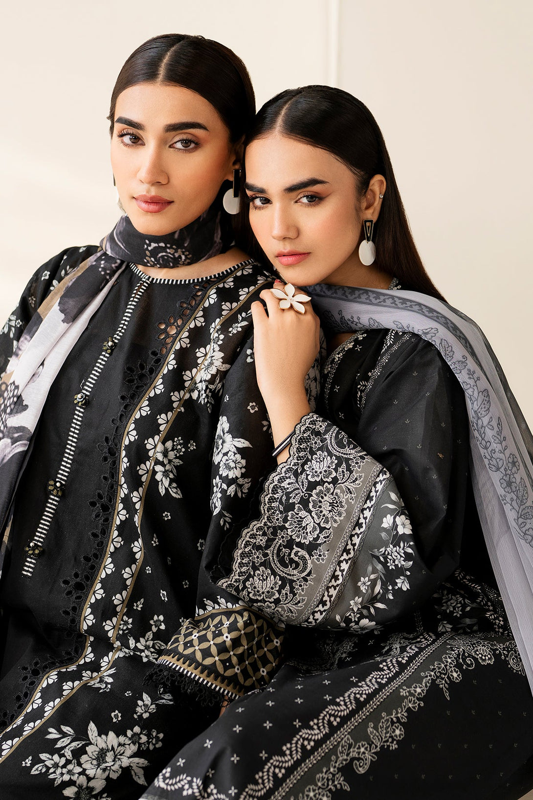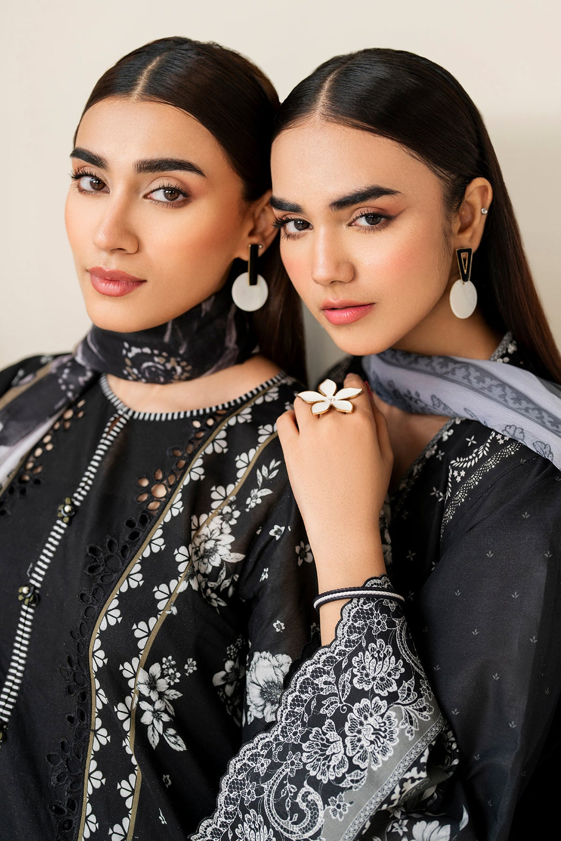 This beautiful set includes a digitally printed lawn shirt adorned with an embroidered organza neckline patch and detailed front and back borders. It is paired with a dyed cotton trouser and a soft, digitally printed chiffon dupatta, creating a perfect mix of elegance and comfort.