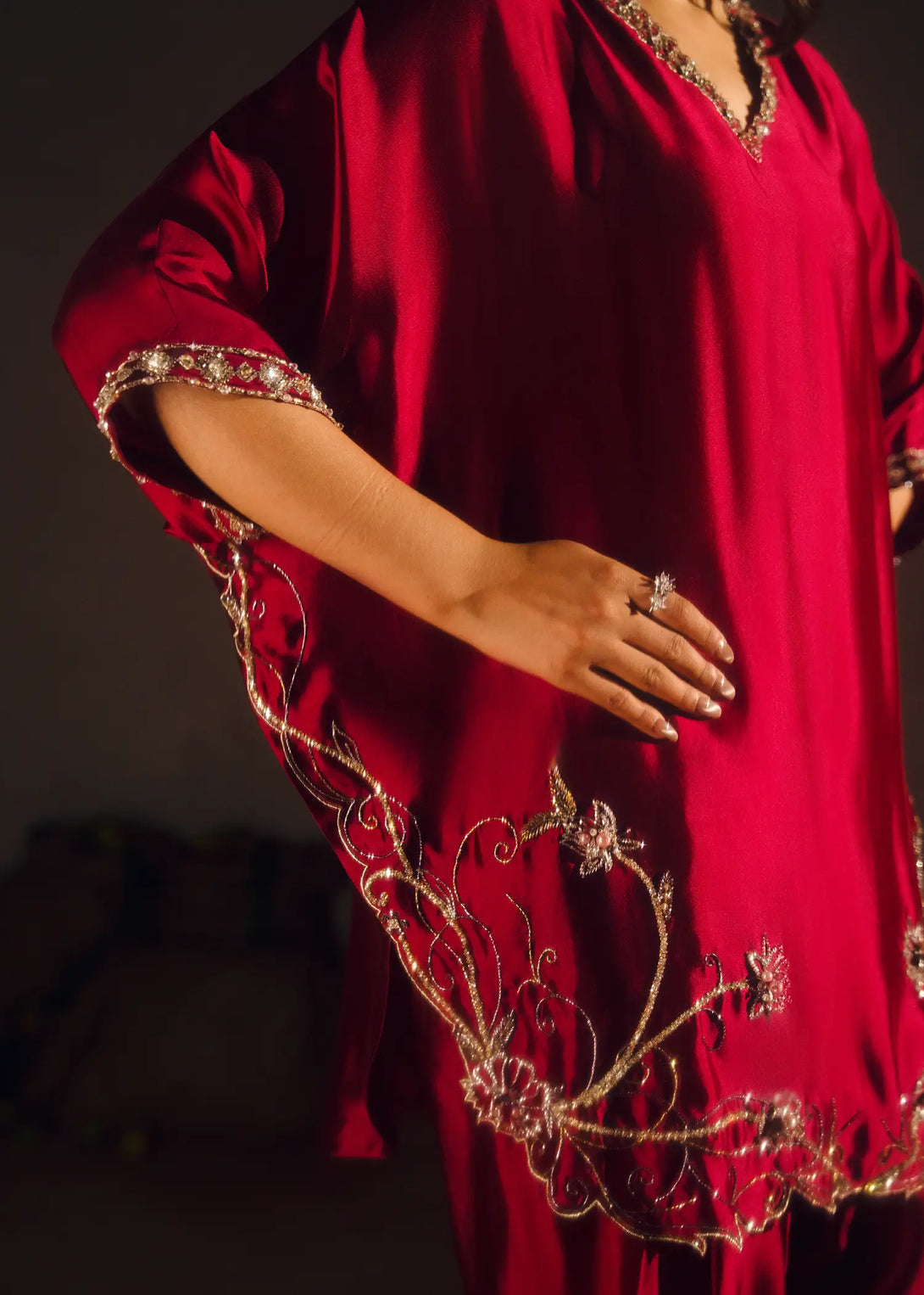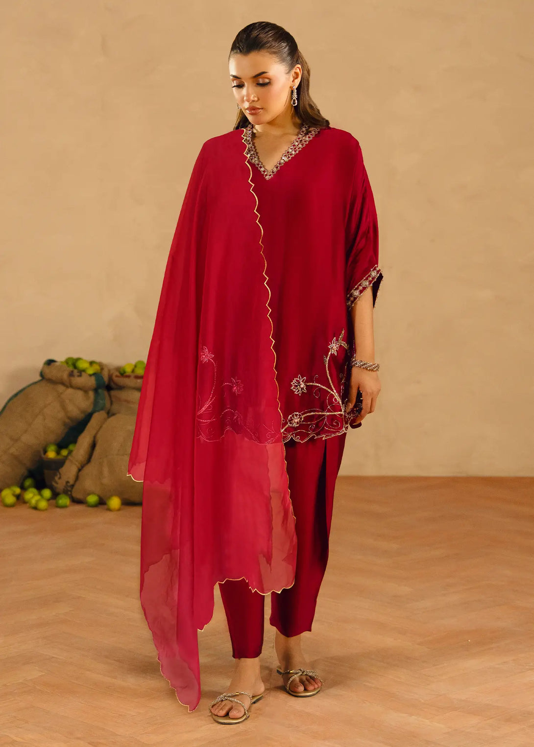 The Elara silk shirt boasts elegant bat sleeves beautifully adorned with Swarovskis and intricate dabka and cut daana embellishments, showcasing exquisite craftsmanship. The skinny shalwar adds a modern touch, offering grace. Paired with a scalloped dupatta that adds a layer of refinement, this ensemble is perfect for making an elegant impression at any event.