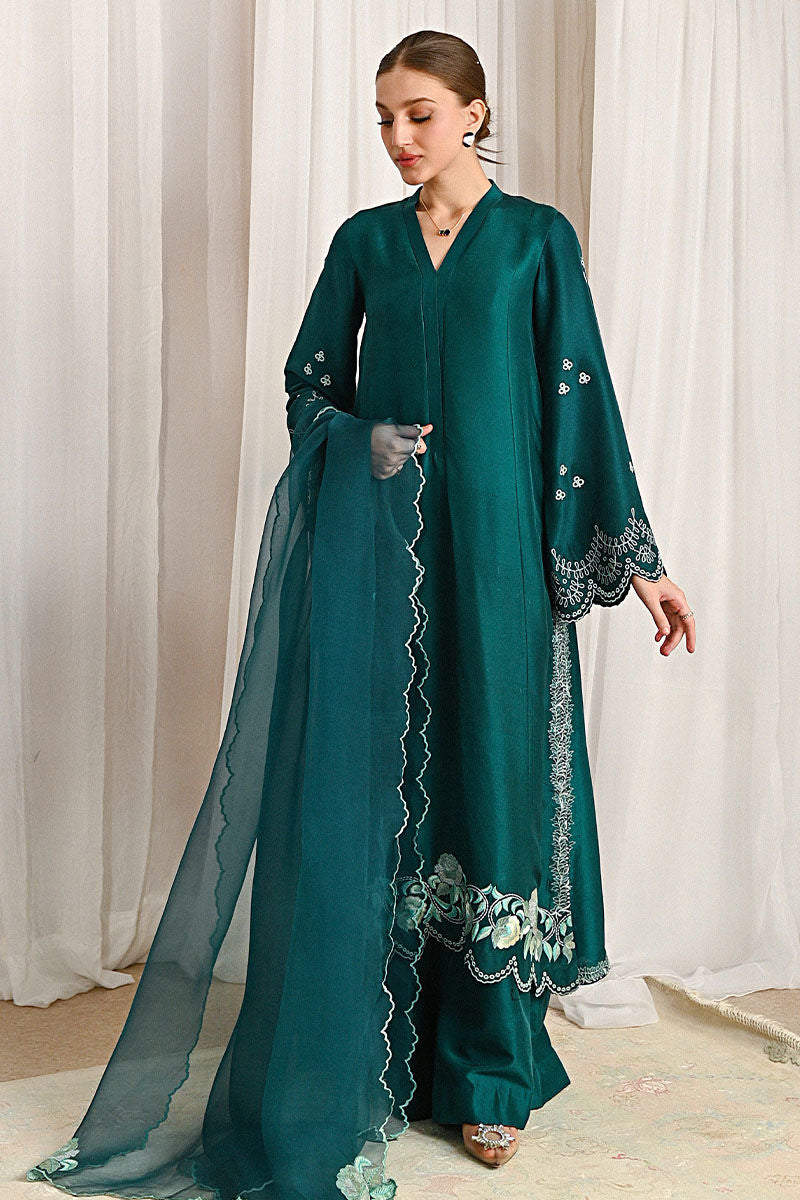 The Elodie ensemble features an emerald green raw silk long shirt with intricate embroidery and scalloped details on the hem and sleeves. Paired with matching plazo pants, the outfit is completed by a luxurious organza dupatta with delicate embroidery and cutwork.