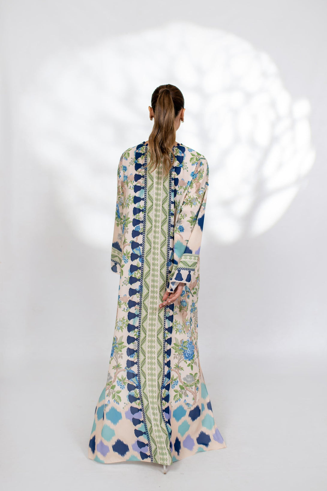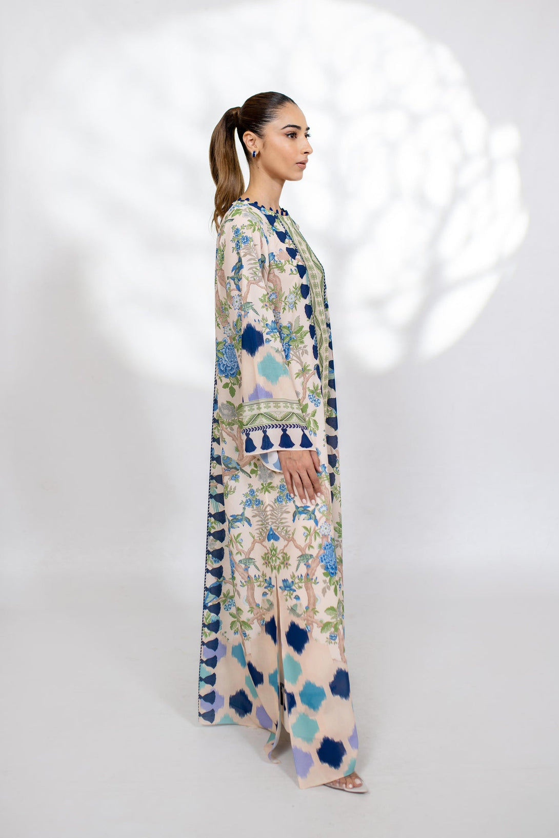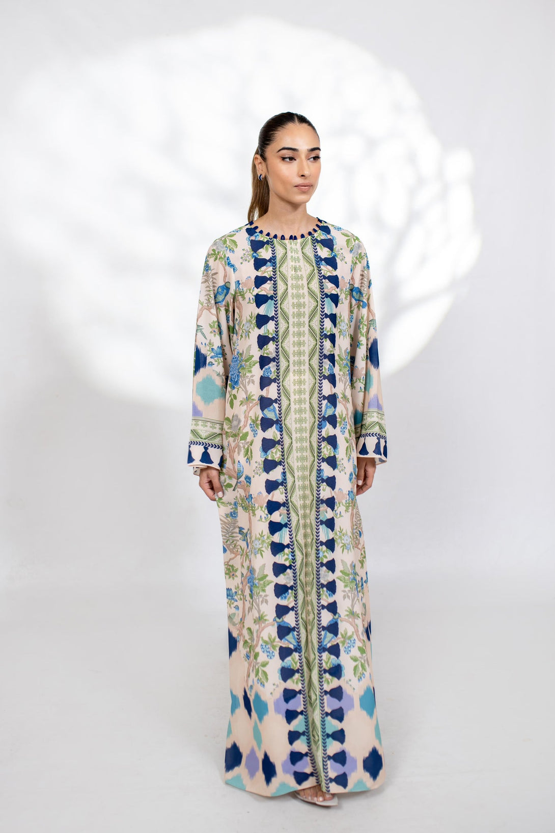 A printed relaxed fit kaftan in a non see through grip gorgette fabric.