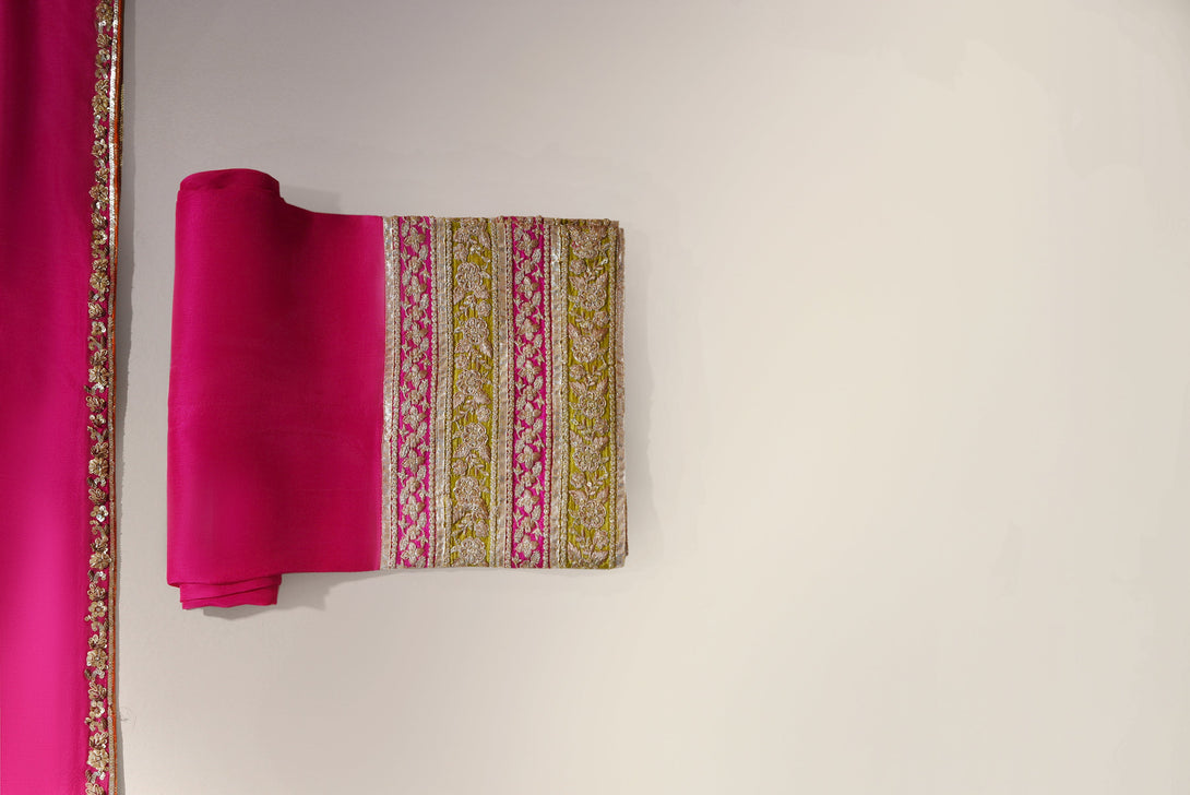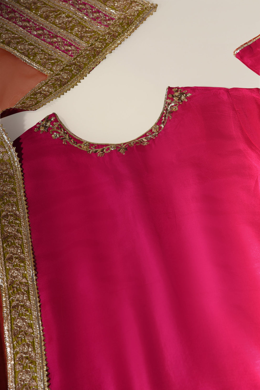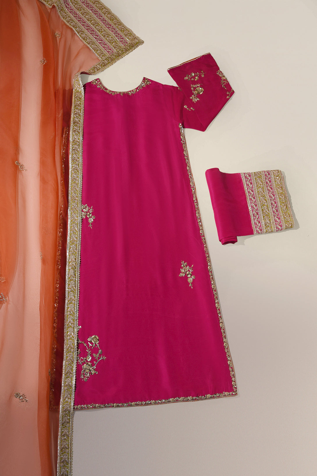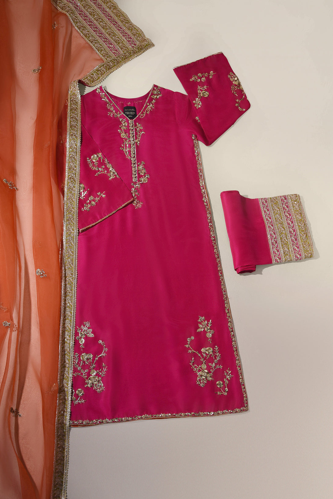 An alluring three piece on pure raw silk in an ethereal shade of fuschia pink, heavily embellished with ada work of dabka, sequins, naqshi and crystals, in a long kameez silhoutte making this beautiful design a must have this festive season. Paired with a contrasting pure organza dupatta featuring Chatapatti borders and matching pure raw silk trousers as seen. The length of the long kameez is 48 inches.